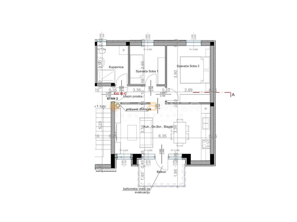 For sale is a beautiful three-bedroom apartment in a modern new building in Valdebek, Pula. The apartment is located on the ground floor of a small residential building in a quiet location, with a living area of approximately 55m2 and consists of an entrance hall (3.84m2), 2 bedrooms (10.12m2 and 6.99m2), a living room, a dining room and a kitchen (26.62m2) with access to a terrace and a bathroom of 4.85m2. The apartment also has a garden of 45m2.