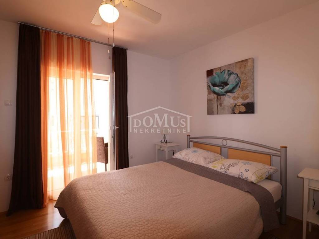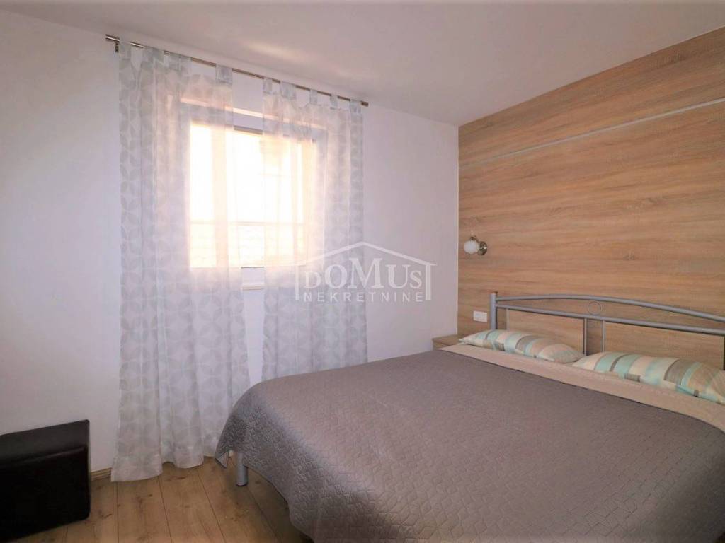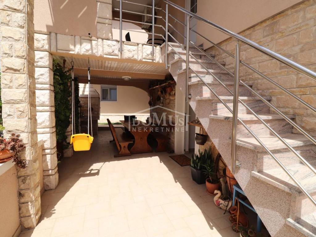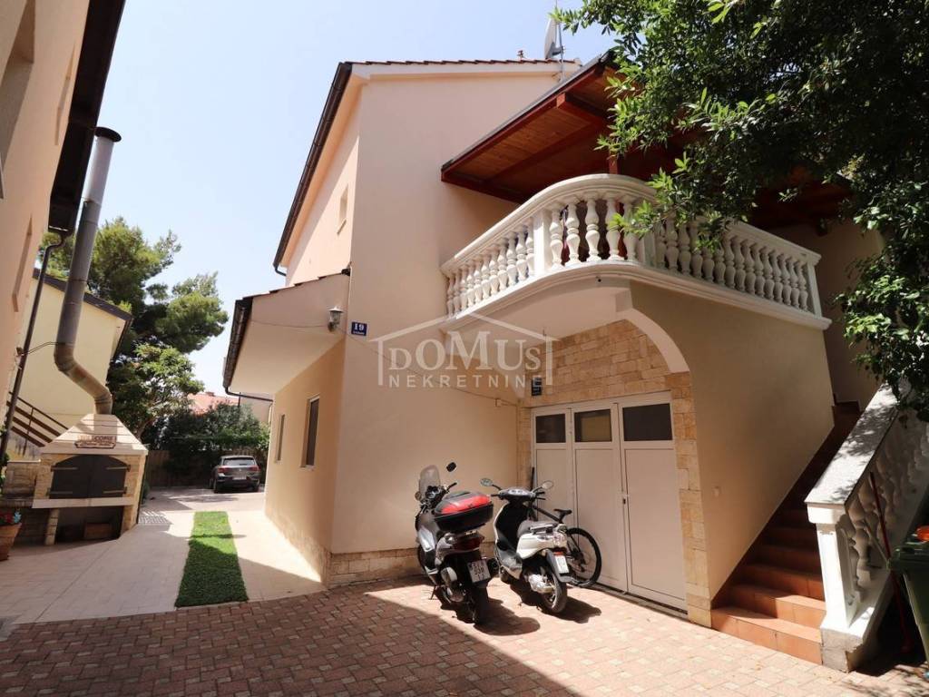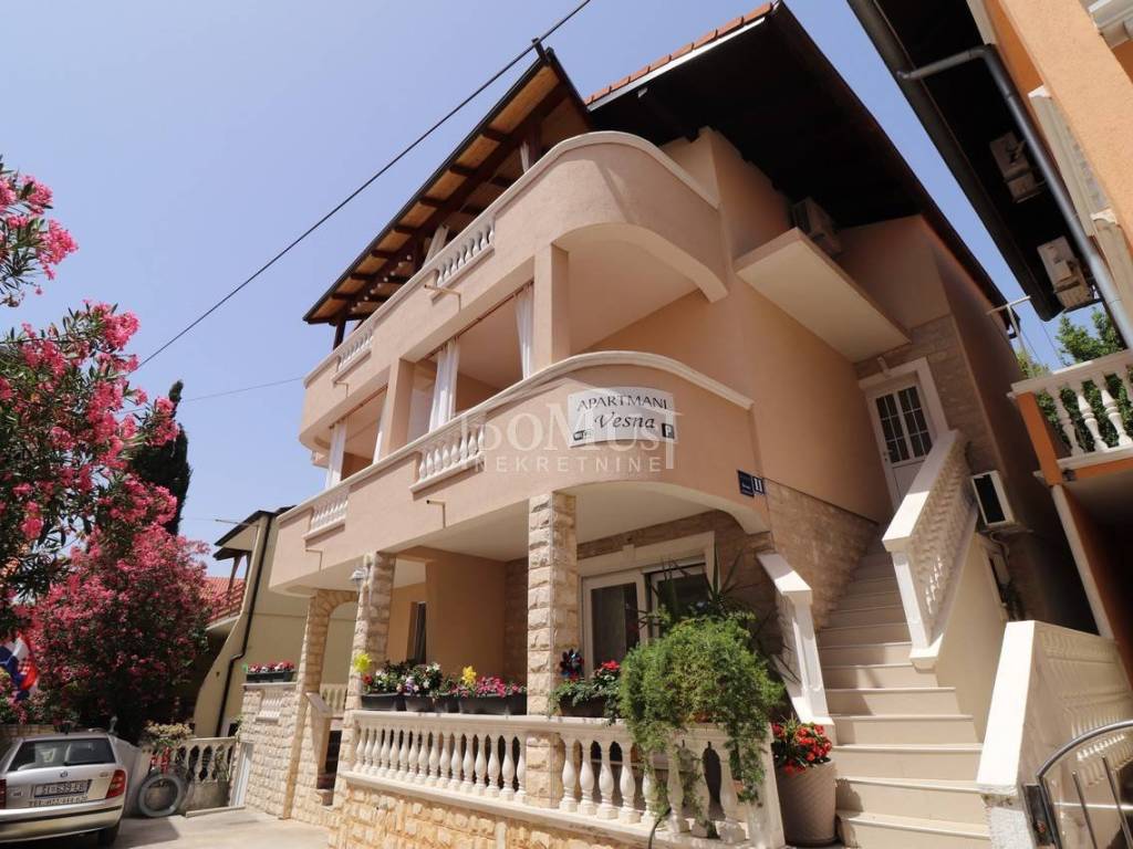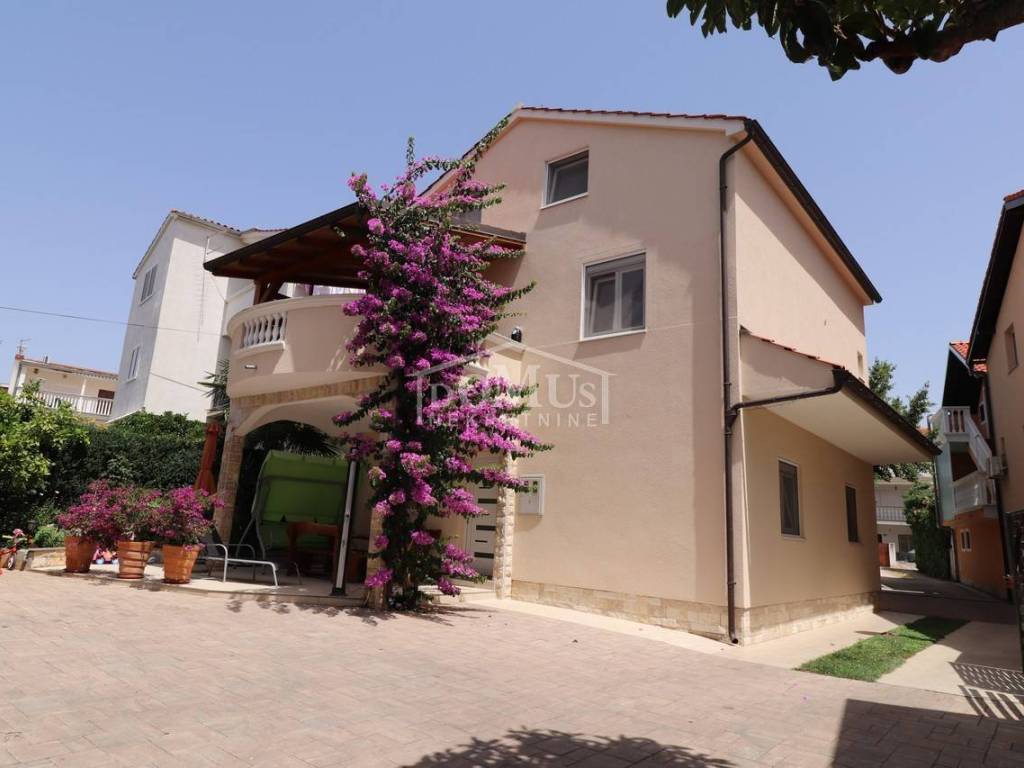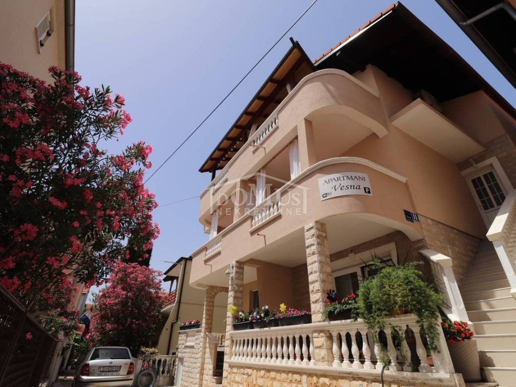 Two fully furnished apartment houses in a quiet location. House 1 has three floors with a total of 210.09 m2 of living space on a plot of 273 m2. It consists of a garage and a two-bedroom apartment on the ground floor, an external staircase leads to the first floor where there are 2 two-bedroom duplex apartments. House 2 has three floors with a total of 227.25 m2 of living space on a plot of 147 m2. It consists of a two bedroom apartment and storage on the ground floor, 2 one bedroom apartments on the first floor and a comfortable two bedroom apartment in the attic overlooking the sea. The apartments are fully furnished and the furniture is included in the price. Distance from the sea and the Blue Beach is 600 m, and from the center 500m.