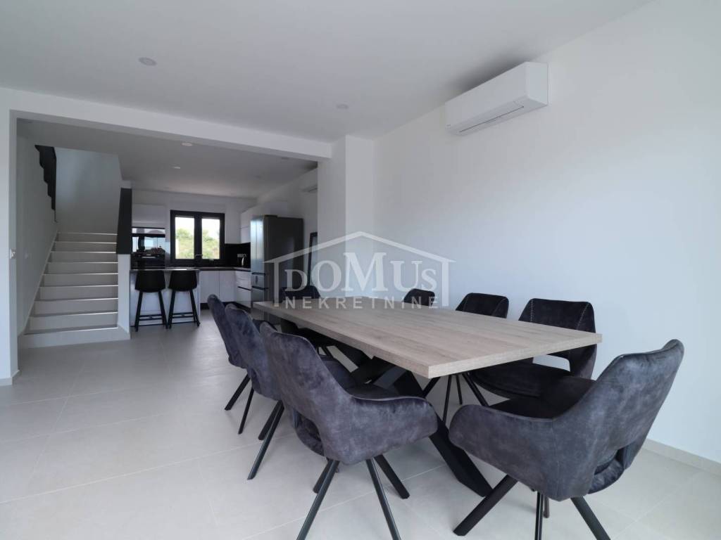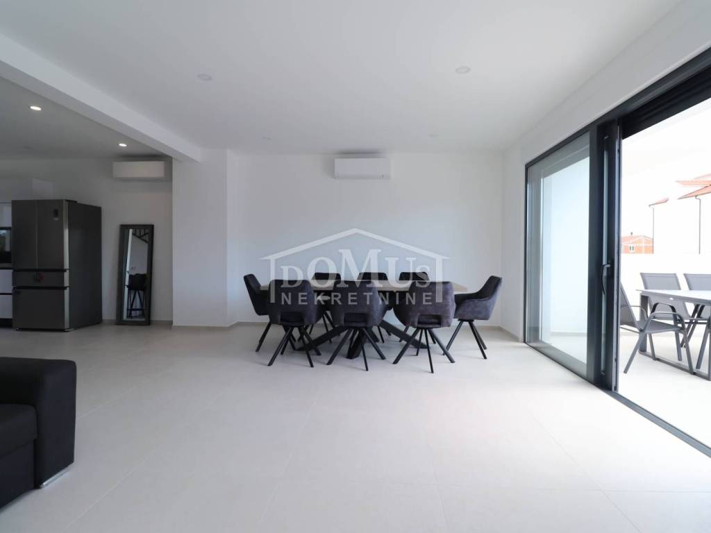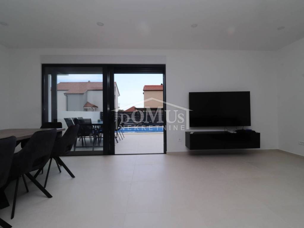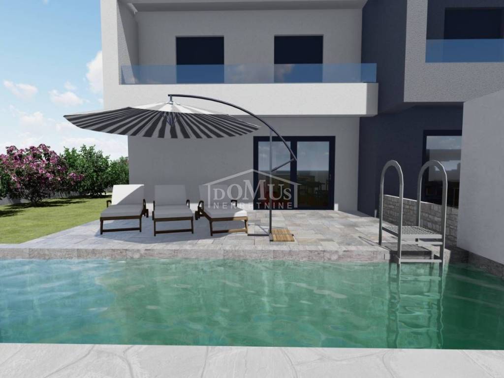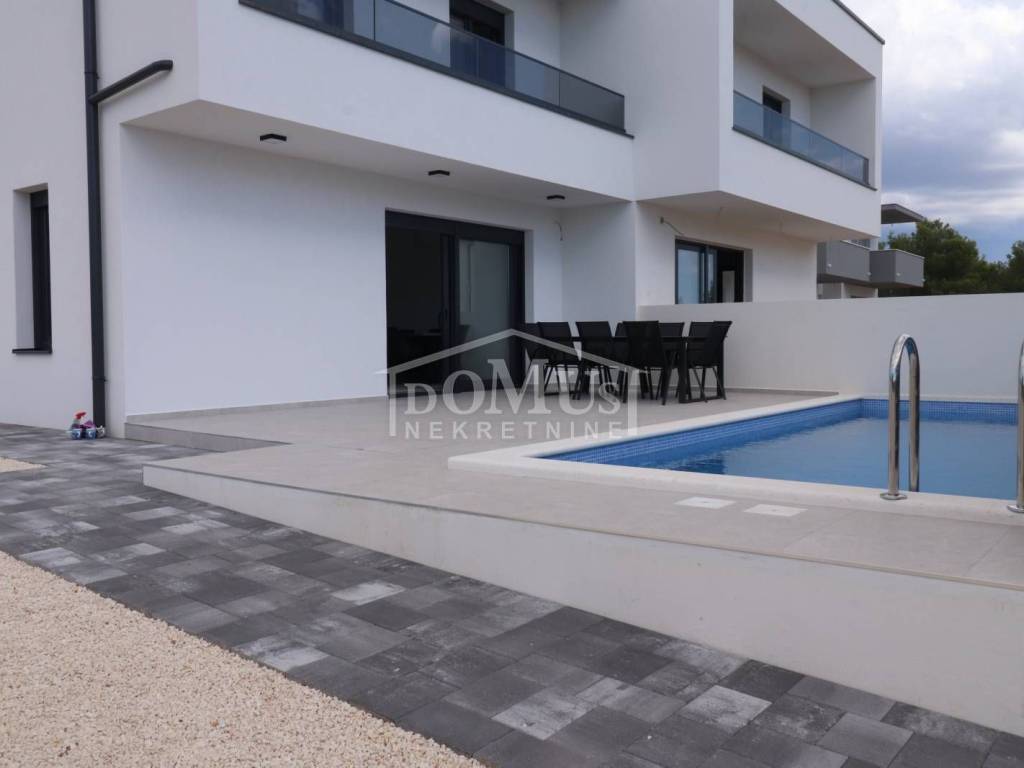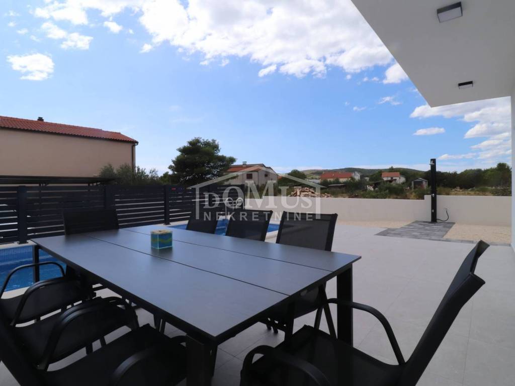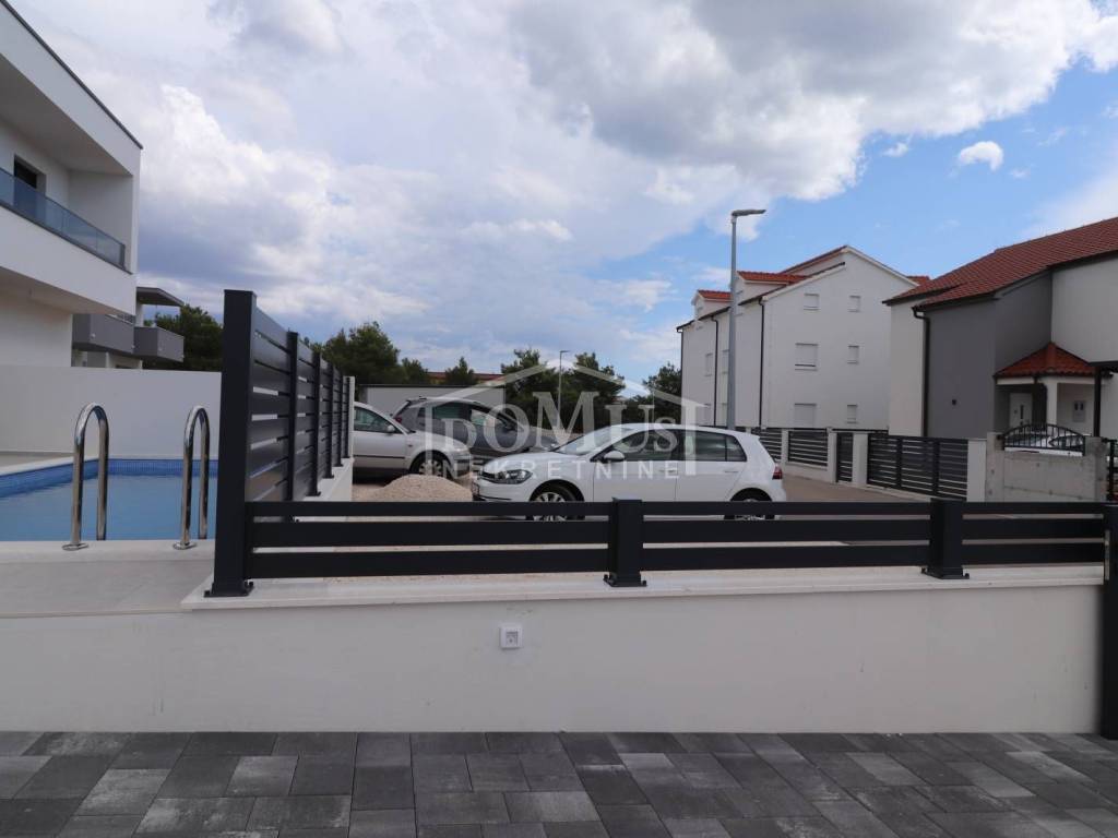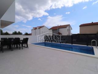 A beautiful family house with modern architecture and a very functional layout in Vodice in a quiet location, 950m from the pebble beach and 750m from the city center. The house is a semi-detached building (west side) on two floors: Ground floor + 1st floor with 125.62 m2 of total usable area and 230 m2 garden with an outdoor pool of 21 m2 and a spacious parking area. The ground floor has a spacious living room, kitchen and dining room, storage room, bathroom, hallway and a large terrace by the pool. On the 1st floor there are three bedrooms, a bathroom, a WC and a loggia. The house is built with modern and high-quality materials such as: thermal facade 10 cm, anthracite-colored carpentry with electric roller blinds and mosquito nets, modern sanitary ware in the bathrooms, electric underfloor heating in all bathrooms on the ground floor and on the first floor, all bedrooms and the living room are equipped with heat pumps. The house has two paved parking spaces.