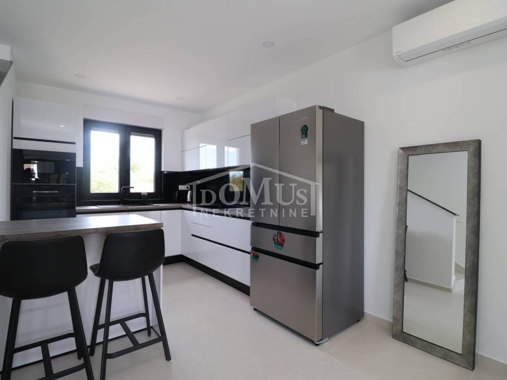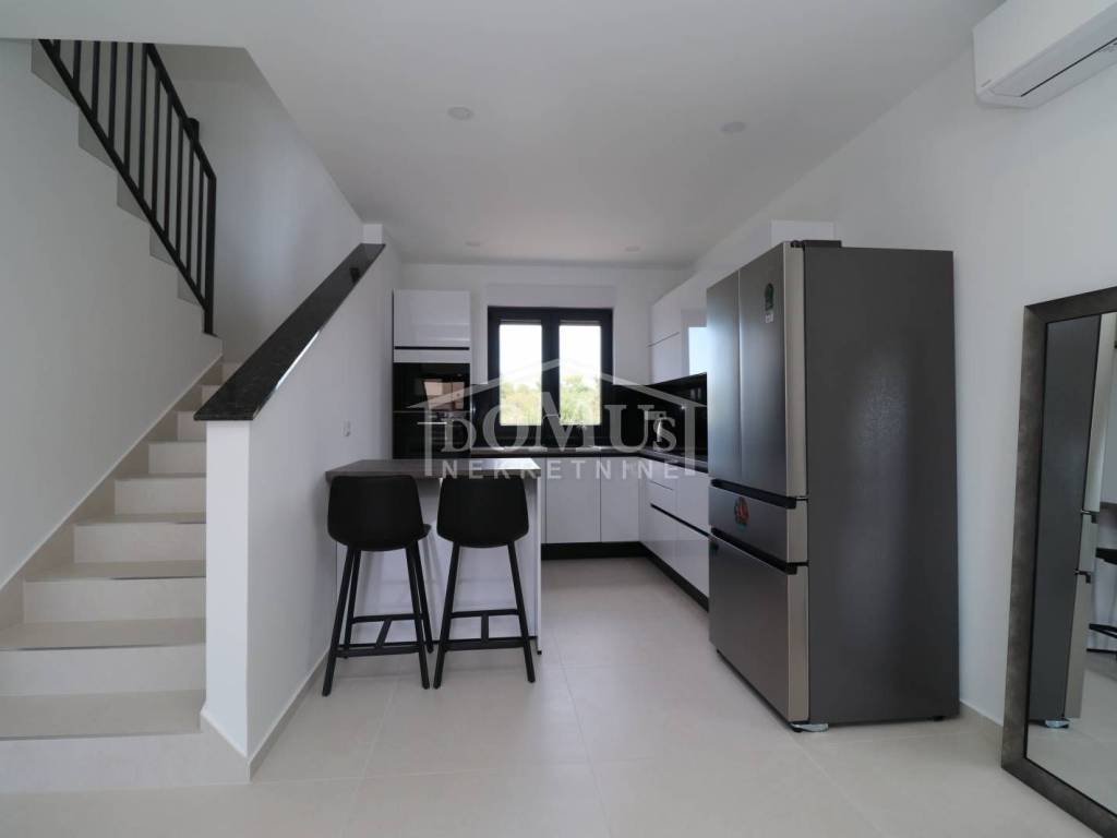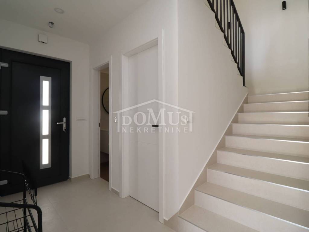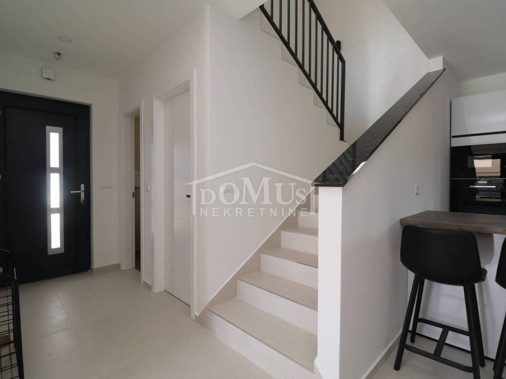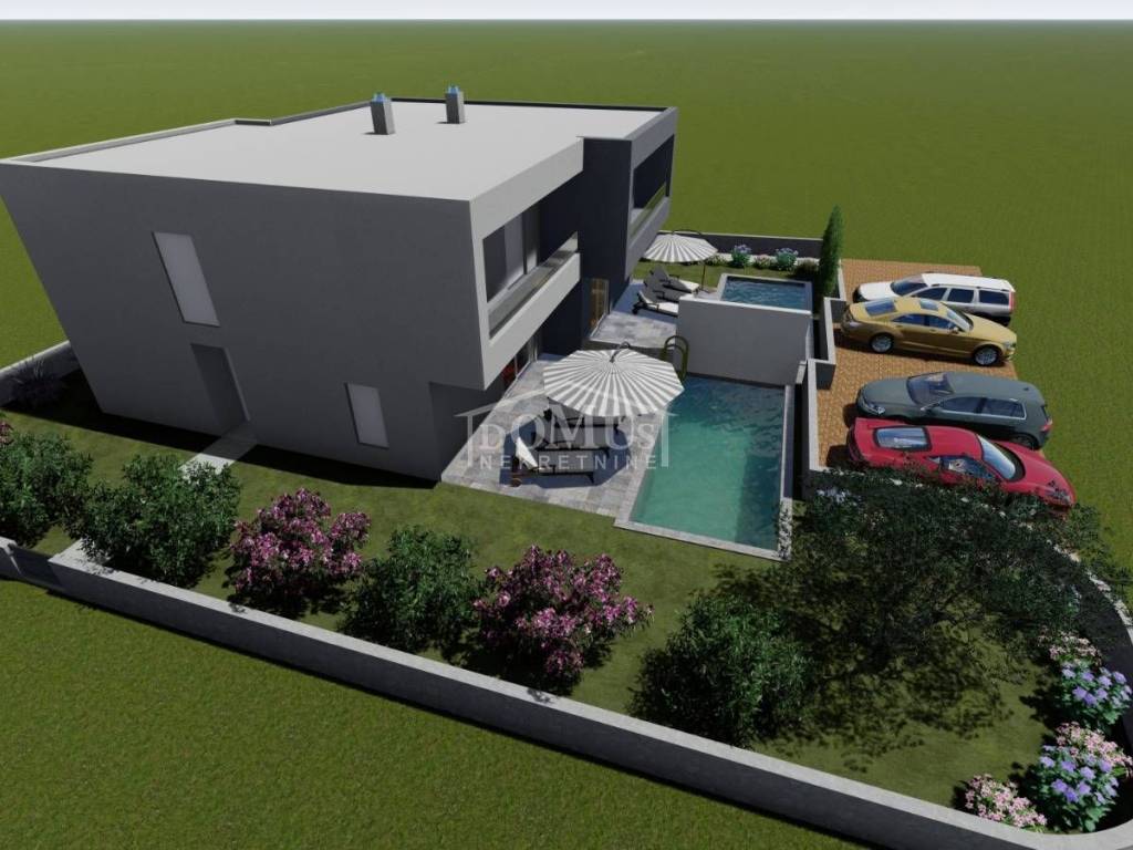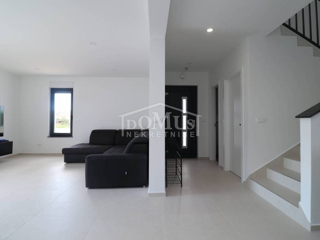A beautiful family house with modern architecture and a very functional layout in Vodice in a quiet location, 950m from the pebble beach and 750m from the city center. The house is a semi-detached building (west side) on two floors: Ground floor + 1st floor with 125.62 m2 of total usable area and 230 m2 garden with an outdoor pool of 21 m2 and a spacious parking area. The ground floor has a spacious living room, kitchen and dining room, storage room, bathroom, hallway and a large terrace by the pool. On the 1st floor there are three bedrooms, a bathroom, a WC and a loggia. The house is built with modern and high-quality materials such as: thermal facade 10 cm, anthracite-colored carpentry with electric roller blinds and mosquito nets, modern sanitary ware in the bathrooms, electric underfloor heating in all bathrooms on the ground floor and on the first floor, all bedrooms and the living room are equipped with heat pumps. The house has two paved parking spaces.