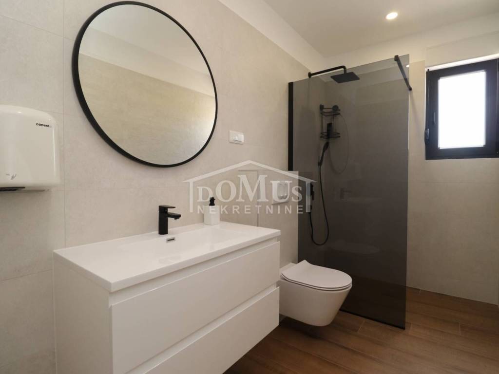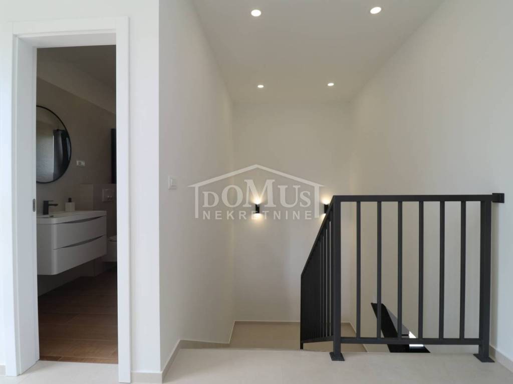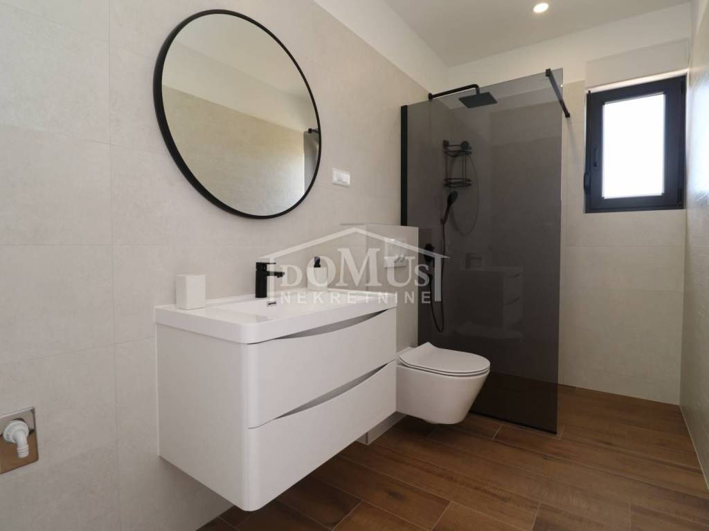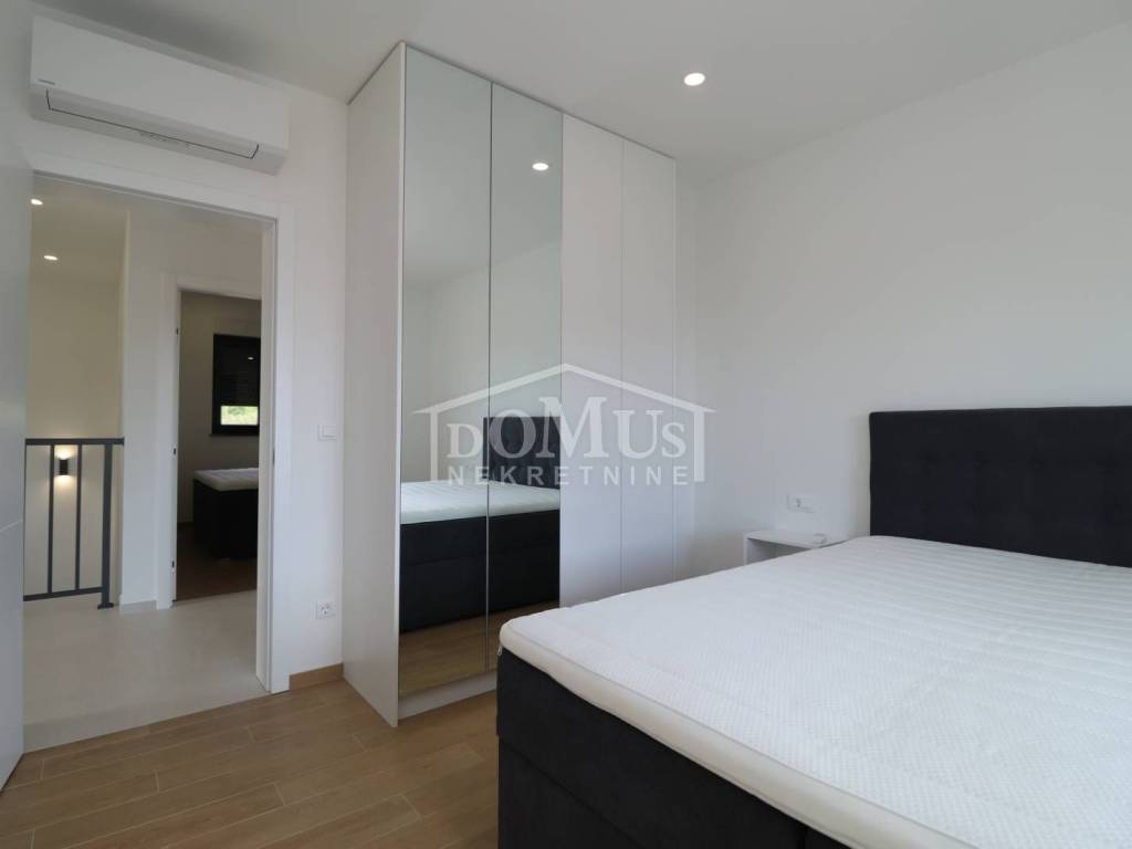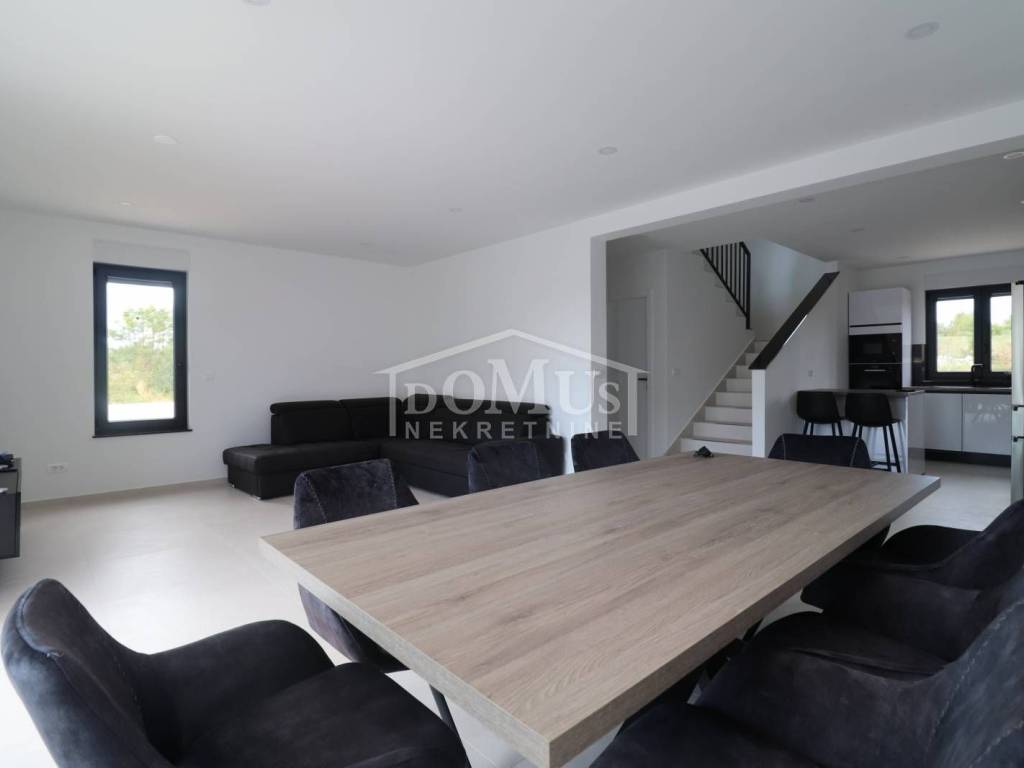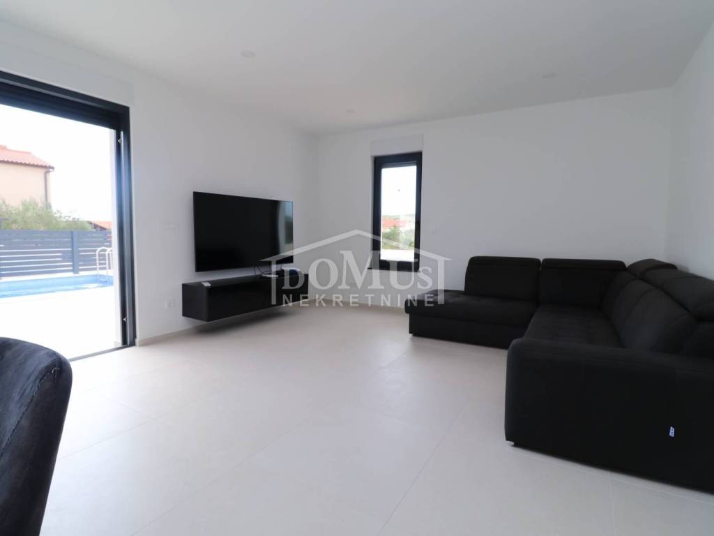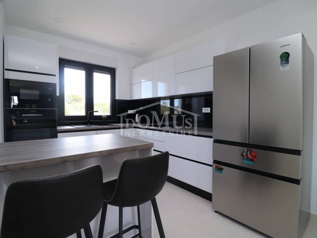 A beautiful family house with modern architecture and a very functional layout in Vodice in a quiet location, 950m from the pebble beach and 750m from the city center. The house is a semi-detached building (west side) on two floors: Ground floor + 1st floor with 125.62 m2 of total usable area and 230 m2 garden with an outdoor pool of 21 m2 and a spacious parking area. The ground floor has a spacious living room, kitchen and dining room, storage room, bathroom, hallway and a large terrace by the pool. On the 1st floor there are three bedrooms, a bathroom, a WC and a loggia. The house is built with modern and high-quality materials such as: thermal facade 10 cm, anthracite-colored carpentry with electric roller blinds and mosquito nets, modern sanitary ware in the bathrooms, electric underfloor heating in all bathrooms on the ground floor and on the first floor, all bedrooms and the living room are equipped with heat pumps. The house has two paved parking spaces.