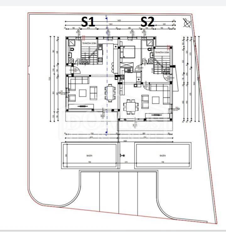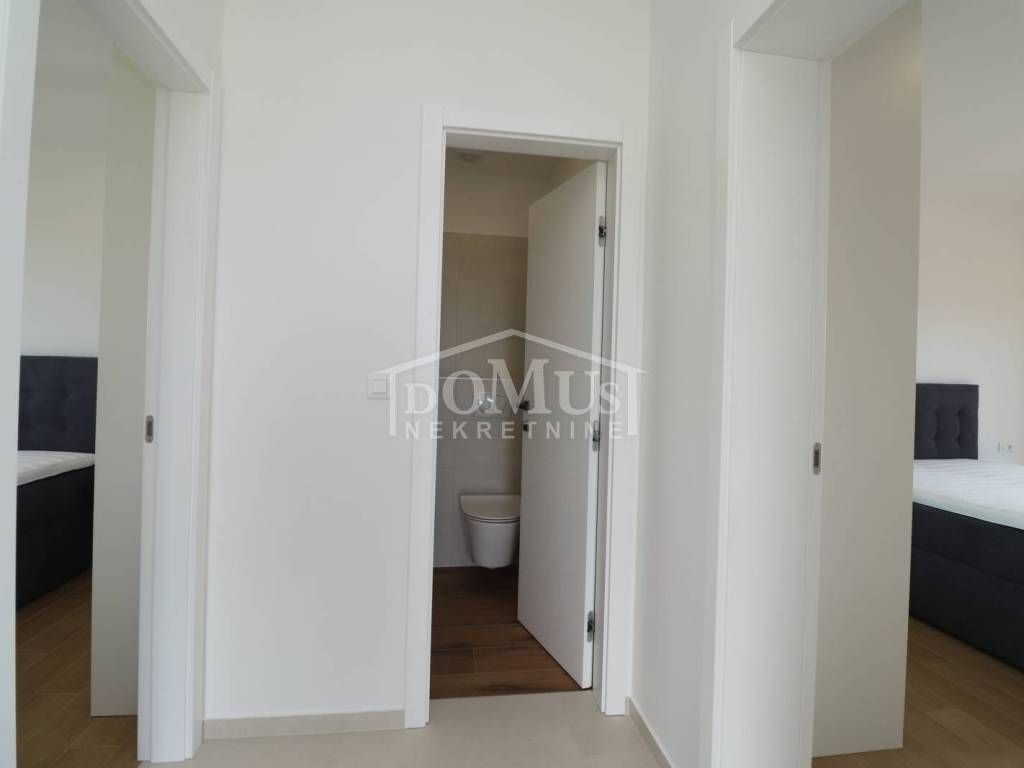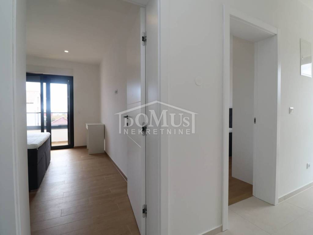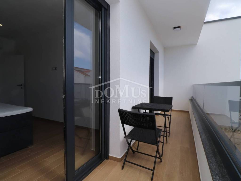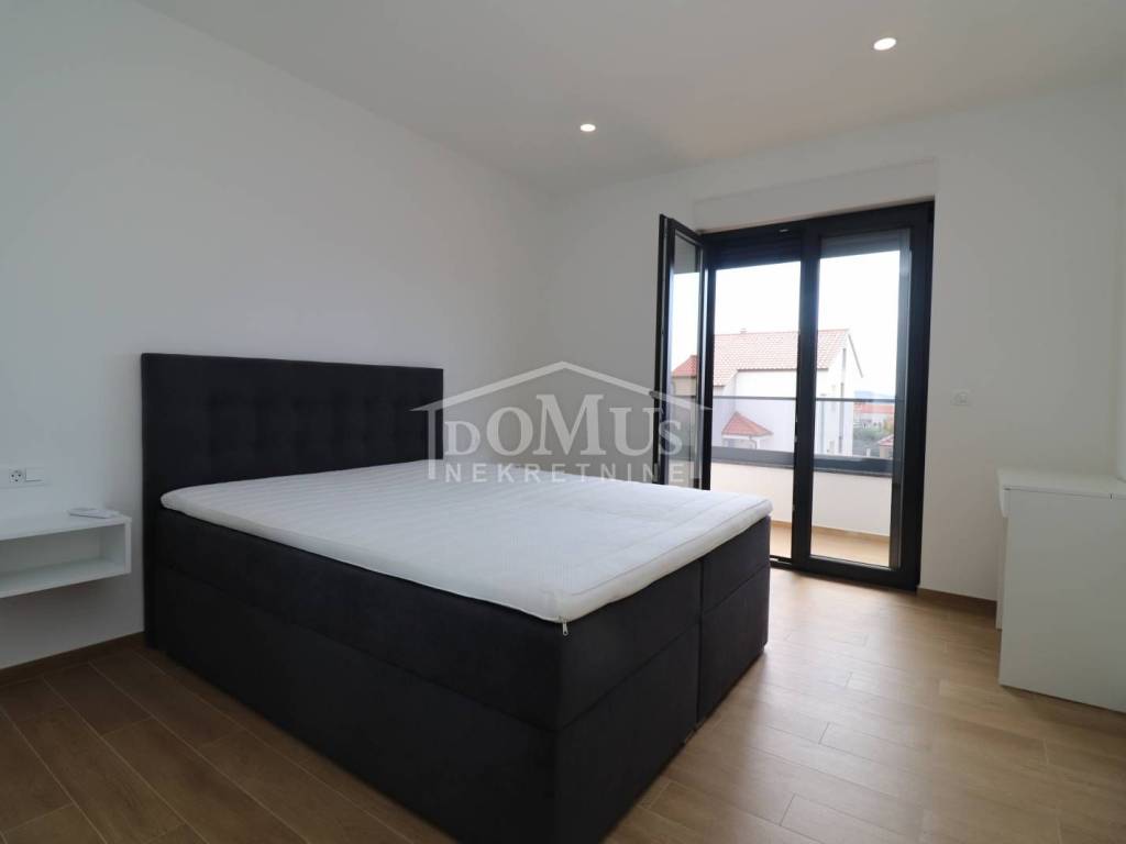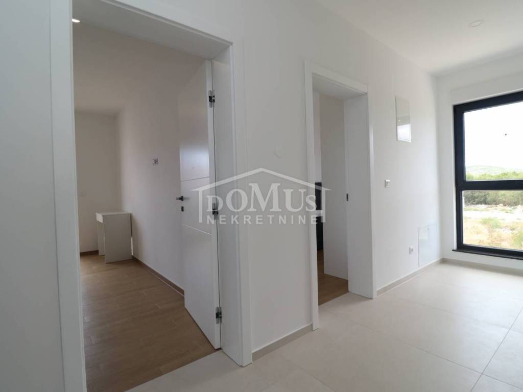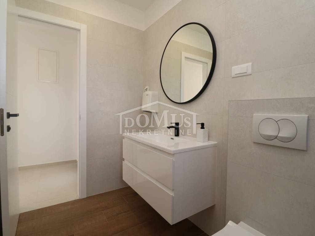 A beautiful family house with modern architecture and a very functional layout in Vodice in a quiet location, 950m from the pebble beach and 750m from the city center. The house is a semi-detached building (west side) on two floors: Ground floor + 1st floor with 125.62 m2 of total usable area and 230 m2 garden with an outdoor pool of 21 m2 and a spacious parking area. The ground floor has a spacious living room, kitchen and dining room, storage room, bathroom, hallway and a large terrace by the pool. On the 1st floor there are three bedrooms, a bathroom, a WC and a loggia. The house is built with modern and high-quality materials such as: thermal facade 10 cm, anthracite-colored carpentry with electric roller blinds and mosquito nets, modern sanitary ware in the bathrooms, electric underfloor heating in all bathrooms on the ground floor and on the first floor, all bedrooms and the living room are equipped with heat pumps. The house has two paved parking spaces.