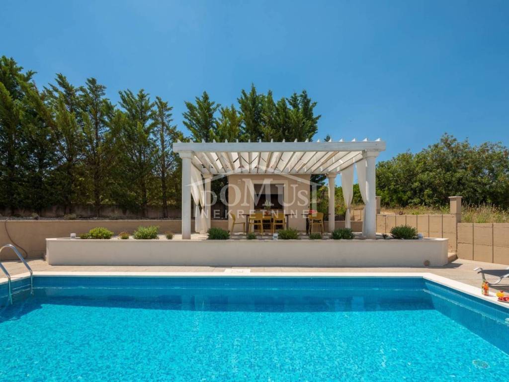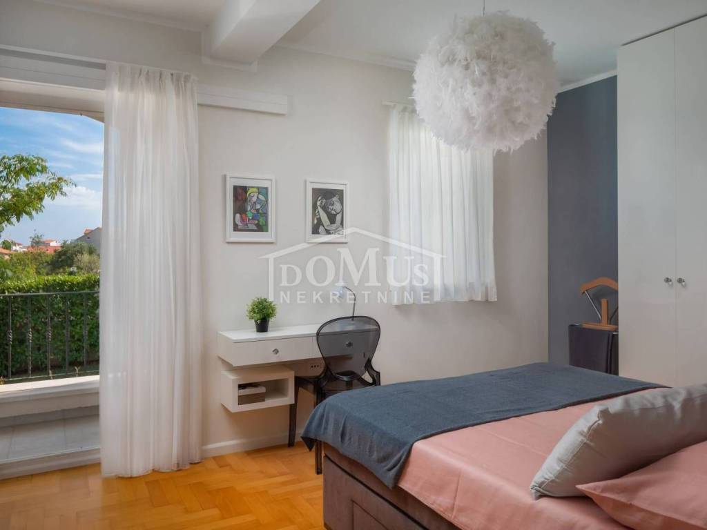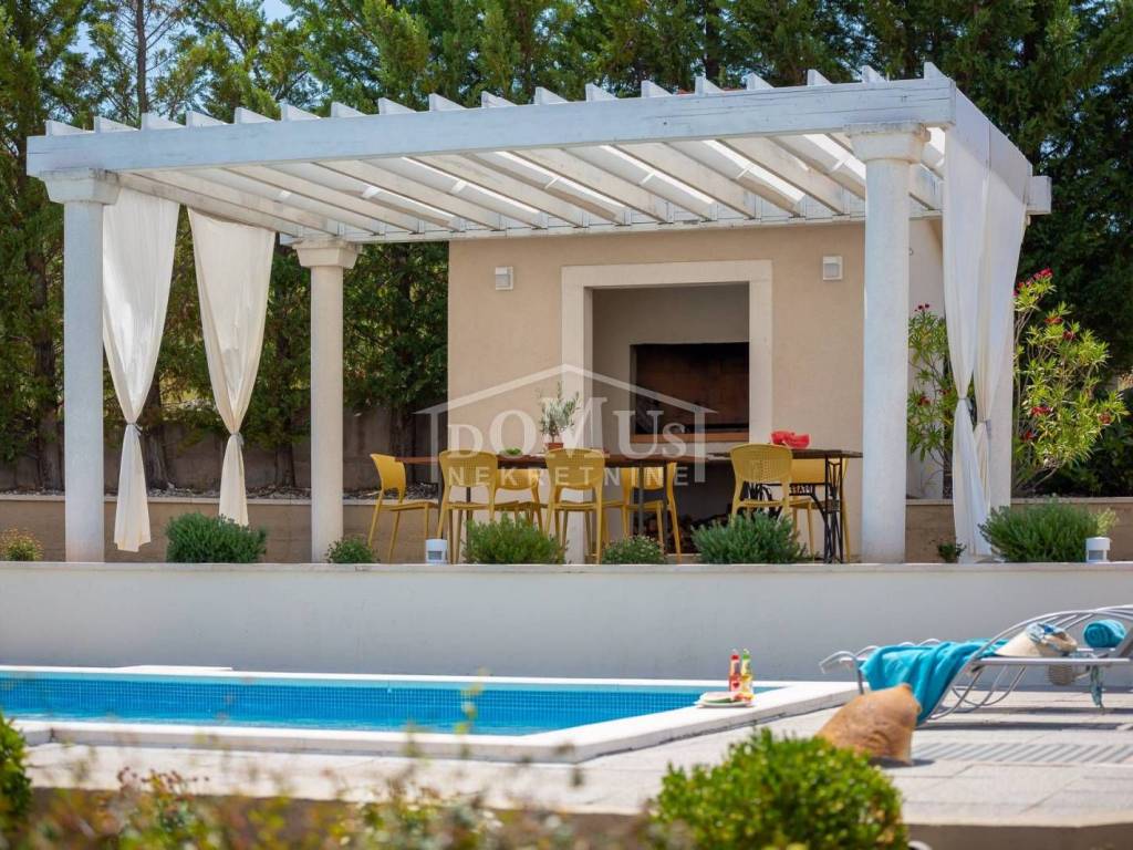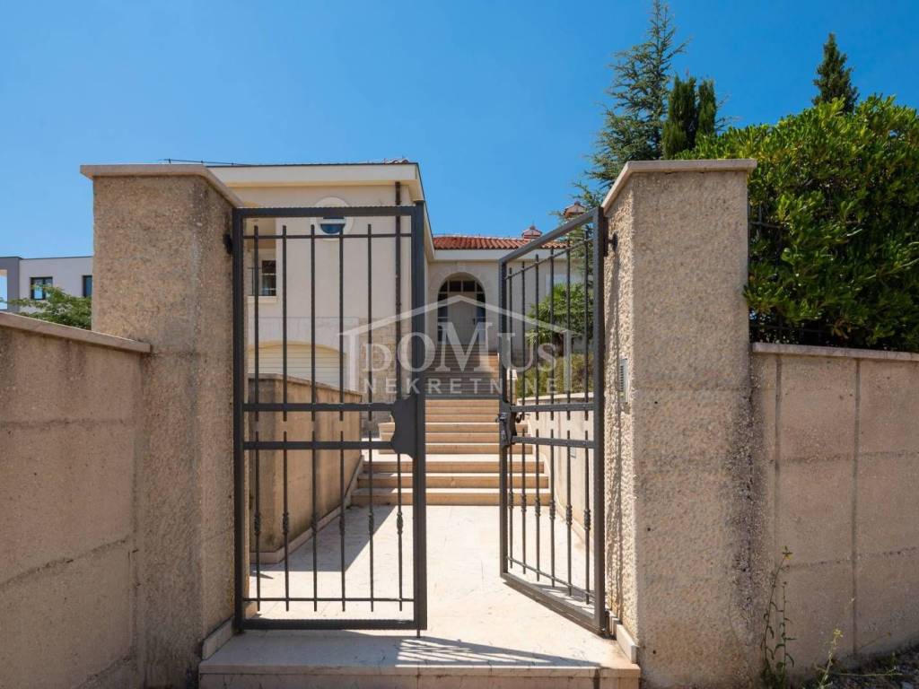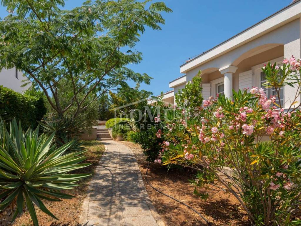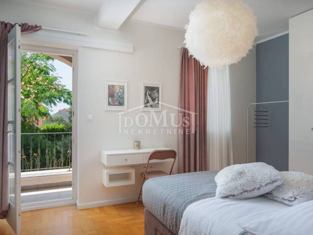 In a quiet environment, ideal for enjoying peace away from the everyday crowd, there is a Villa with a beautiful garden and swimming pool. The villa has 258.05 m2 of usable area, it was built on a plot of 1,400 m2, the yard of the house is divided into several levels, on the lowest level there is a spacious parking space for several vehicles, a luxurious flower garden and green area is located on the middle level, while the sunbathing area, swimming pool of 32 m2 terrace and outdoor grill with mini kitchen on the highest level with a view of the landscape. On the ground floor of the Villa there is a room for socializing/another living room, boiler room, tavern, bathroom and garage. On the 1st floor there is a large, spacious entrance hall, a hallway, from which you can access the sleeping area where there are three bedrooms and bathrooms, each bedroom has access to a balcony / terrace, and one bedroom with its own bathroom, a spacious living room from which access to the gallery, dining room, kitchen, guest WC, laundry room and access to a large covered terrace with a sun deck, barbecue and a large swimming pool is provided. The villa is built and equipped with top quality materials, it is equipped with central heating, a solar panel for hot water, a pool with counter-current swimming, air conditioning in every room. The villa is 1,700 m from the sea/beach, and 1,200 m from the center. The great advantage of this real estate is the fact that the future buyer, in addition to the mentioned Villa, has the possibility to buy an additional plot of 800 m2 for an additional fee.
