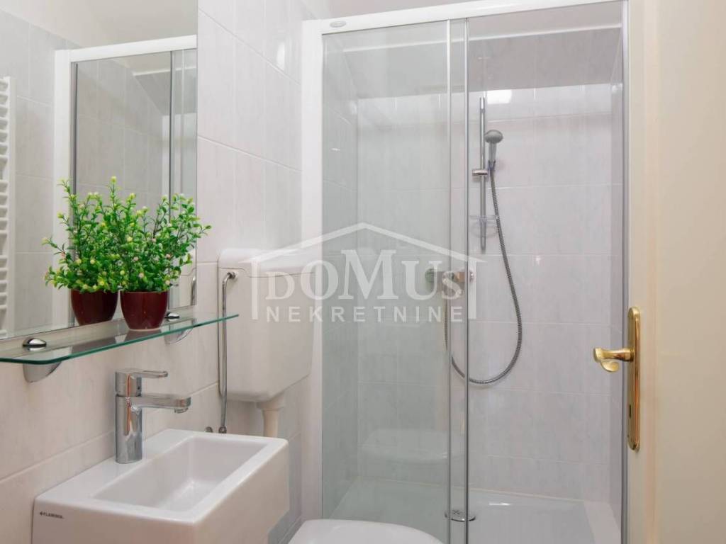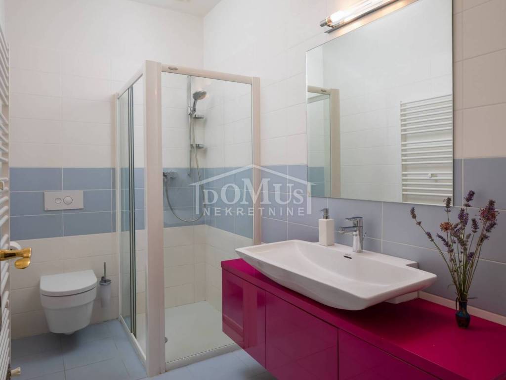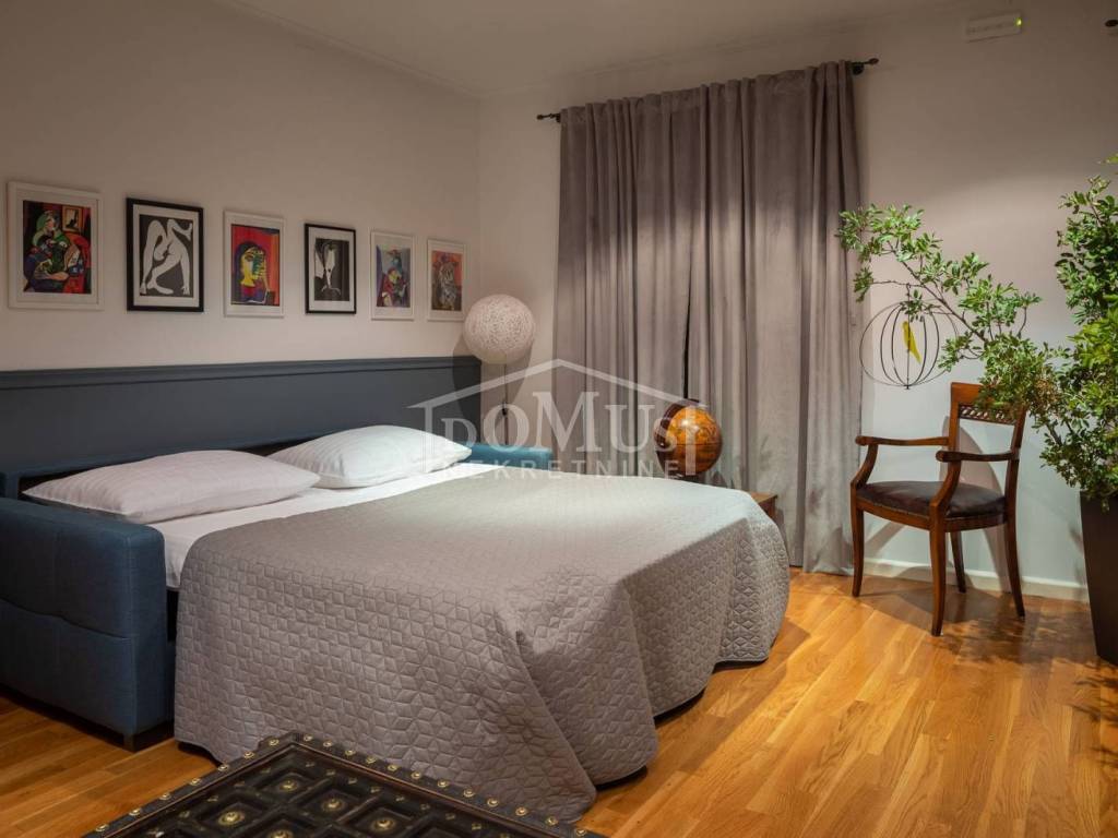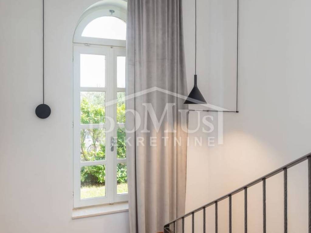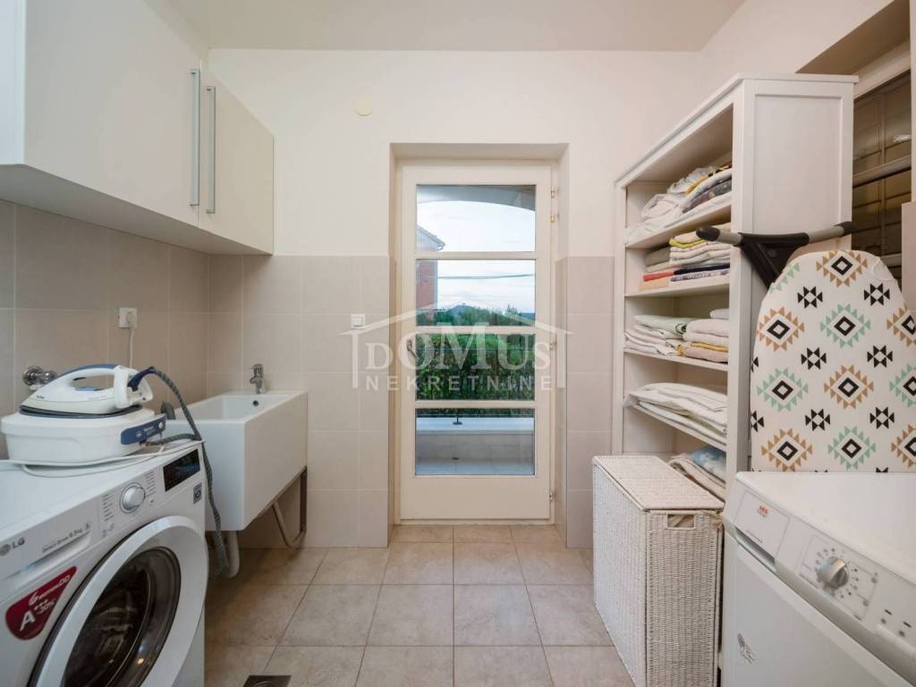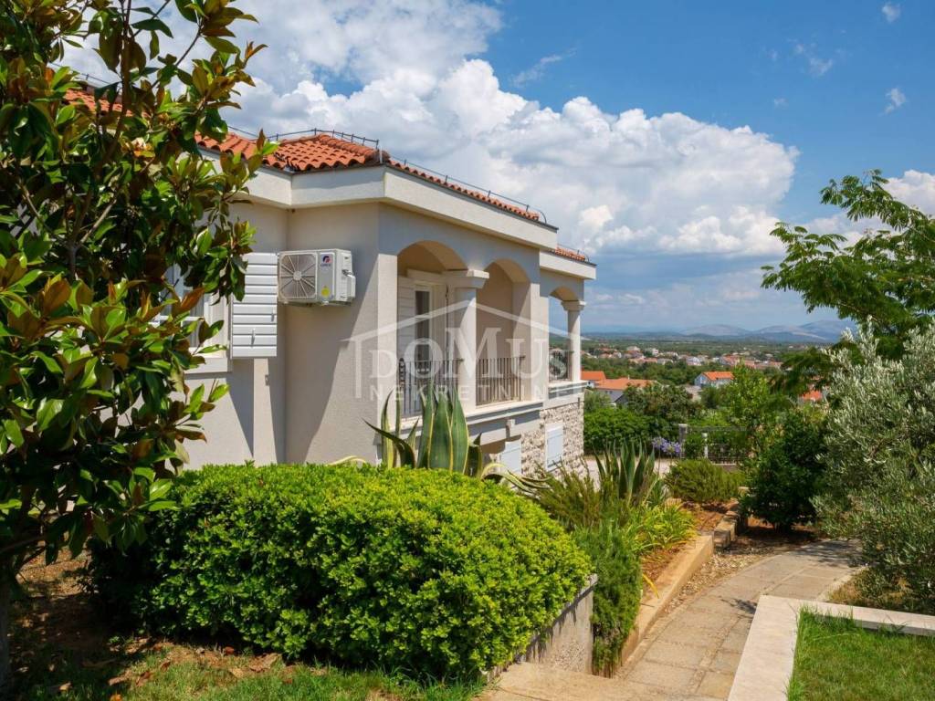 In a quiet environment, ideal for enjoying peace away from the everyday crowd, there is a Villa with a beautiful garden and swimming pool. The villa has 258.05 m2 of usable area, it was built on a plot of 1,400 m2, the yard of the house is divided into several levels, on the lowest level there is a spacious parking space for several vehicles, a luxurious flower garden and green area is located on the middle level, while the sunbathing area, swimming pool of 32 m2 terrace and outdoor grill with mini kitchen on the highest level with a view of the landscape. On the ground floor of the Villa there is a room for socializing/another living room, boiler room, tavern, bathroom and garage. On the 1st floor there is a large, spacious entrance hall, a hallway, from which you can access the sleeping area where there are three bedrooms and bathrooms, each bedroom has access to a balcony / terrace, and one bedroom with its own bathroom, a spacious living room from which access to the gallery, dining room, kitchen, guest WC, laundry room and access to a large covered terrace with a sun deck, barbecue and a large swimming pool is provided. The villa is built and equipped with top quality materials, it is equipped with central heating, a solar panel for hot water, a pool with counter-current swimming, air conditioning in every room. The villa is 1,700 m from the sea/beach, and 1,200 m from the center. The great advantage of this real estate is the fact that the future buyer, in addition to the mentioned Villa, has the possibility to buy an additional plot of 800 m2 for an additional fee.