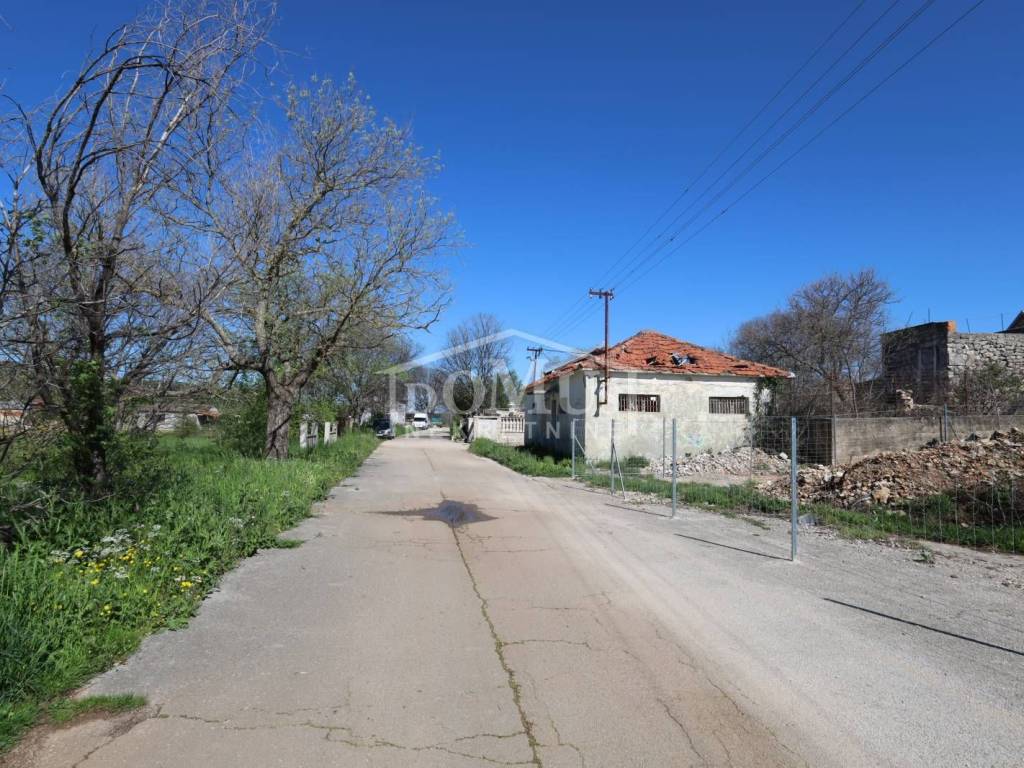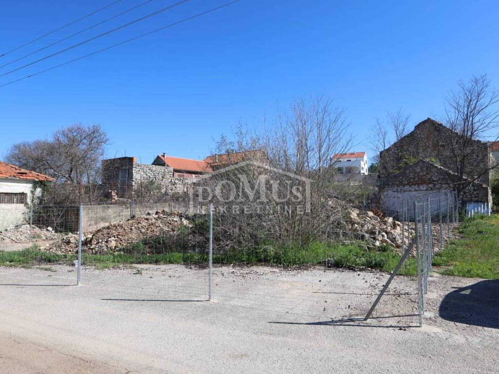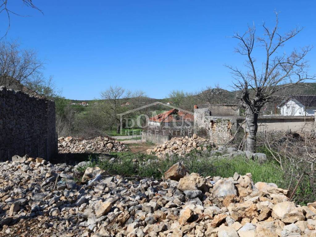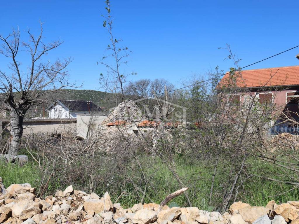 In the hinterland of Vodice, in the small village of Gaćelezi, in a quiet location, there is a building plot of 1,098 m2 with two existing collapsed buildings, stone houses (without a roof) built before 1968 (they have a cadastral certificate). The area of the destroyed building A. is about 45 m2 and building B. about 38 m2. The plot is slightly irregular in shape, with a south-facing slope and is located between two access roads (from the north and south). The distance from the town of Vodice is 9.9 km.