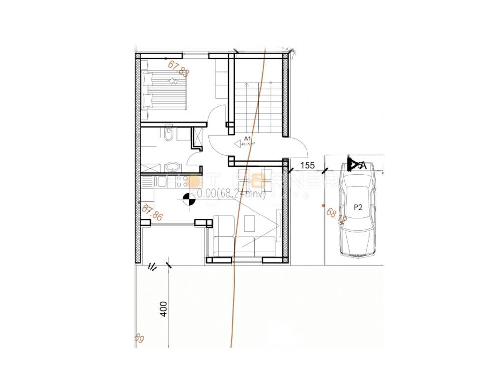 For sale a beautiful apartment in a modern new building near Pula with a garden. The apartment is located on the ground floor of a small residential building in a quiet location, with a living area of about 47m2 and consists of 1 bedroom (10.80m2), hallway (4.10m2), living room, dining room and kitchen (26.40m2) with access to a terrace of 5.80m2 and a bathroom of 4.10m2.