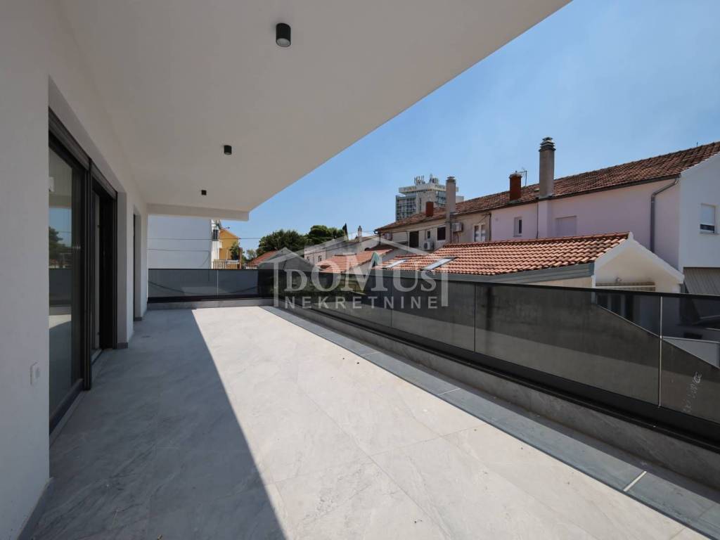 Vodice, in the immediate vicinity of the city center and next to one of the city's most attractive beaches, a new modern multi-apartment building is being built in accordance with the latest standards, it will be equipped with top-quality materials and equipment such as a thermal facade, PVC carpentry in anthracite color with electric blinds and mosquito nets, burglar-proof and fire-proof entrance doors, quality floor coverings, electric underfloor heating in the entire apartment, air conditioners in every room. The building has 5 floors: basement, ground floor, first floor, second floor and third floor/roof terrace. In the basement there are storage rooms and garage parking spaces for each apartment.