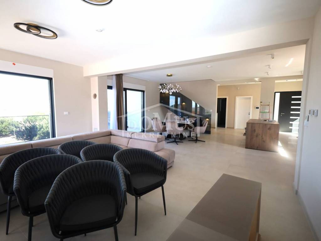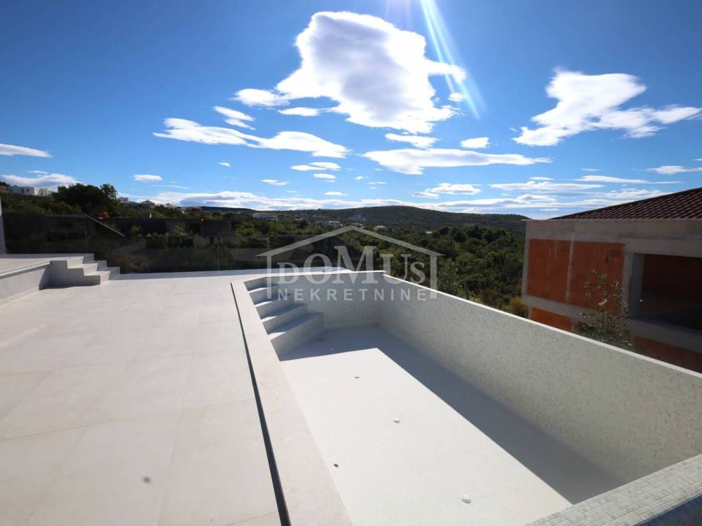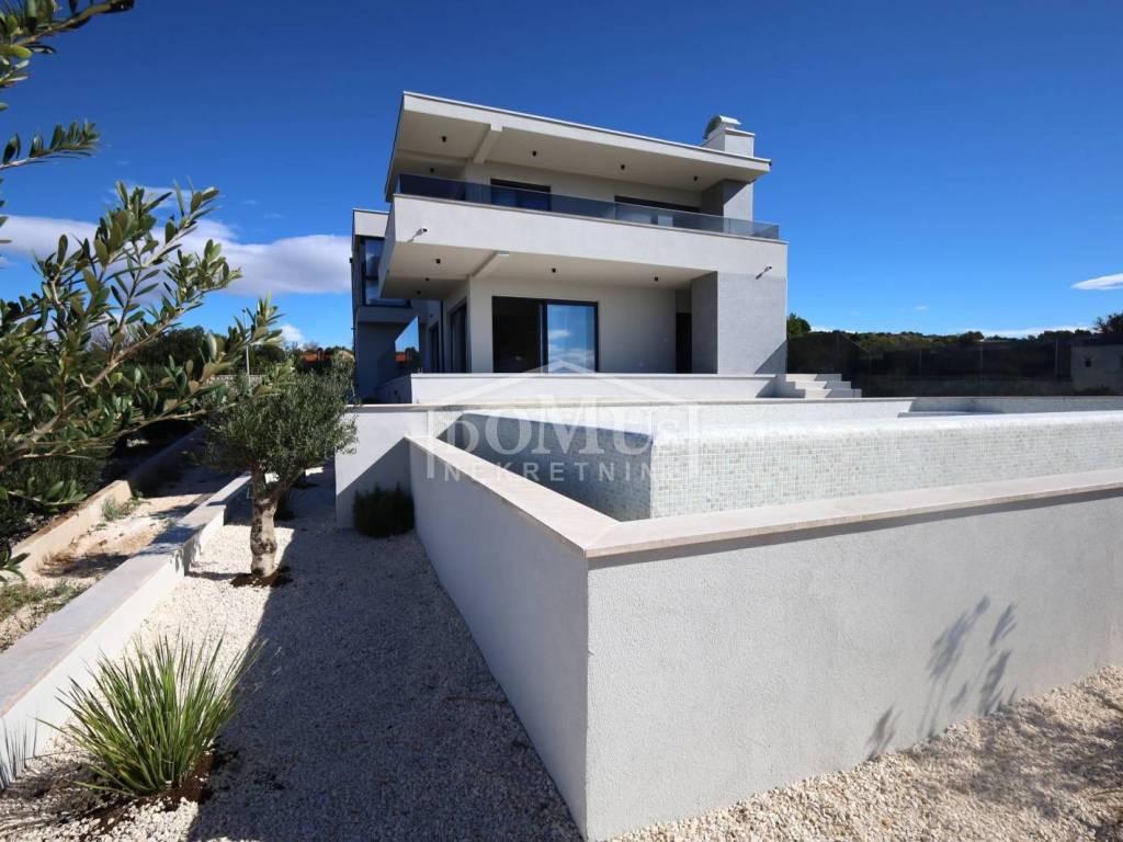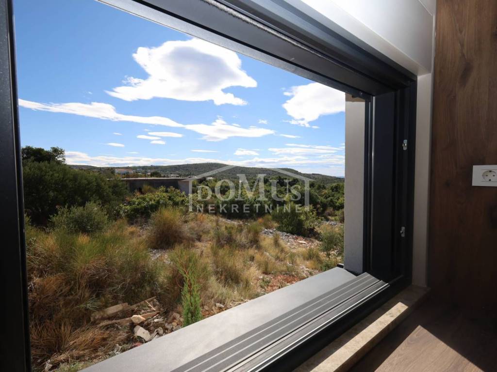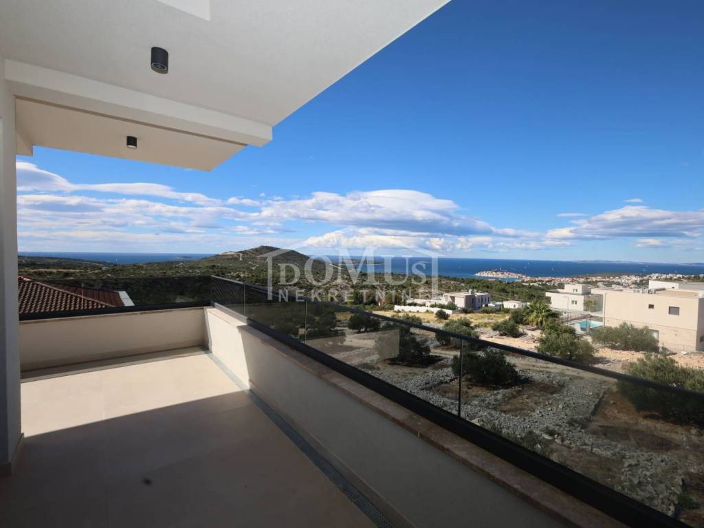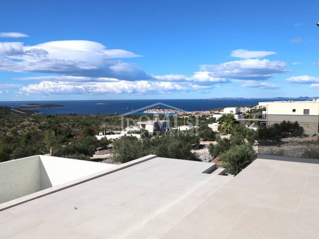 Villa in Primošten offering a spectacular panoramic view of the sea and the town of Primošten. It is located on a 600 m² plot, surrounded by nature and away from the city hustle. Designed with modern architecture, clean lines, spacious terraces, and carefully selected materials.