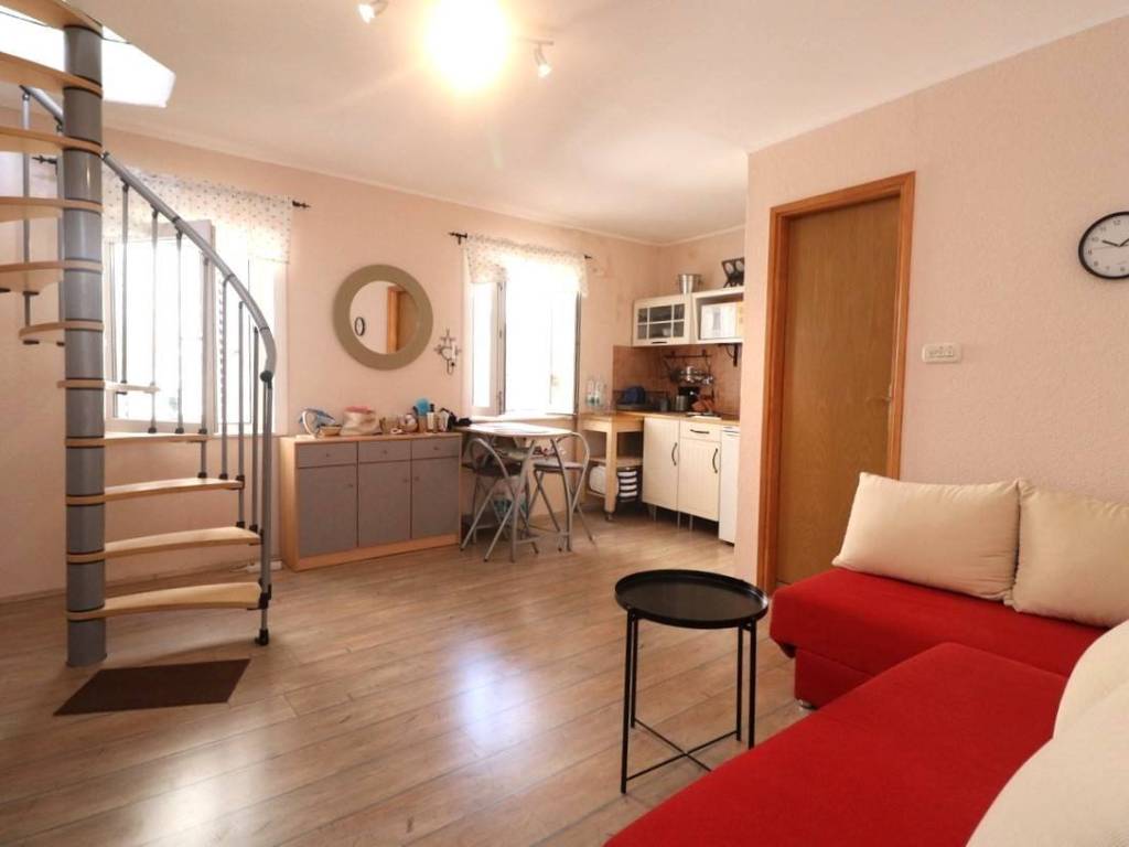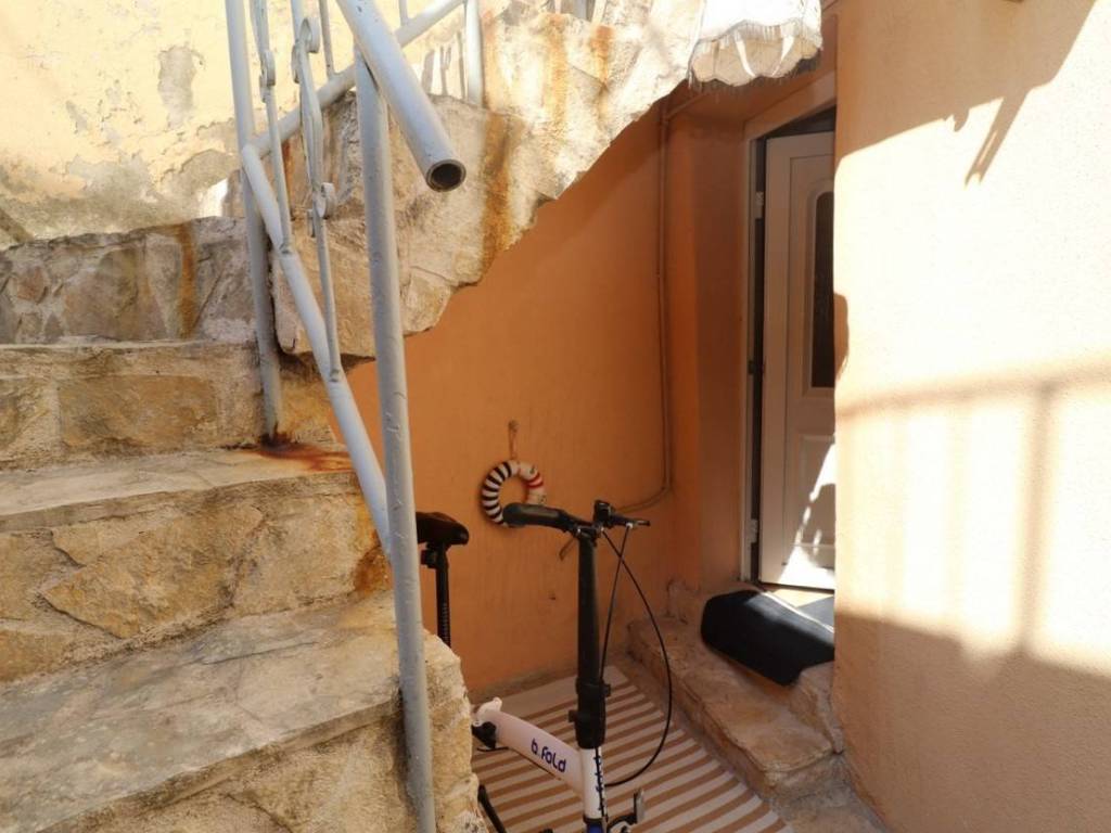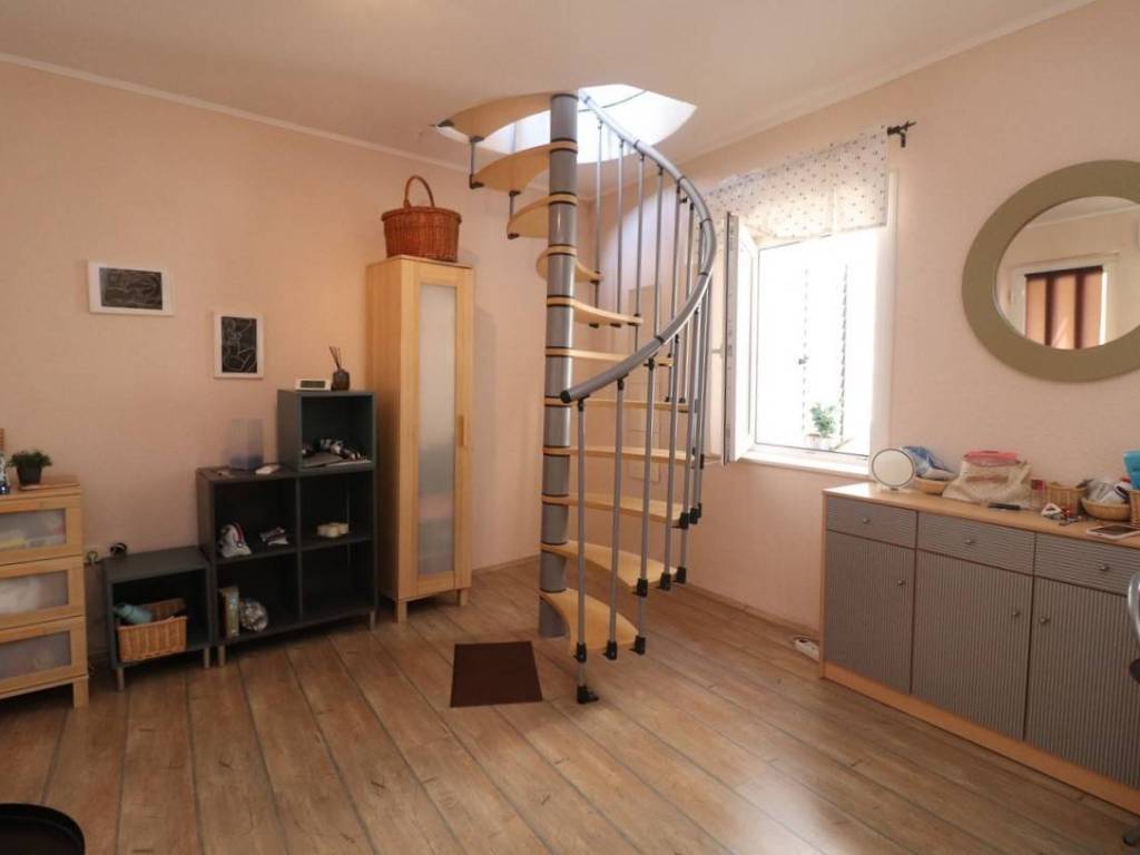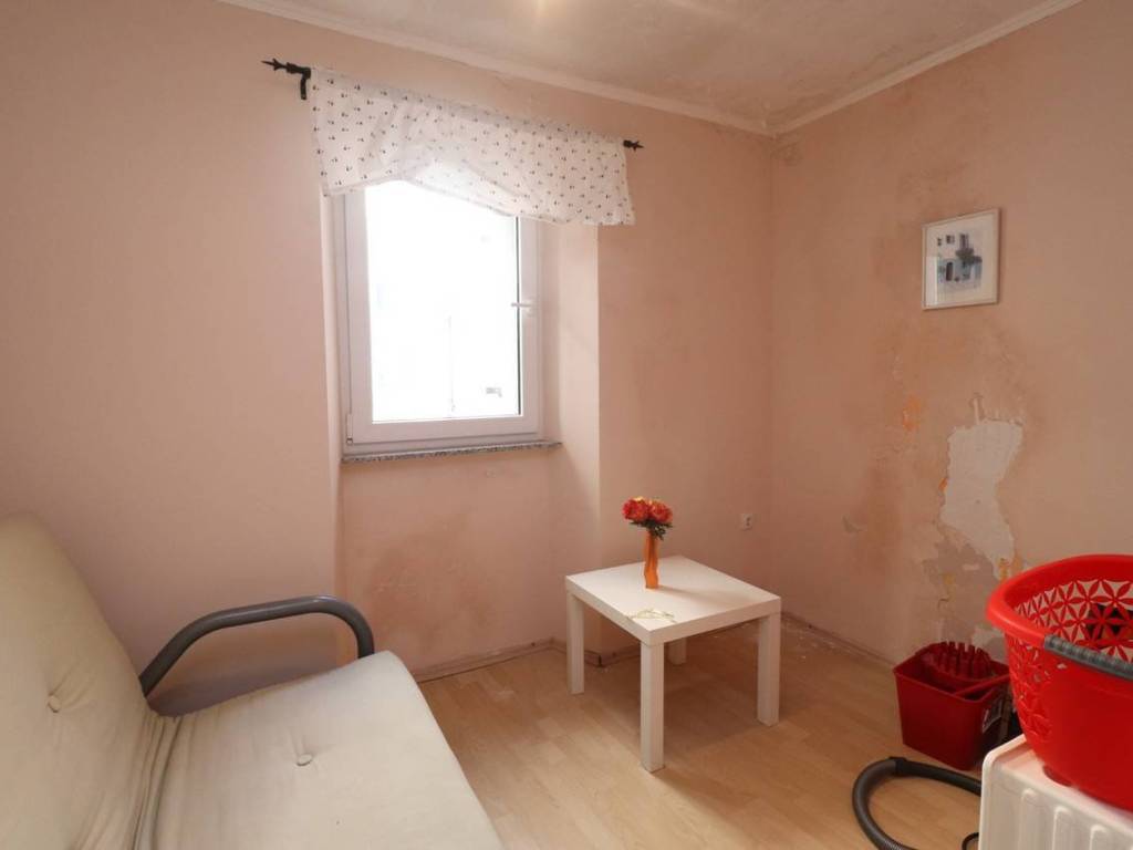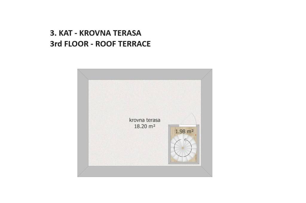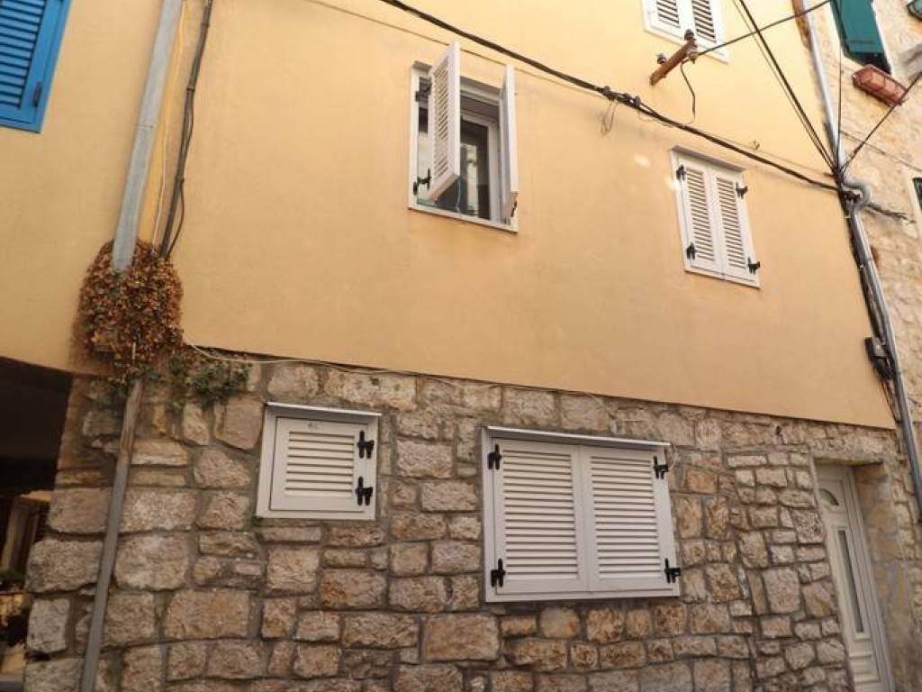 In the center of Vodice, in a very attractive location, a stone house in a row on three floors with a roof terrace with a total of 87.95m2 of usable area. On the ground floor of the house there is a storage room and a studio apartment with a separate entrance that requires complete renovation. External stairs lead to the 1st floor, which consists of a hallway, two bedrooms and a bathroom. The external stairs lead to the second floor, where there is a kitchen with a dining room and a living room as a whole, as well as a bathroom. From the living room, spiral stairs lead to the roof terrace of 21.79m2 with a view of the sea and the old part of the city. The house is furnished and habitable, but investments are needed for renovation. Only 70m from the sea.
