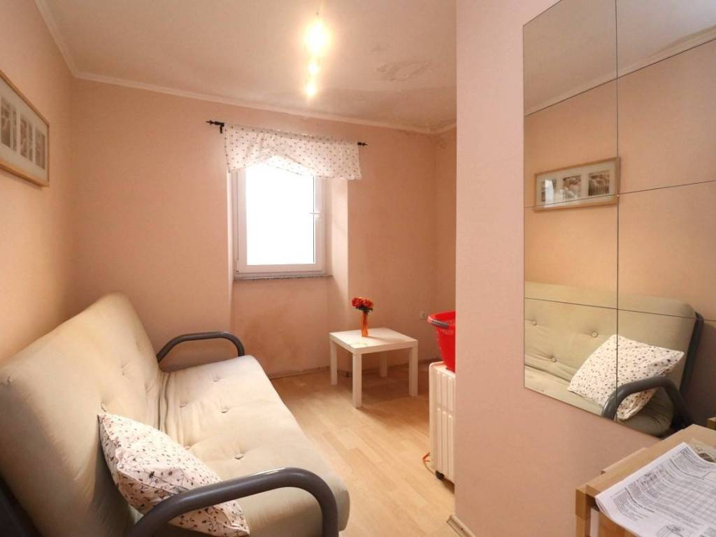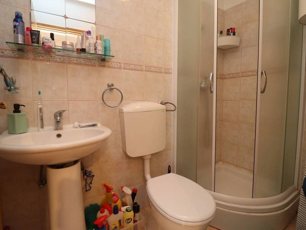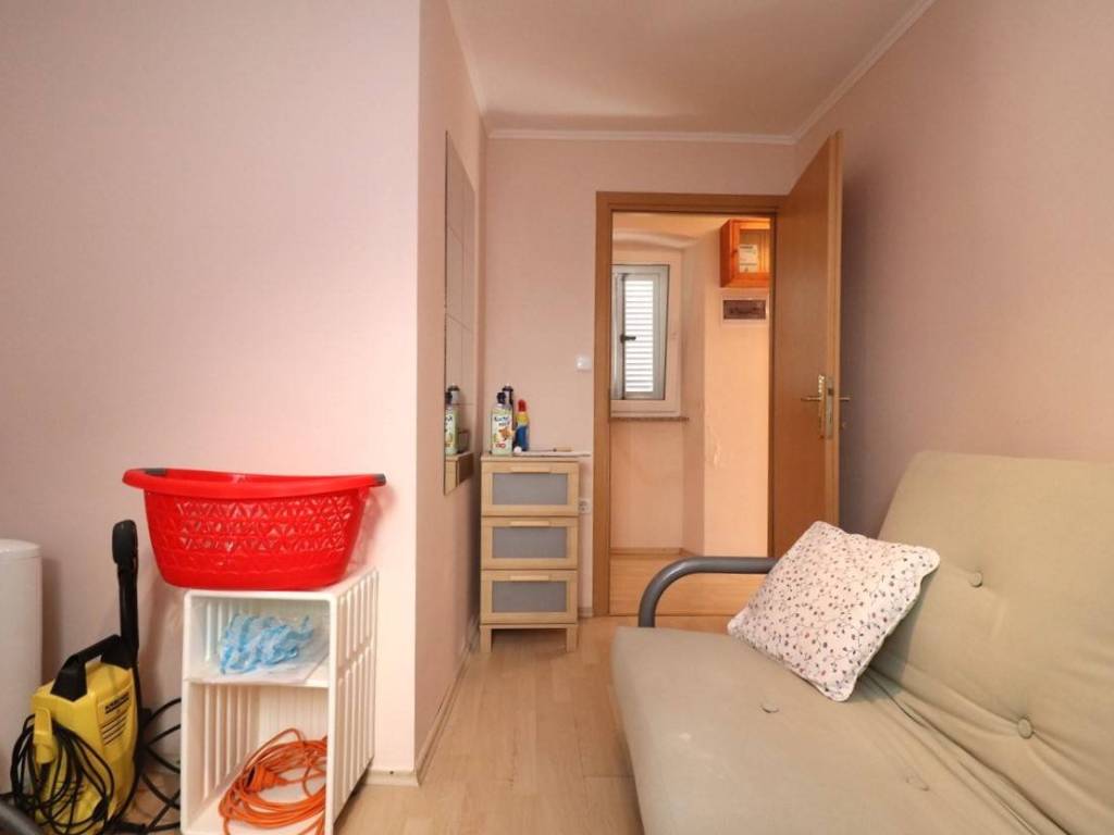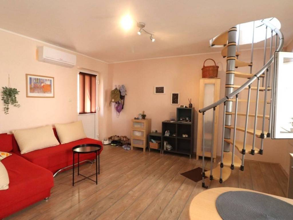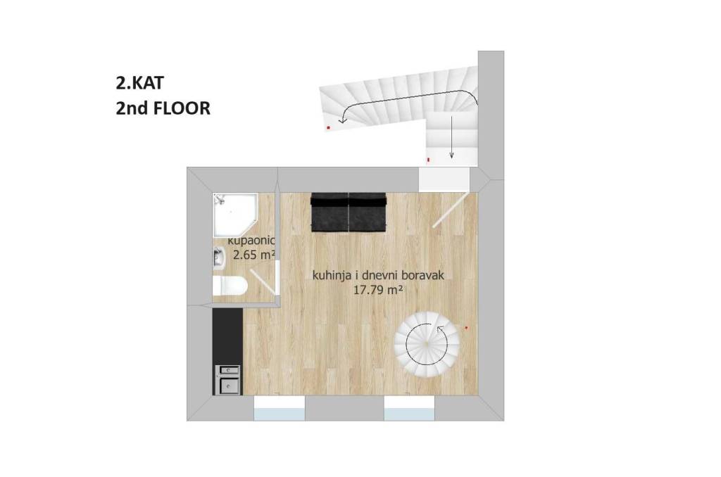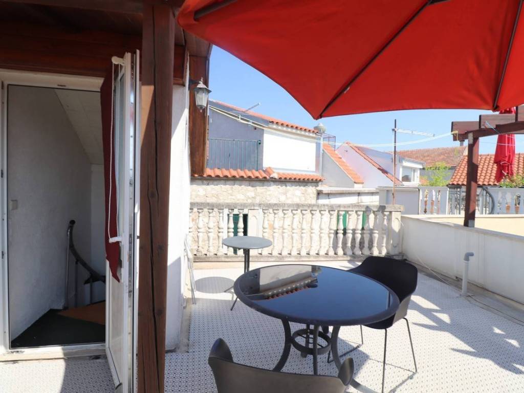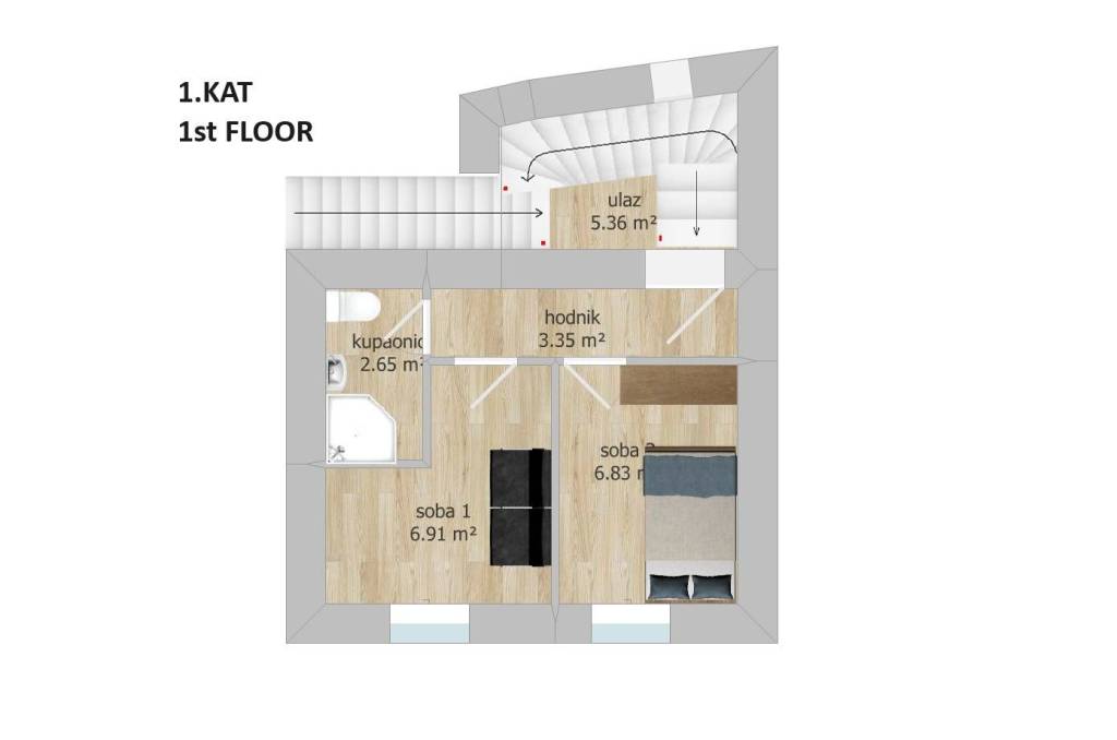 In the center of Vodice, in a very attractive location, a stone house in a row on three floors with a roof terrace with a total of 87.95m2 of usable area. On the ground floor of the house there is a storage room and a studio apartment with a separate entrance that requires complete renovation. External stairs lead to the 1st floor, which consists of a hallway, two bedrooms and a bathroom. The external stairs lead to the second floor, where there is a kitchen with a dining room and a living room as a whole, as well as a bathroom. From the living room, spiral stairs lead to the roof terrace of 21.79m2 with a view of the sea and the old part of the city. The house is furnished and habitable, but investments are needed for renovation. Only 70m from the sea.