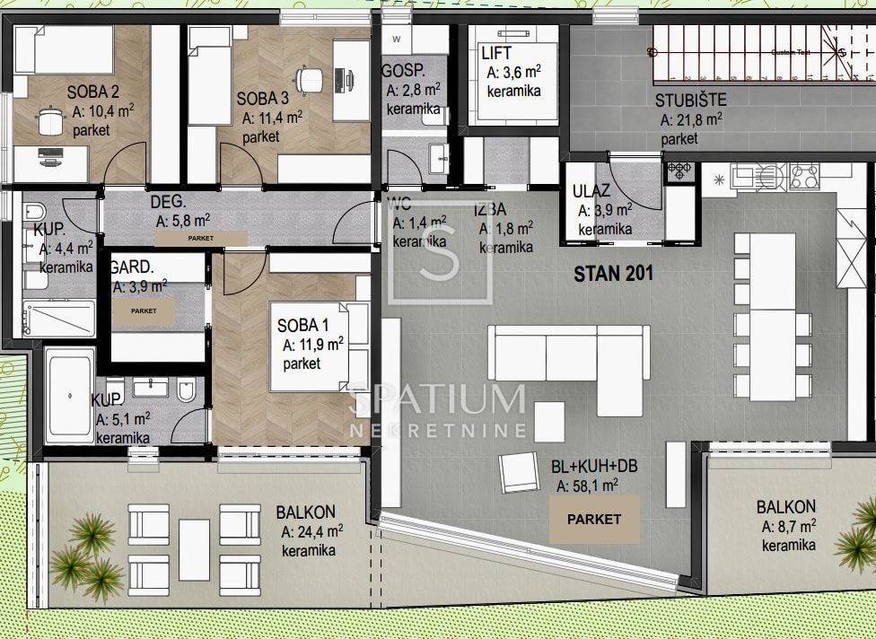 OPATIJA, we offer an extremely spacious apartment on the first floor of an excellent new building with an elevator within walking distance of the first beach and the center of Opatija. The excellent first impression is contributed by the beautiful Chevron parquet that adorns most of the apartment and, combined with natural light, creates a warm, comfortable atmosphere. The central room of 58 square meters is the true definition of an open concept intended for the living room, dining room and kitchen, from which a view of the sea extends thanks to large glass walls that are also characterized by excellent sound insulation. The sea view is not absent from the master bedroom, which has a separate dressing room, balcony access and en-suite bathroom. Two additional bedrooms share a second modernly decorated bathroom, while the guest toilet is next to the utility room. High-quality floor and wall coverings and interior and exterior joinery were used during the furnishing. The property is also characterized by sophisticated details that complete the overall impression. Two balconies offer enough space for a carefree morning coffee or an evening glass of wine in the company of family and friends. The apartment includes two garage parking spaces and a storage room. The advertised purchase price includes VAT, so buyers of this property are exempt from paying real estate tax. Opatija, a beautiful coastal town on the Adriatic Sea and a famous 19th-century health resort, is a popular destination for tourists from all over the world. The city is surrounded by unique natural beauty. It is located below Mount Učka, a favorite destination for hikers and hikers, at the crossroads between the green Istrian region and the coast, creating a perfect balance of landscape. The city offers a beautiful view of the sea and the nearby islands of Krk and Cres. It is surrounded by charming historic towns with narrow streets and rich history. Opatija is adorned with a large number of unusual sights, a large number of beaches, clear sea, and its city streets are dotted with houses of interesting architecture and villas from the Habsburg era. For further information, please contact us with confidence. Goran Božić Licensed agent +385 98 186 5413 goran@spatium.hr Spatium nekretnine +385 51 272 903 info@spatium.hr