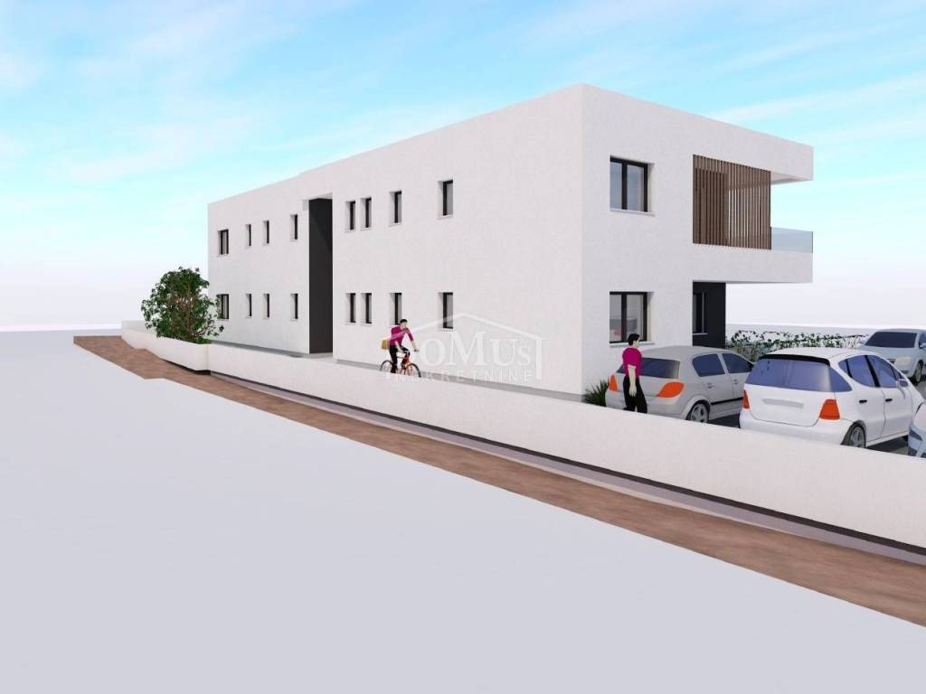 Vodice, new building, apartment on the 1st floor of a building with a total of four residential units. Apartment S3 is located on the 1st floor of the building, oriented to the south, with a total usable area of 84.89 m2. It consists of a hallway, toilet, bathroom, storage room, 3 bedrooms, a large living room with kitchen and dining room and access to a balcony. The apartment has one outdoor parking space. The property is 1500 m from the beach and 1300 m from the town center. The planned move-in date is summer 2026.