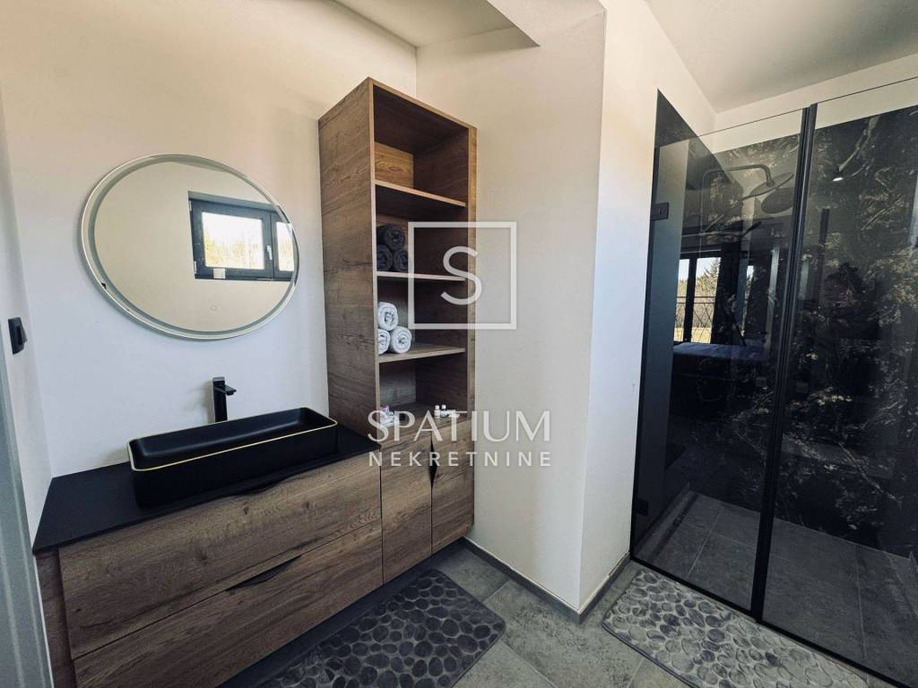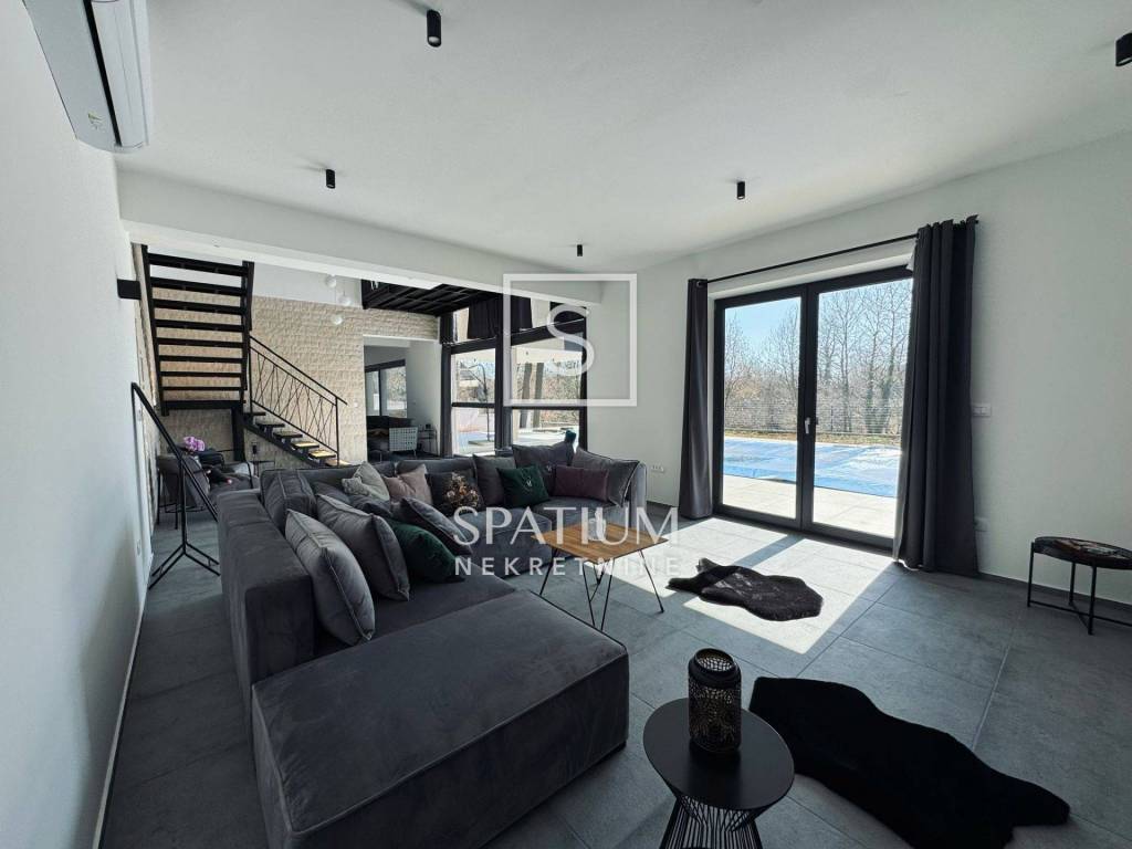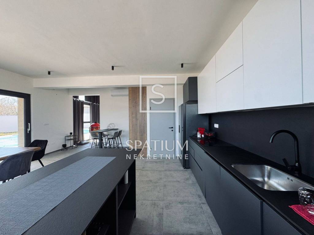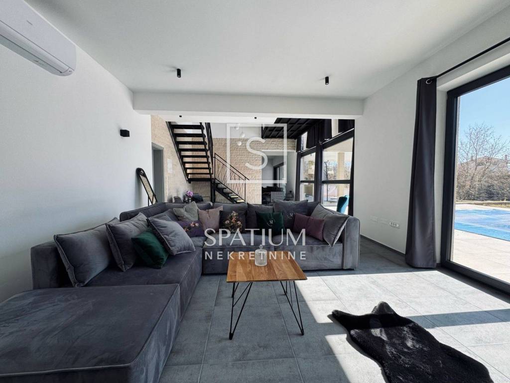 MARČANA, we offer a beautiful modern villa situated in a peaceful setting near Marčana. The villa is located on a plot of 664 m². The property consists of a basement and ground floor with a total area of 268 m². The basement features a bright entrance hall, storage room, guest toilet, kitchen with dining area, spacious living room with access to a covered terrace and a 36 m² swimming pool, as well as a pool equipment room. The upper floor houses three bedrooms, each with its own en-suite bathroom, and a laundry room. The villa is air-conditioned, has a landscaped garden, parking for 2–3 cars, and is being sold fully equipped and furnished.