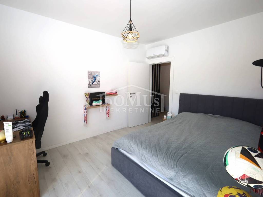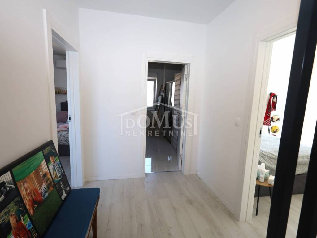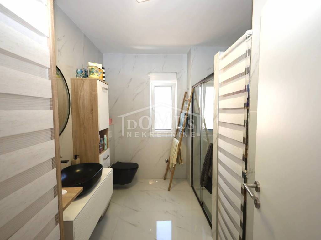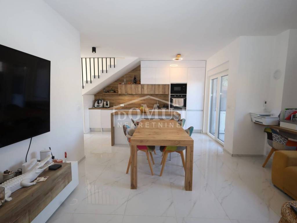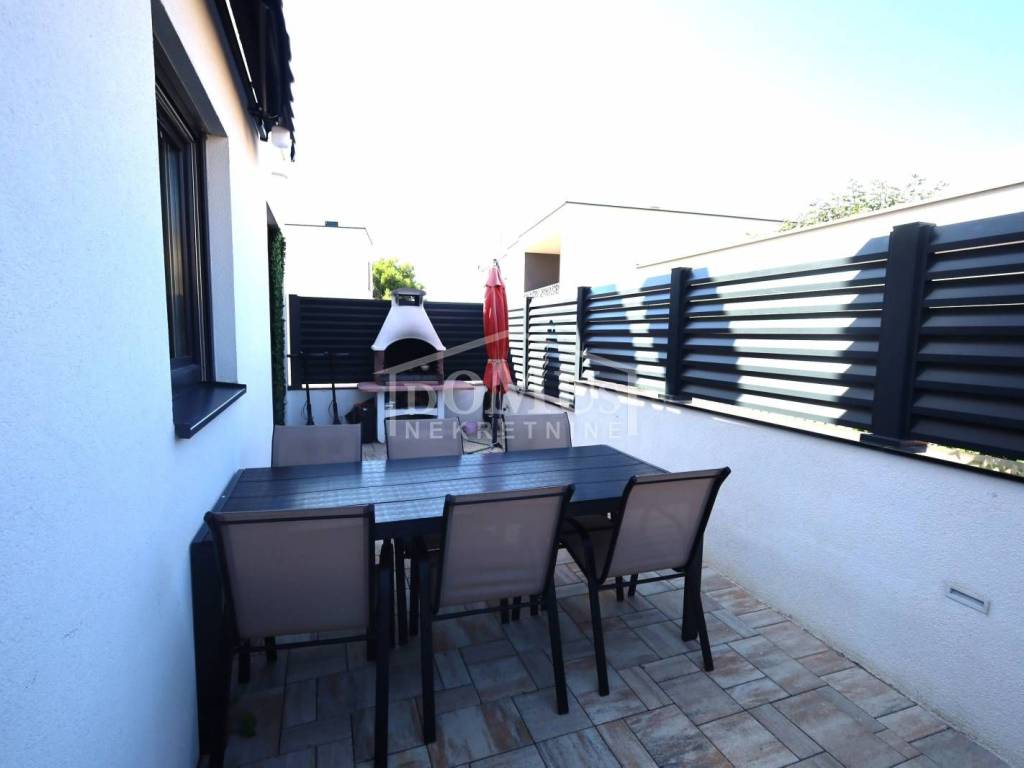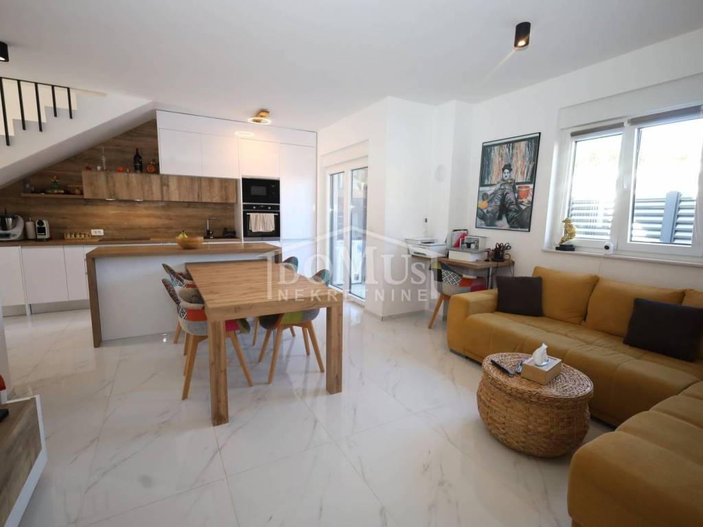 In a quiet location, a modern family house with a functional layout. The house is a semi-detached property on two floors (ground floor + first floor), with a total usable area of 99.08 m², including a yard of approximately 82 m² and parking space for two cars.The ground floor consists of a hallway, a bathroom, one bedroom, a spacious living room with dining area, a kitchen, and access to the garden. Interior stairs lead to the first floor, which includes a hallway, two bedrooms, and a bathroom.The house is fully furnished, and the furniture is included in the property price. It is equipped with security doors, PVC joinery with built-in shutters, electric shutter lifts, high-quality ceramic flooring, underfloor heating in all bathrooms and the living room, and air conditioning in the living room and each bedroom.