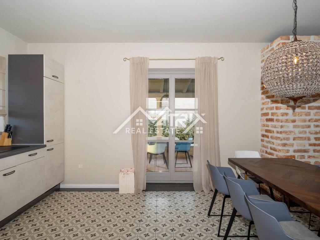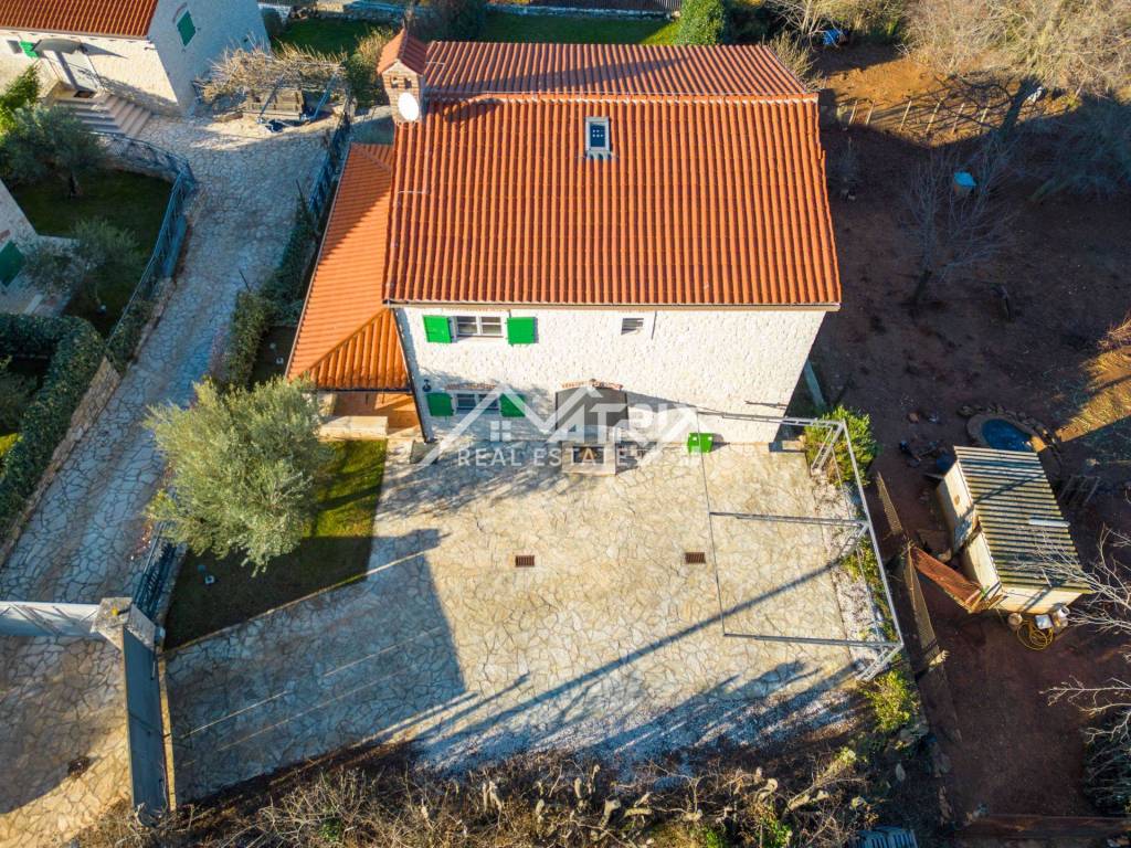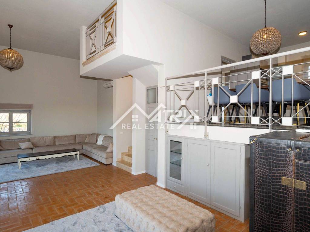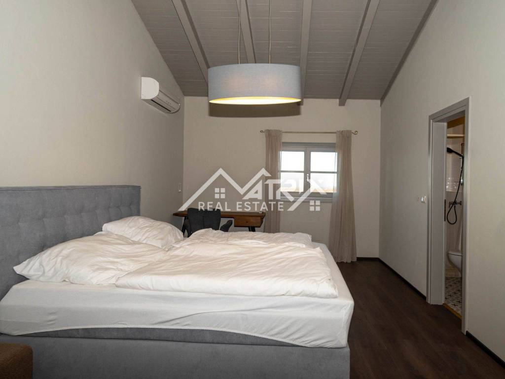This rustic beauty consists of three floors. Upon entering, we are greeted by a spacious kitchen with a dining room, which leads to a terrace with a view of nature and the sea. A spacious bedroom is also located on the same floor. Inside the villa, we go down the stairs to the ground floor, where the living room dominates with large windows that fill the space with light. This space opens onto the courtyard, creating a perfect combination of indoor and outdoor space. On the first floor, there are four additional rooms, two of which have a private bathroom and two of which are shared.