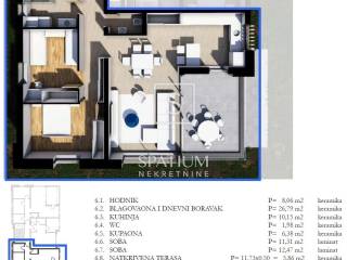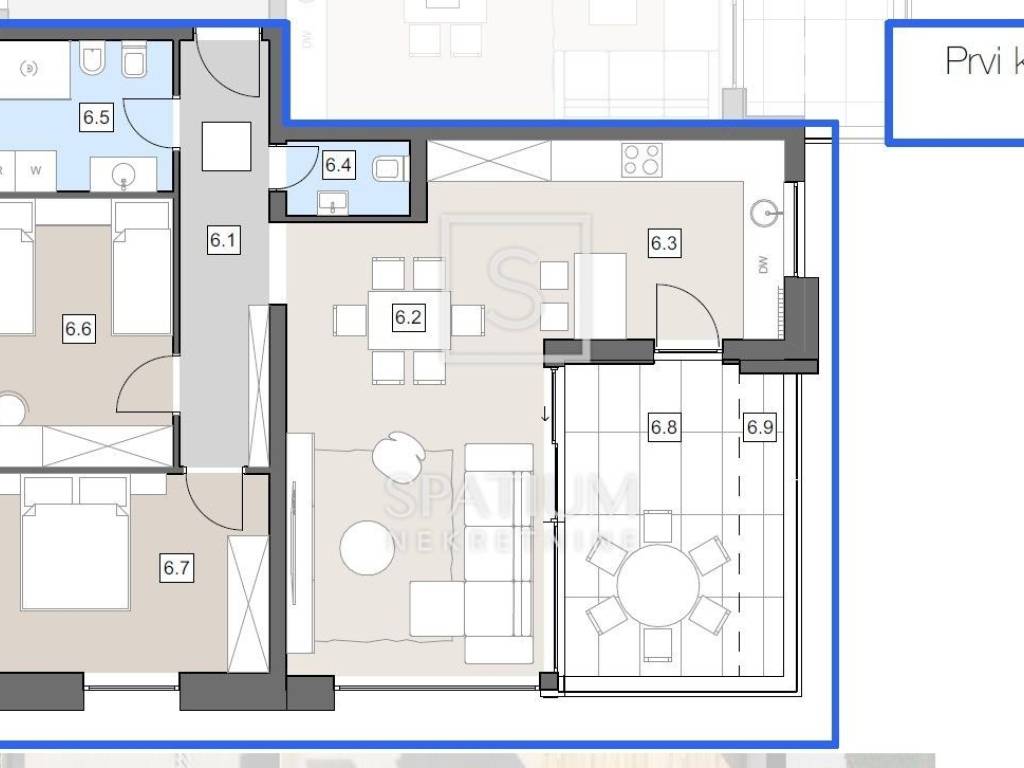 LABIN, we are pleased to present a modern and spacious apartment of 83.72 m², located on the first floor of a high-quality urban villa consisting of a total of three levels. The apartment is carefully designed to provide maximum comfort and functionality, and it consists of two bedrooms, a bathroom, an additional toilet, a hallway, and an open-concept living area that combines the kitchen, dining room, and living room with access to a covered terrace. Thanks to large glass walls, the space is filled with natural light, creating a pleasant atmosphere throughout the day. Durable and high-quality materials are used, and the project is designed to meet the highest standards of modern living. Planned construction completion is in June 2027, while handover is scheduled for December 2027.