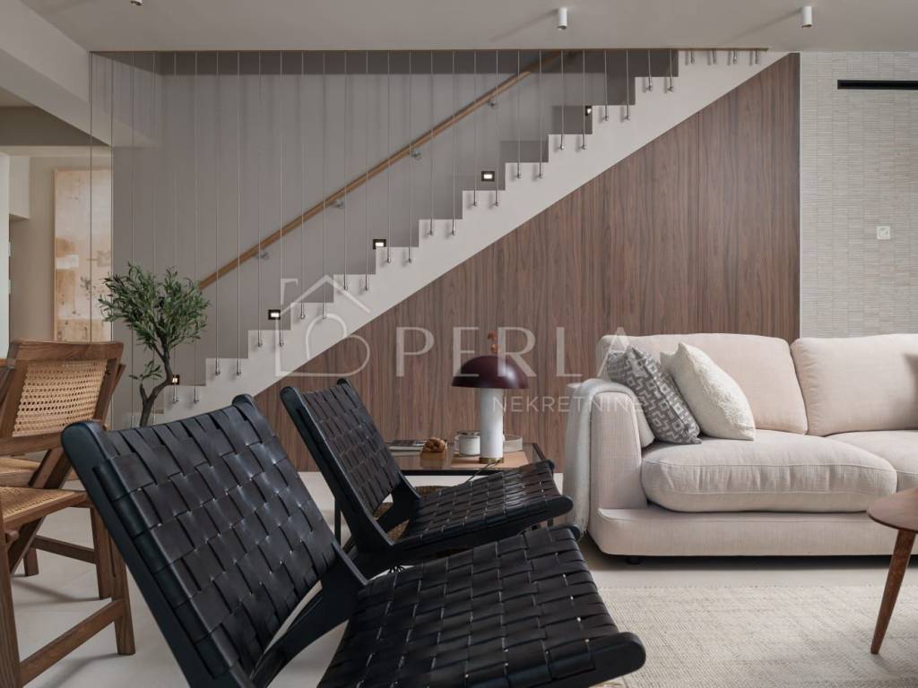 On the ground floor, through the entrance area, you enter the open concept kitchen with dining room, living room which is connected by glass walls to the outside of the house where there is a heated 25 m2 swimming pool lined with mosaic and a large covered terrace of 22 m2.