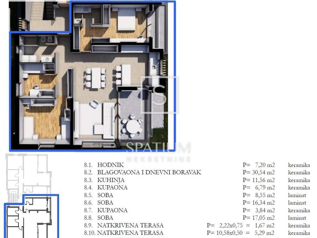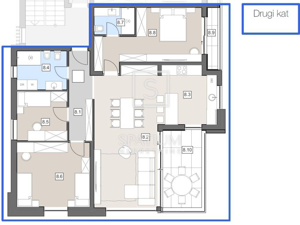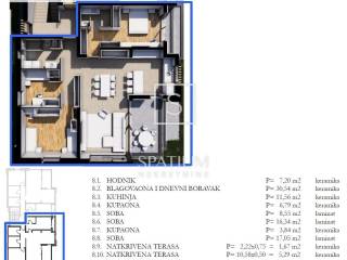 LABIN, we are pleased to present a modern and spacious apartment of 108.83 m², located on the second floor of a high-quality urban villa consisting of a total of three levels. The apartment is carefully designed to provide maximum comfort and functionality and consists of three bedrooms, two bathrooms, a hallway, and an open-concept living space that connects the kitchen, dining area, and living room with access to a covered terrace. Thanks to large glass walls, the space is filled with natural light, creating a pleasant atmosphere throughout the day. Durable and high-quality materials are used, and the project is designed to meet the highest standards of modern living. Planned construction completion is in June 2027, while handover is scheduled for December 2027.