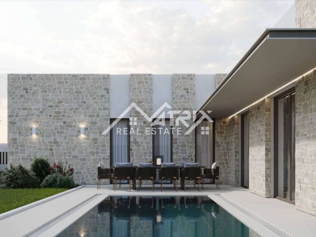 A conceptual design has been created for a modern single-story house featuring a living room, kitchen, dining area, three bedrooms each with its own bathroom, a small guest toilet, and an outdoor swimming pool.