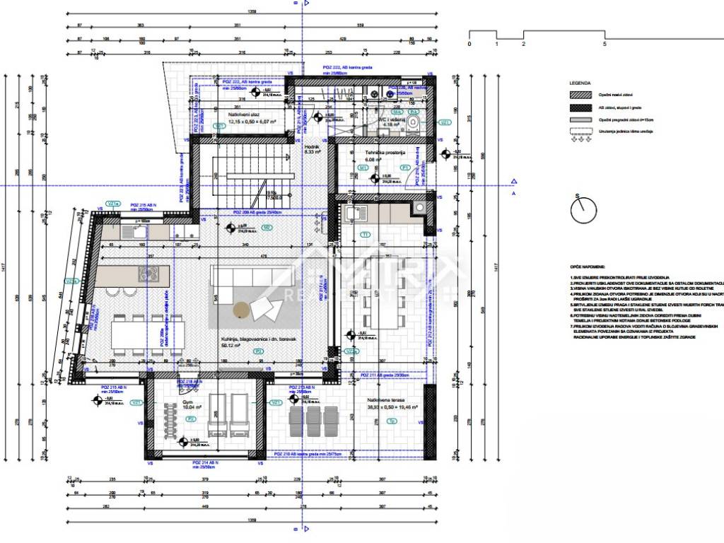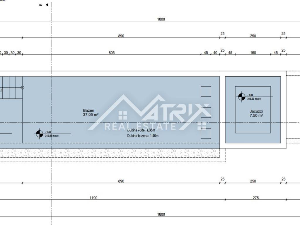 In addition to the villa, there is an auxiliary building – a garage with a net surface area of 43.28 m², providing ample parking space and additional storage. One of the key features of this property is the impressive swimming pool of 45.99 m², of which 37.05 m² is designated for swimming, while the jacuzzi section covers 7.50 m².
