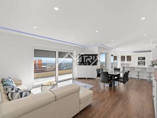 The apartment is situated in a newly built, modern building on the second floor, offering an impressive panoramic view. With 105 m², it features an open-space living room, kitchen, and dining area, three spacious bedrooms, each with its own elegant bathroom, and one bedroom with access to a large, sunny terrace. Thanks to large glass walls, the apartment is filled with natural light, while the living room and kitchen open onto a spacious terrace with a breathtaking sea view.