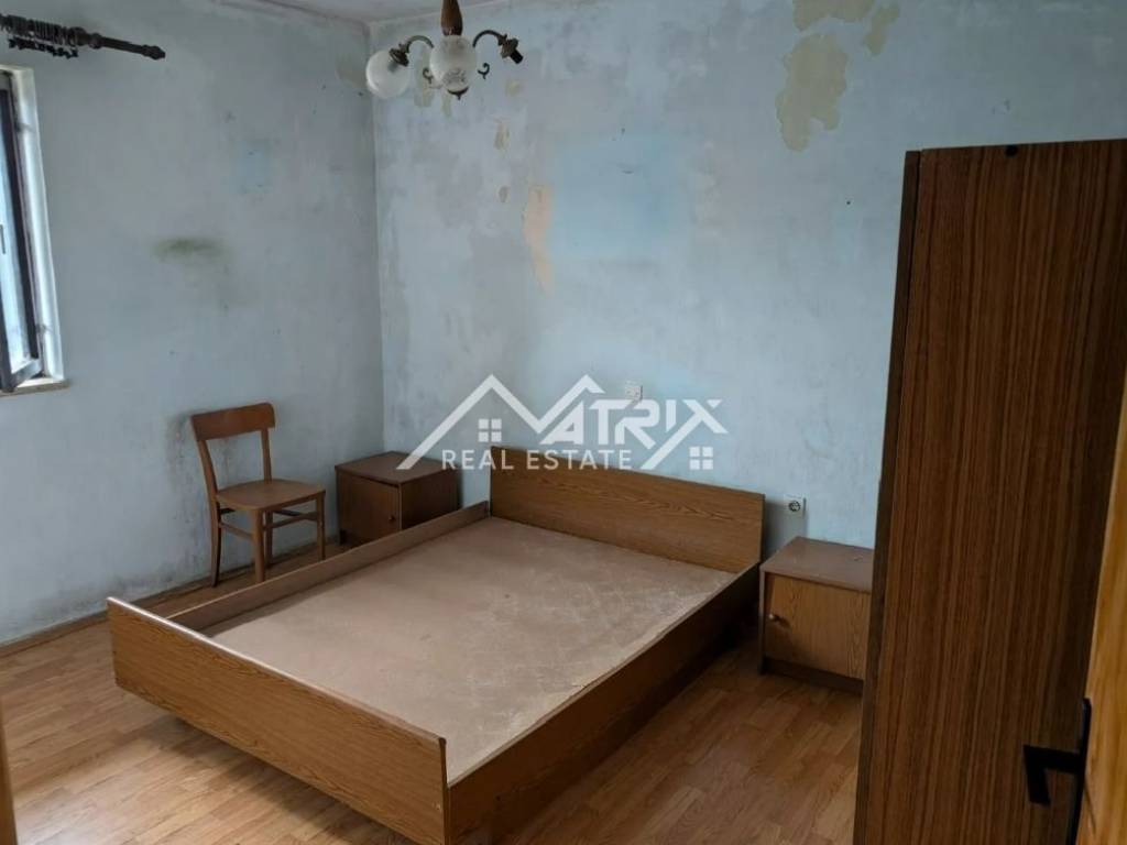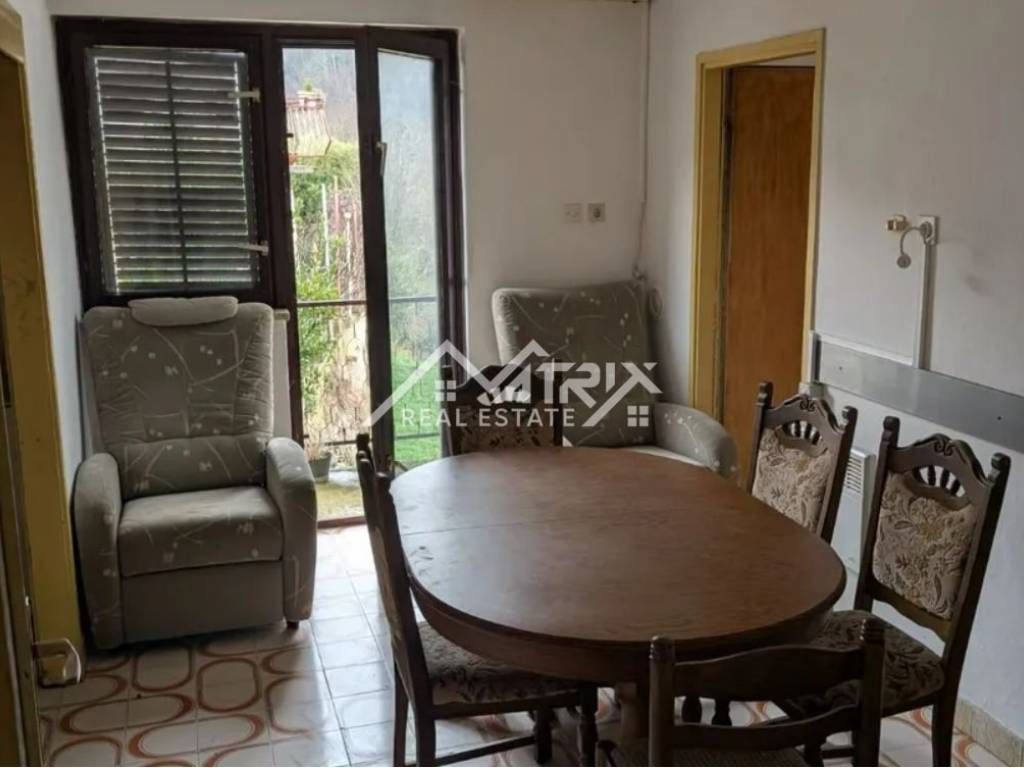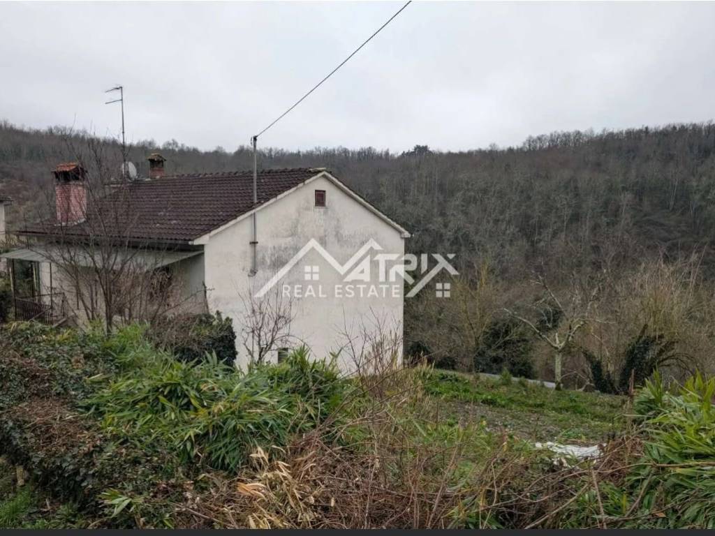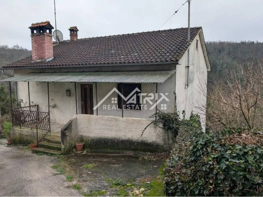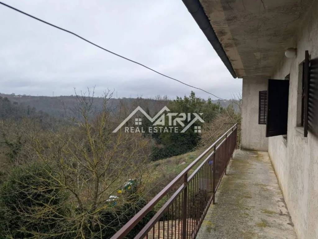 A detached house for sale near Pazin. The house is habitable but requires renovation. It consists of two floors. The residential part includes: a hallway, 3 bedrooms, a kitchen with dining area, a living room with access to a terrace offering a view of nature. The house also has two more terraces — one at the entrance and a smaller one — as well as a bathroom. The ground floor consists of a small room that can be used as a smokehouse, a tavern or wine cellar, and a double garage with access to the garden. The house has approximately 260 m² and a yard of 109 m². Dimensions: 10.35 x 12.55 x 2 floors. Two smaller agricultural plots are also included — 237 m² and 52 m² — located about 500 meters from the house.