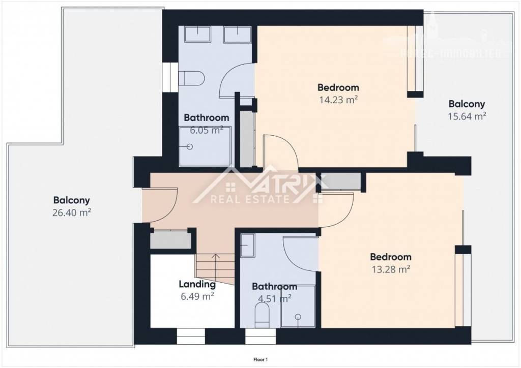 Upstairs there are two bedrooms, each with its own bathroom and access to a shared south-facing terrace. Another terrace is oriented to the north.