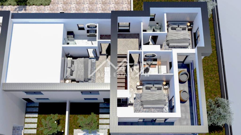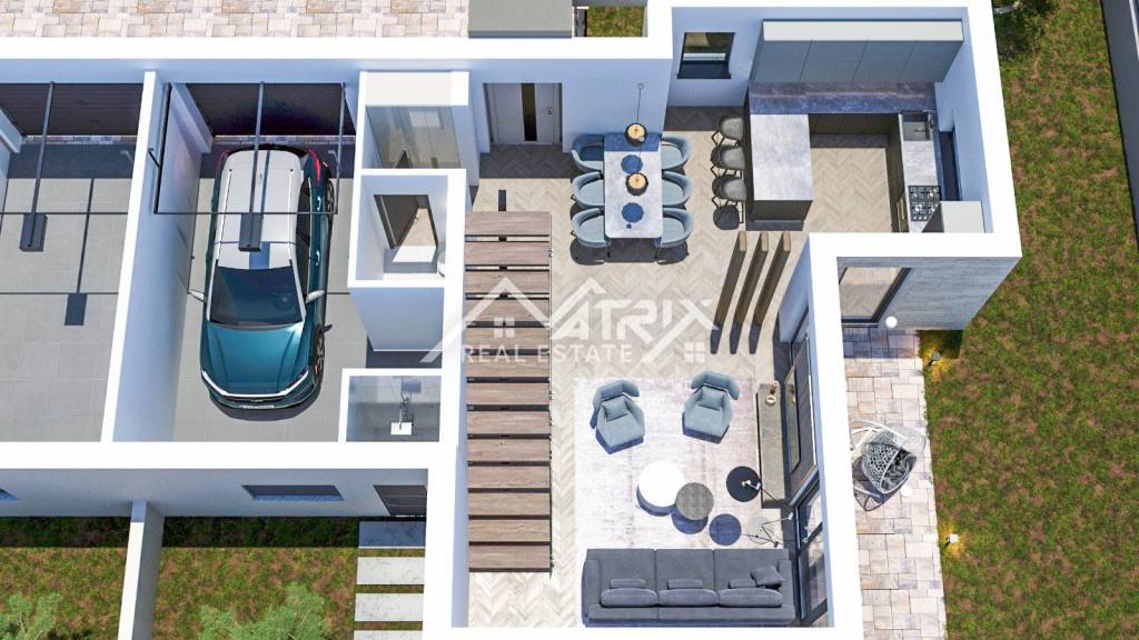 The house is spread over two floors, ground floor and first floor. On the ground floor there is a large open-space area that unites the living room with kitchen and dining room, with access to the pool terrace through large glass walls. In addition, on the ground floor there is a guest toilet, storage room, and a garage for one car. Internal stairs lead to the first floor where there are three bedrooms, each with its own bathroom. Two bedrooms have direct access to a covered terrace with a beautiful open view.