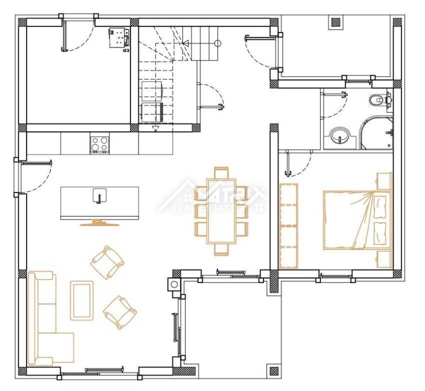 The house extends over the ground floor and first floor, with a total living area of 161 m2. The ground floor of the house is designed as an open space that unites the living room with dining room and kitchen, bedroom, bathroom, corridor, storage room and technical room. The living room leads to the pool terrace through large glass walls. Internal stairs lead to the first floor, where there are 3 bedrooms, a bathroom and a hallway.