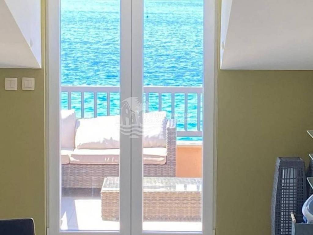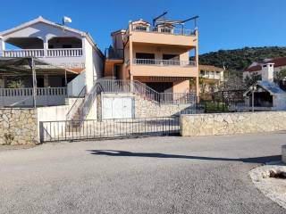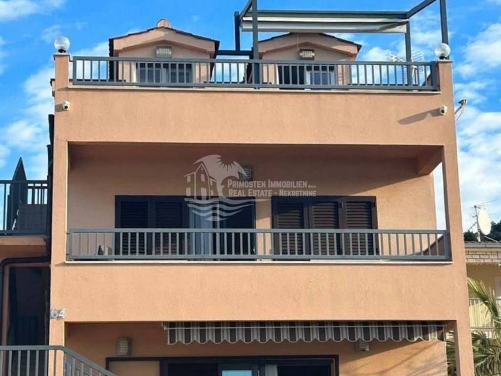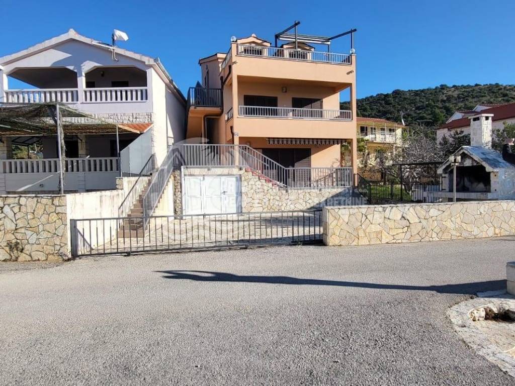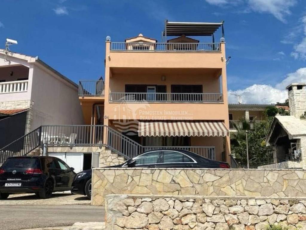 Beautiful house in the vicinity of Rogoznica in an exceptionally good location, first row to the sea. The house has a living area of ​​400 m2 and is spread over 3 floors with separate entrances. The ground floor consists of a kitchen, living room and dining room, two bedrooms and a bathroom. On the first floor there is a kitchen, living room and dining room, bathroom, and four bedrooms. An external staircase leads to the second floor, where there are three bedrooms, a bathroom, living room, dining room and kitchen. The terrace offers a beautiful, unobstructed view of the sea. There is also a separate studio apartment here, consisting of a bedroom, bathroom and kitchen with a living room. The house is extremely well maintained and is being sold fully furnished. In front of the house there are outdoor parking spaces for several cars, and the house also has a garage. The rooms in the house are air-conditioned.