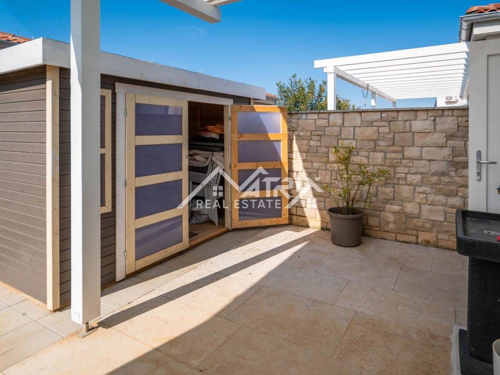 The fully fenced and beautifully landscaped 181 m² yard includes a private pool, sunbathing area, and additional storage space. The house is sold fully furnished with high-quality, contemporary furniture, and air conditioning ensures comfort throughout the year.