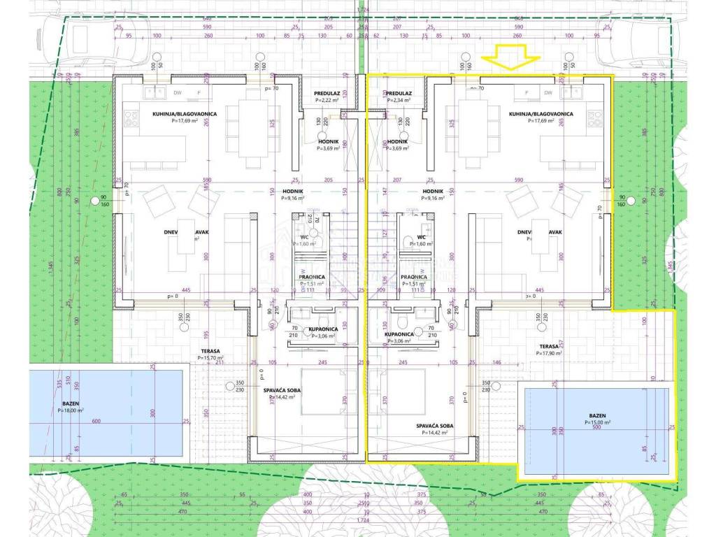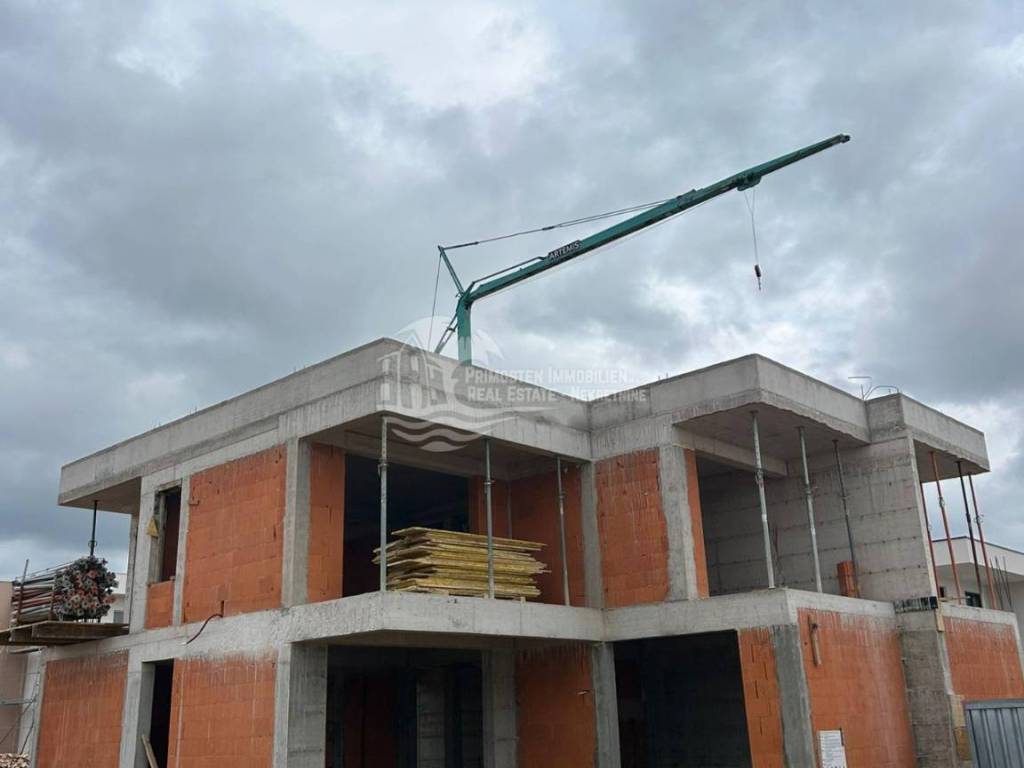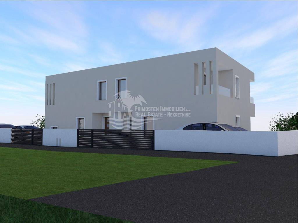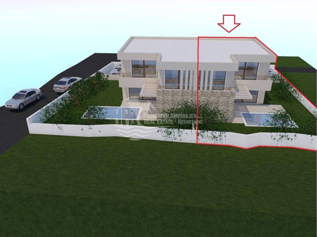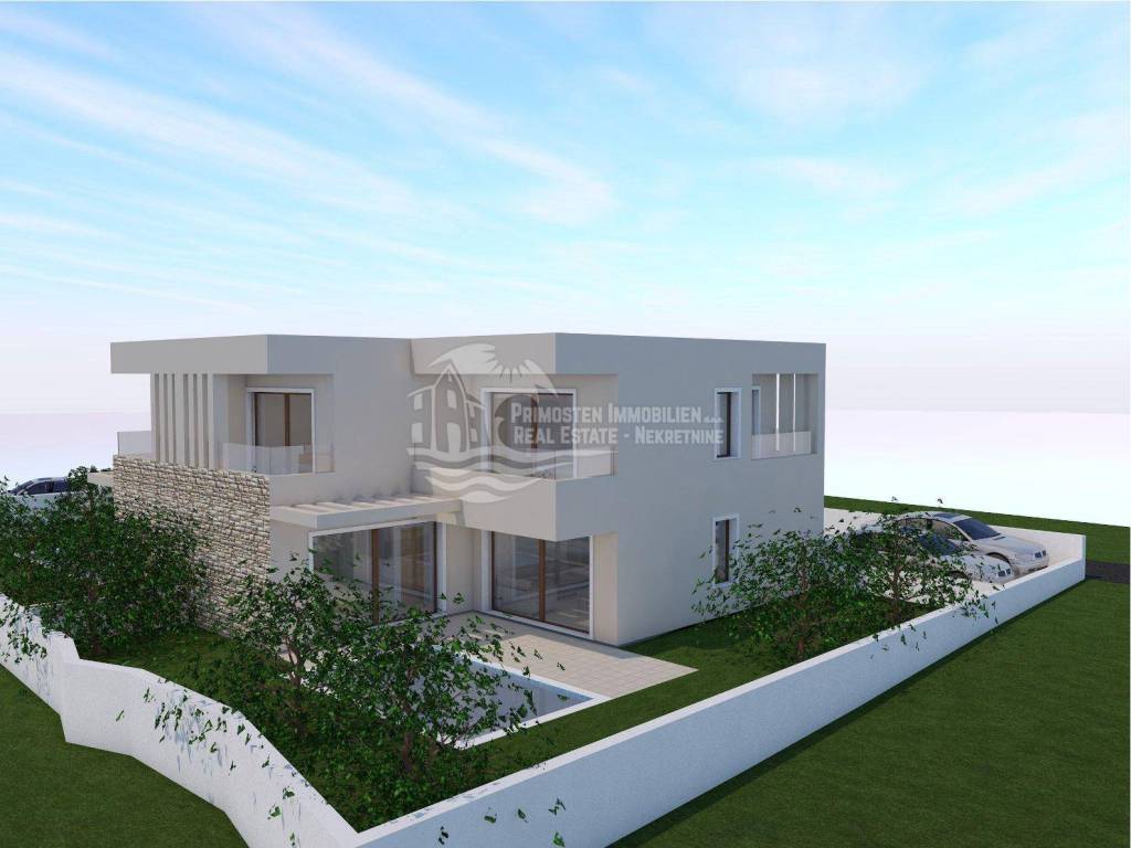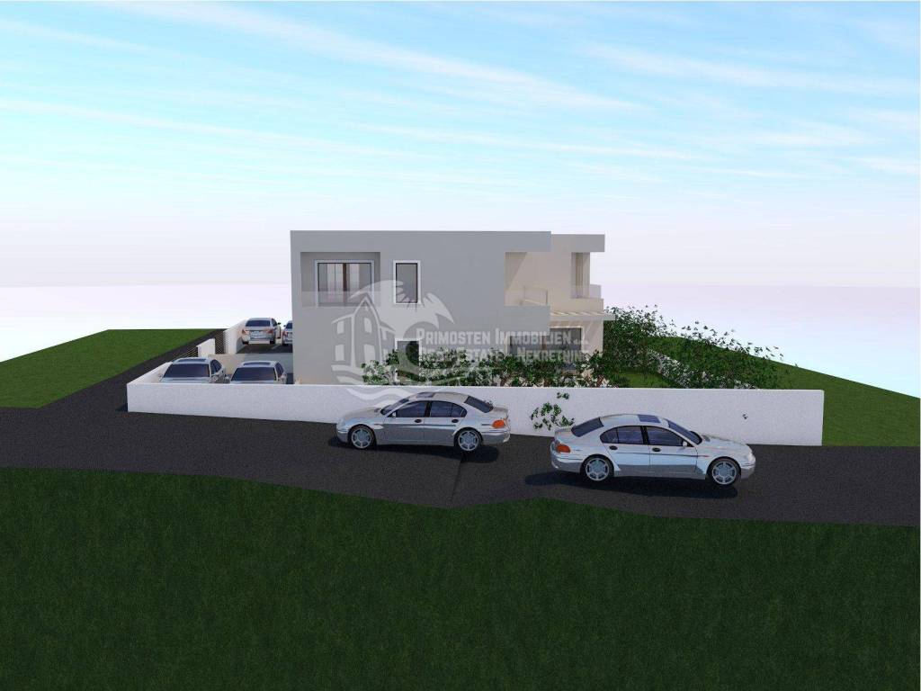 This modern semi-detached house is located in a highly desirable and central area of Vodice, approximately 800 meters from the town center, the seaside promenade, and popular beaches. Despite its proximity to all amenities, the property enjoys a quiet residential setting away from busy roads, making it suitable for both private use and short- or long-term rental. The property is being built on a plot of approx. 317 m² and offers a gross living area of approx. 174.73 m², complemented by a swimming pool of approx. 18 m², spacious outdoor areas, and two private outdoor parking spaces.