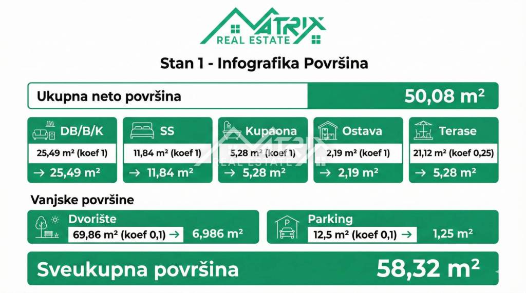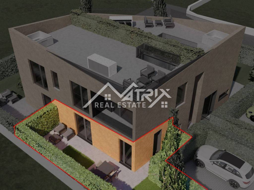 In a peaceful setting in the Poreč area, within a modern residential building of only 5 apartments, Apartment 1 on the ground floor is for sale. The apartment offers 50.08 m² of net calculated area: 44.80 m² of indoor space plus a 21.12 m² covered terrace (calculated by coefficient). Added value comes with the outdoor areas: a 69.86 m² garden (calculated 6.986 m²) and a 12.5 m² parking space (calculated 1.25 m²), bringing the total calculated area to 58.32 m².