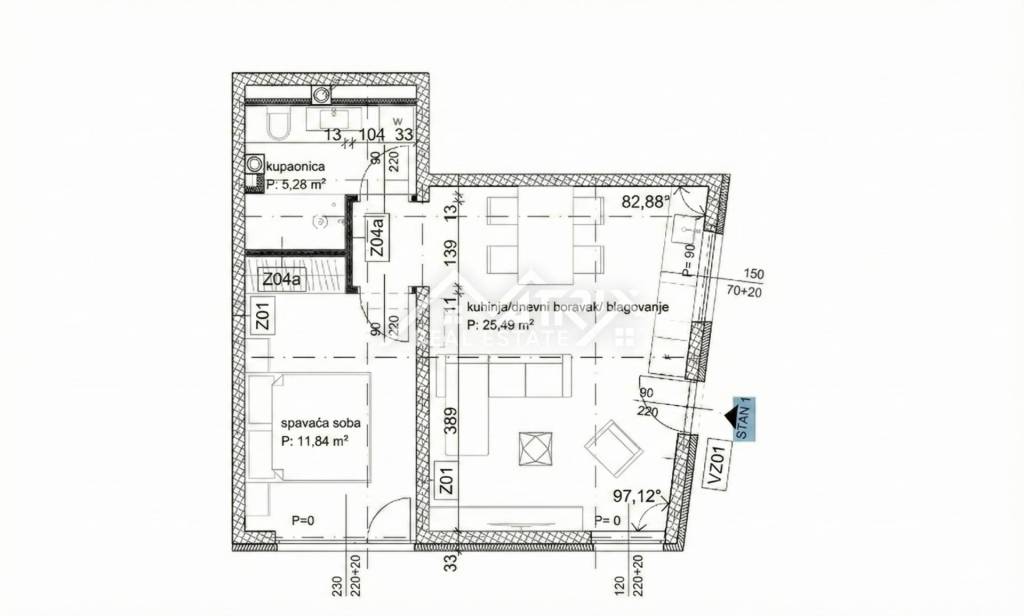 The layout is practical and comfortable: an open-plan living room with kitchen and dining area (25.49 m²), one bedroom (11.84 m²), a bathroom (5.28 m²) and a storage room (2.19 m²). The terrace is perfect for morning coffee and relaxing, while the ground-floor position offers easy access and a pleasant private outdoor corner.