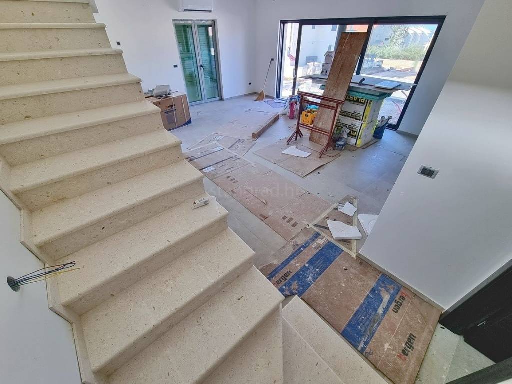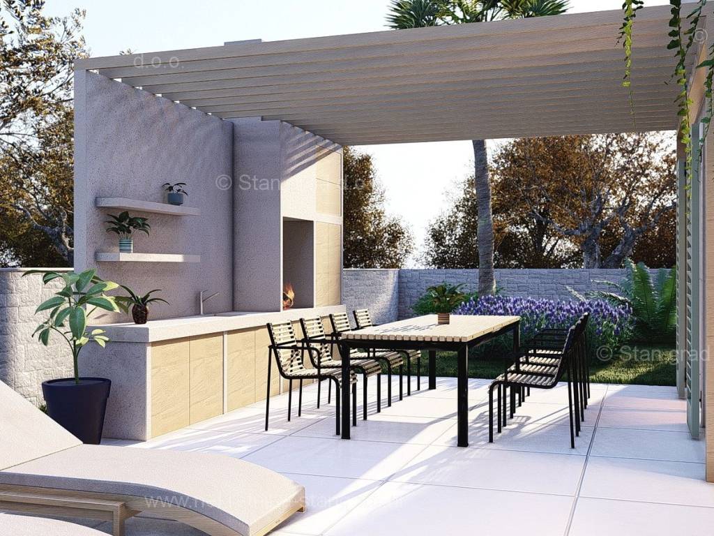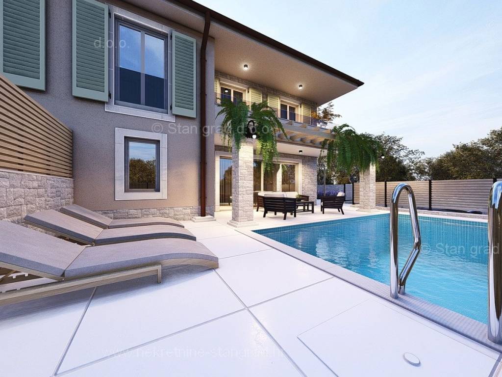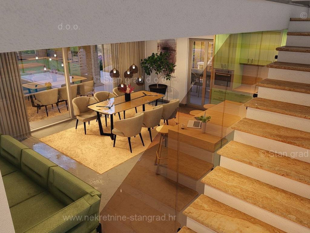 In the real estate offer of the agency Stan Grad Immobilien in the Croatian coast, on the island of Krk, there is a very attractive house perfect for a tourist stay and vacation or living on the coast of the Adriatic Sea. The prominent house is located in a nice location not too far from the center of the famous town of Malinska. The modernly designed house includes useful space on a total of 2 floors, ground floor and first floor. The property covers a total area of 139 m2. The mentioned area contains the entrance area, open space living room with kitchen and dining room, bathroom and large terrace on the ground floor, and on the first floor there is a hallway, bedroom, bathroom and two more bedrooms, each with its own bathroom and balcony. The property has a well-kept garden with a swimming pool, an outdoor shower, a sundeck and a summer kitchen. Two cars can be comfortably parked in the garden of the described property. In addition to all of the above, it is important to say that the house has a good view of the sea and the coast. The real estate in question is owned by a legal entity and in the VAT system. The real estate seller guarantees a quick transfer of ownership rights and proper ownership and technical documentation. Contact us in person or by phone, we will try to answer all your questions. In addition to the presentation of the real estate and its legal status and conducting negotiations with the real estate agent, our expert team will assist the buyer in transferring ownership of the house and transferring bills for electricity, water supply and utility services to his name.