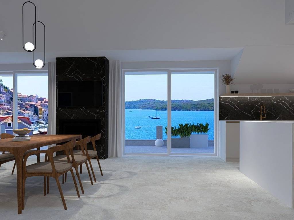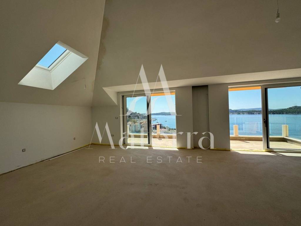 For sale is a luxurious apartment with a surface area of 138 m², located in a fully renovated building with an elevator. The building is situated just 50 meters from the sea, offering a unique view of the old town, the fortress, and the sea. The entire exterior surrounding the buildings will be landscaped and greened, and each apartment comes with a secured parking space. Next to the building, there are both indoor and outdoor public swimming pools, which can be used year-round. Below the building, there is a seaside promenade leading to the old town center, and Banj beach is just 70 meters from the building. The entire building is south-facing, providing all apartments with an unobstructed sea view.