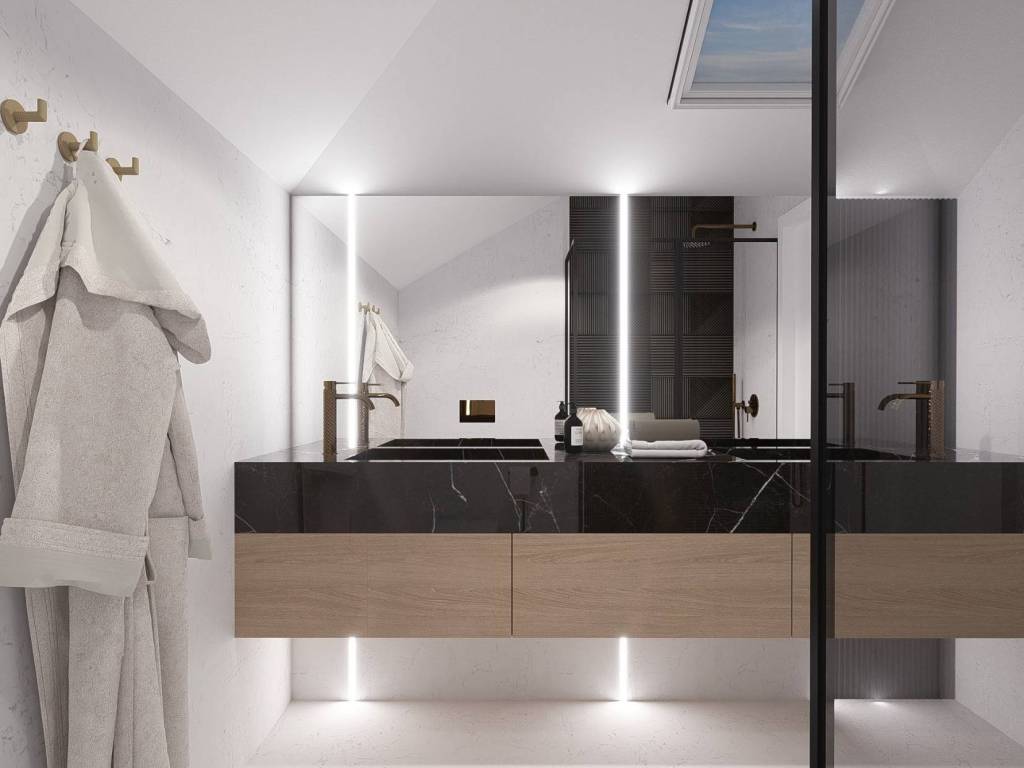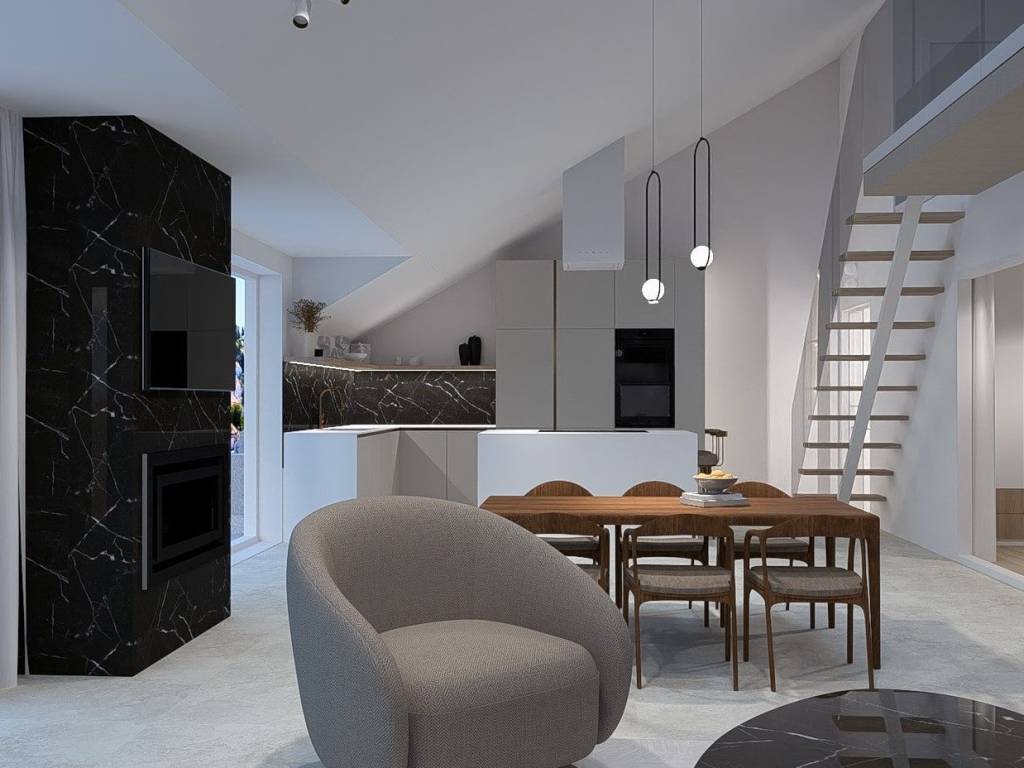 The apartment has a usable area of 138 m². It consists of an entrance area, a kitchen, a dining room, and an open-plan living area with access to a spacious terrace. There are 3 bedrooms, two of which feature built-in glass walls offering views of the sea and the Šibenik channel. The master bedroom includes a walk-in closet and a bathroom. The apartment has 3 bathrooms in total. What makes this apartment unique is the gallery, designed as a workspace or an additional bedroom, which also has its own bathroom.