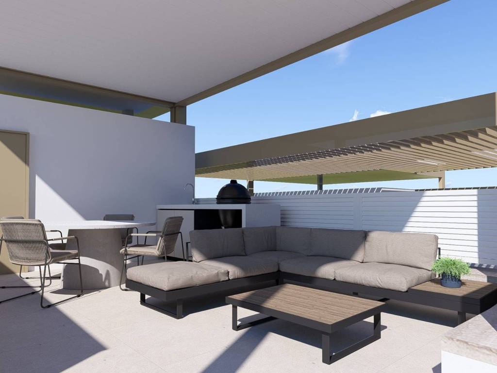 The building, designed to evoke the shape of a sail mast, spans two floors and is equipped with an elevator. All apartments have a secured parking space in the underground garage as well as an outdoor parking space. Built to the highest standards, the building offers everything modern living requires—underfloor heating throughout the apartment, air conditioning, PVC windows with insect screens, electric shutters, and a southern orientation that provides plenty of natural light throughout the day.