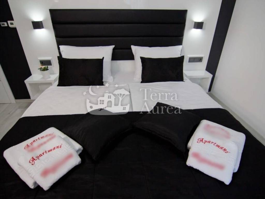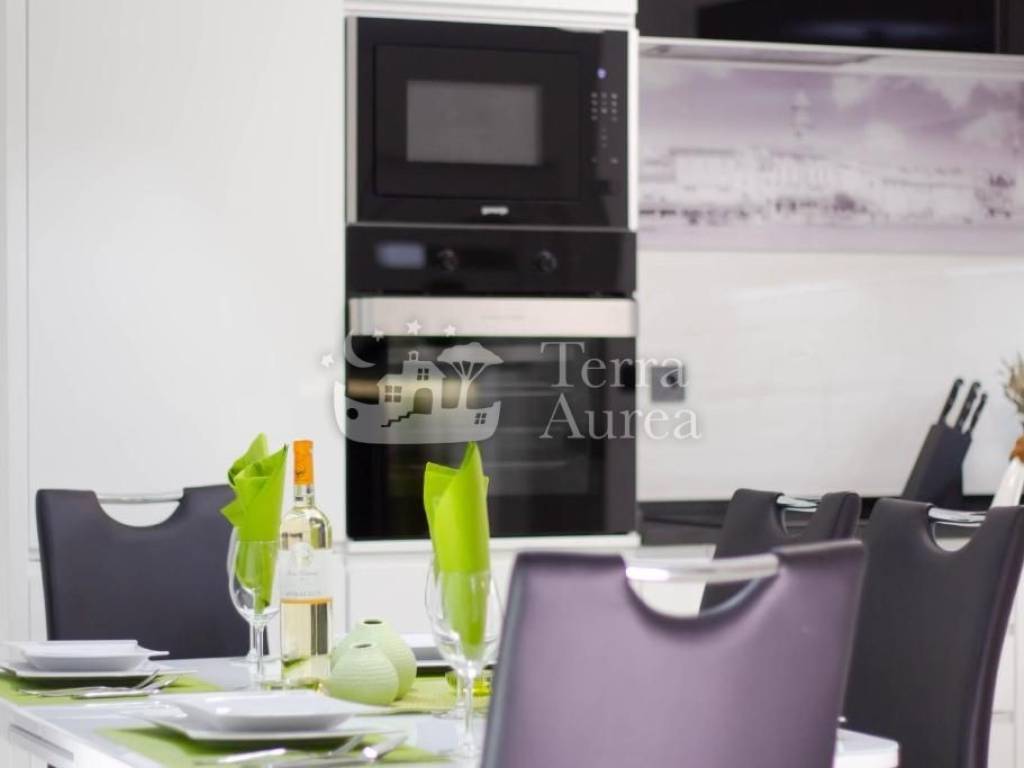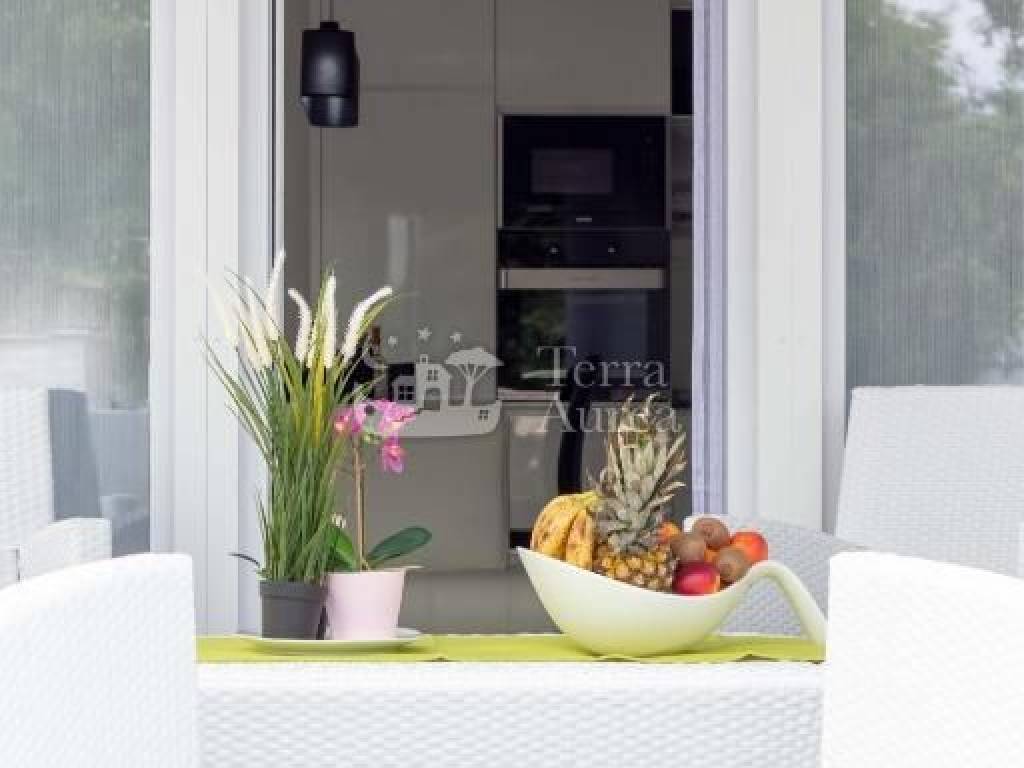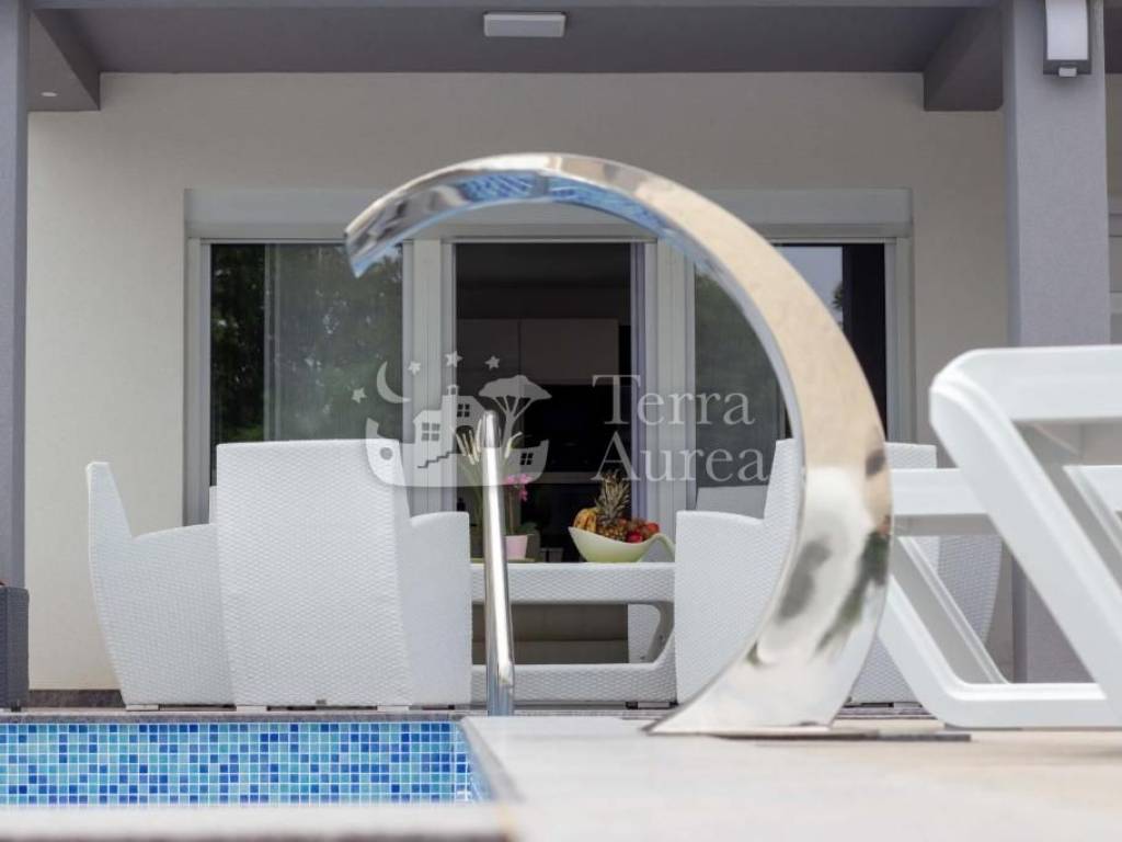 On the ground floor of the villa there is an apartment that includes a hallway, a spacious living room with a modern kitchen and dining room, two elegantly decorated bedrooms and a bathroom. The living room has access to a covered terrace that leads to a beautifully landscaped garden with a swimming pool and sunbathing area. This space provides the perfect dose of privacy and isolation, ideal for complete relaxation.