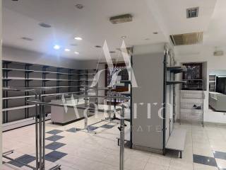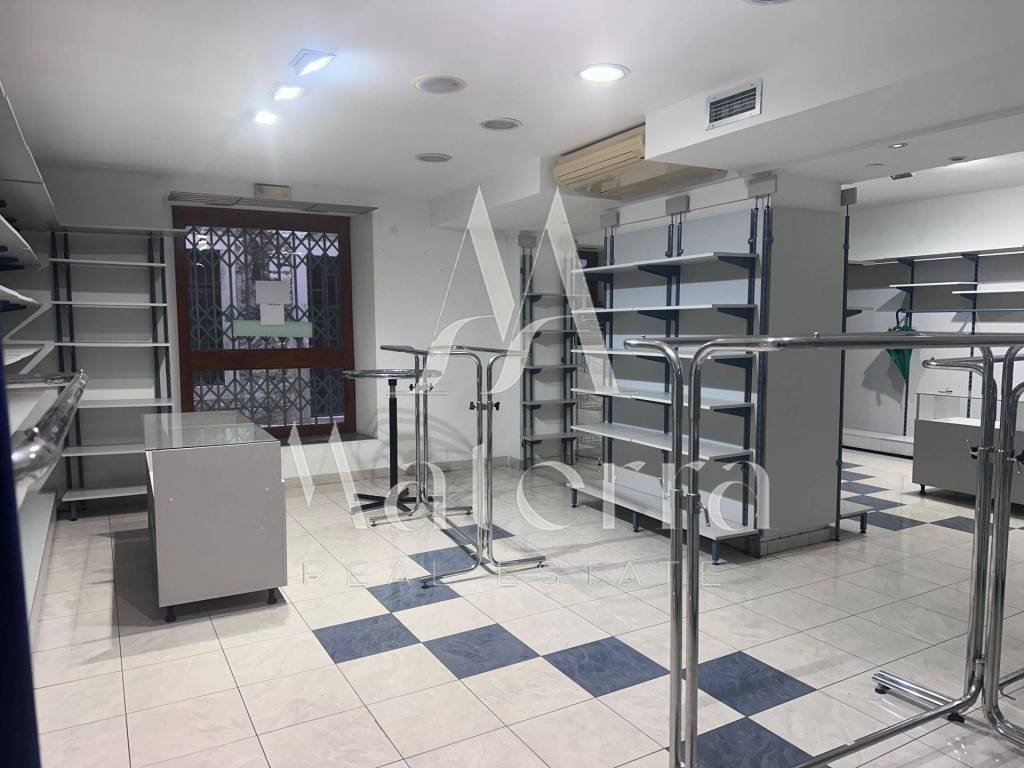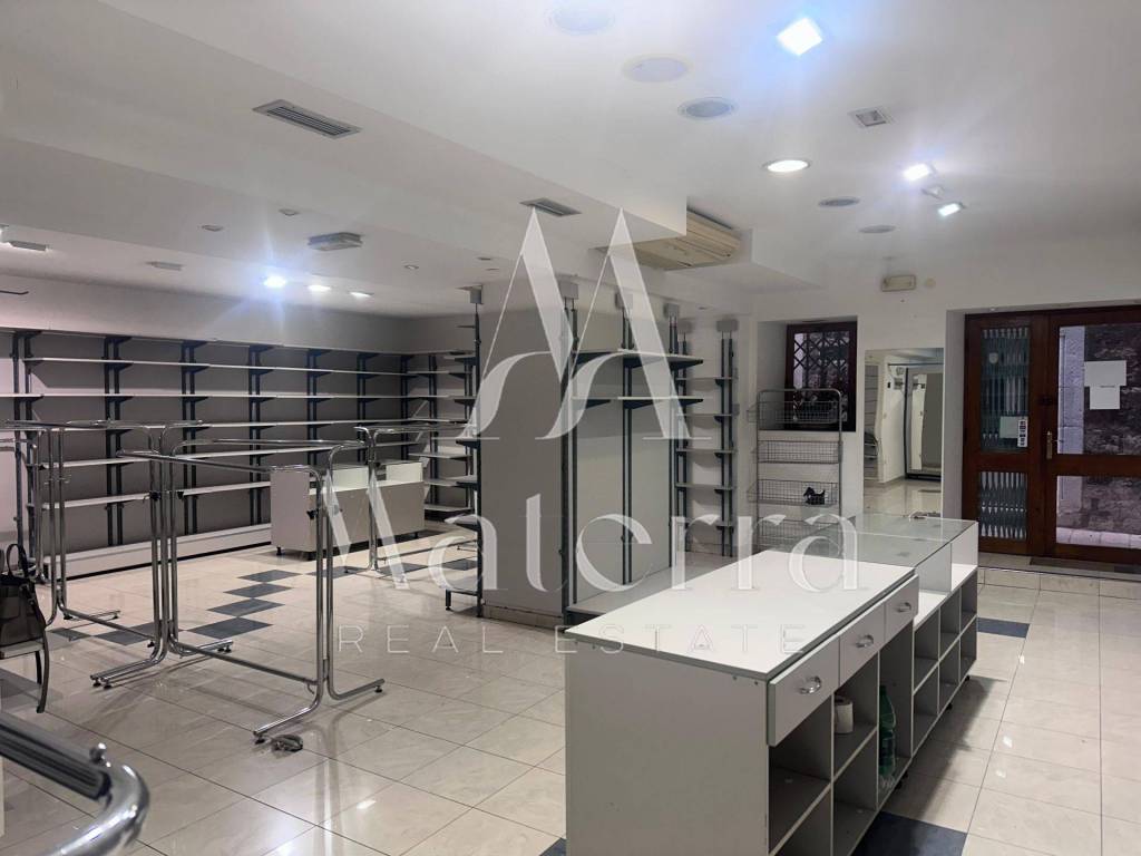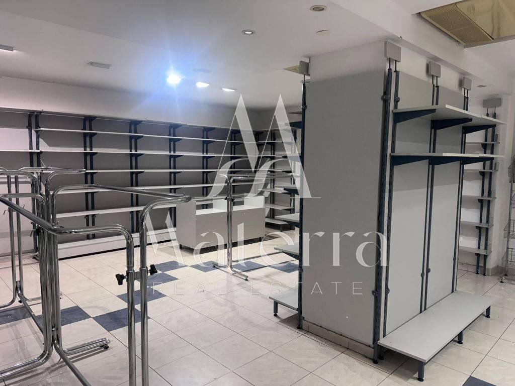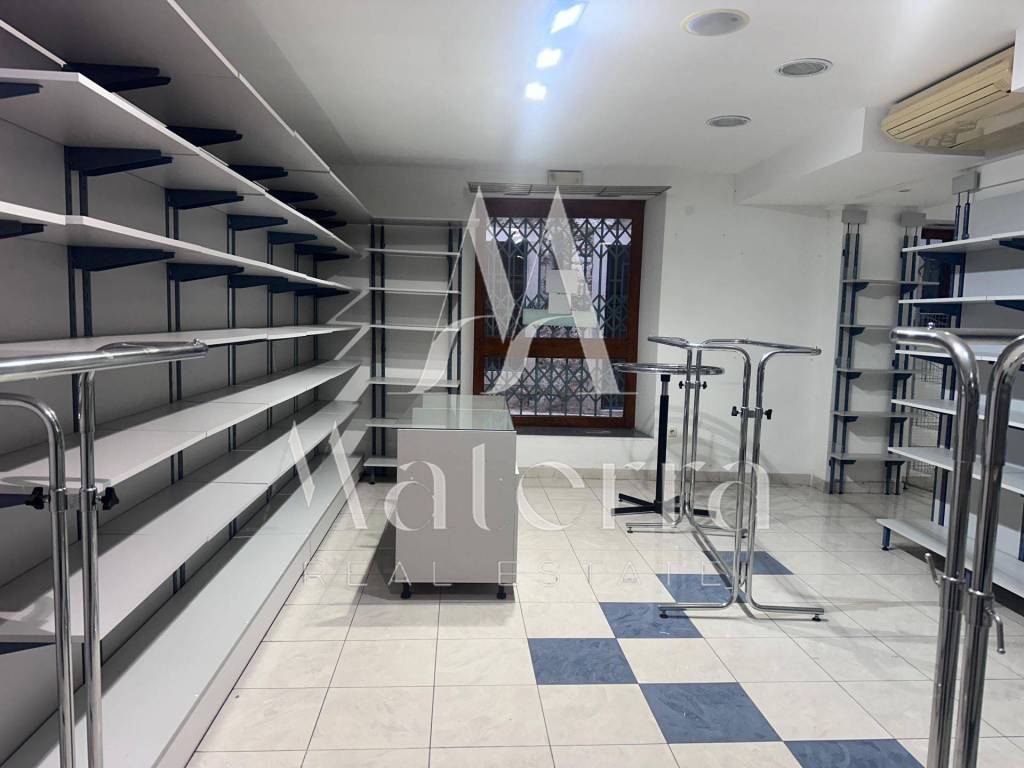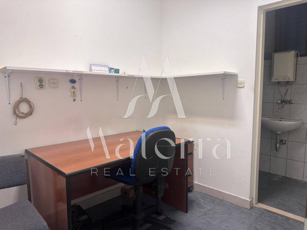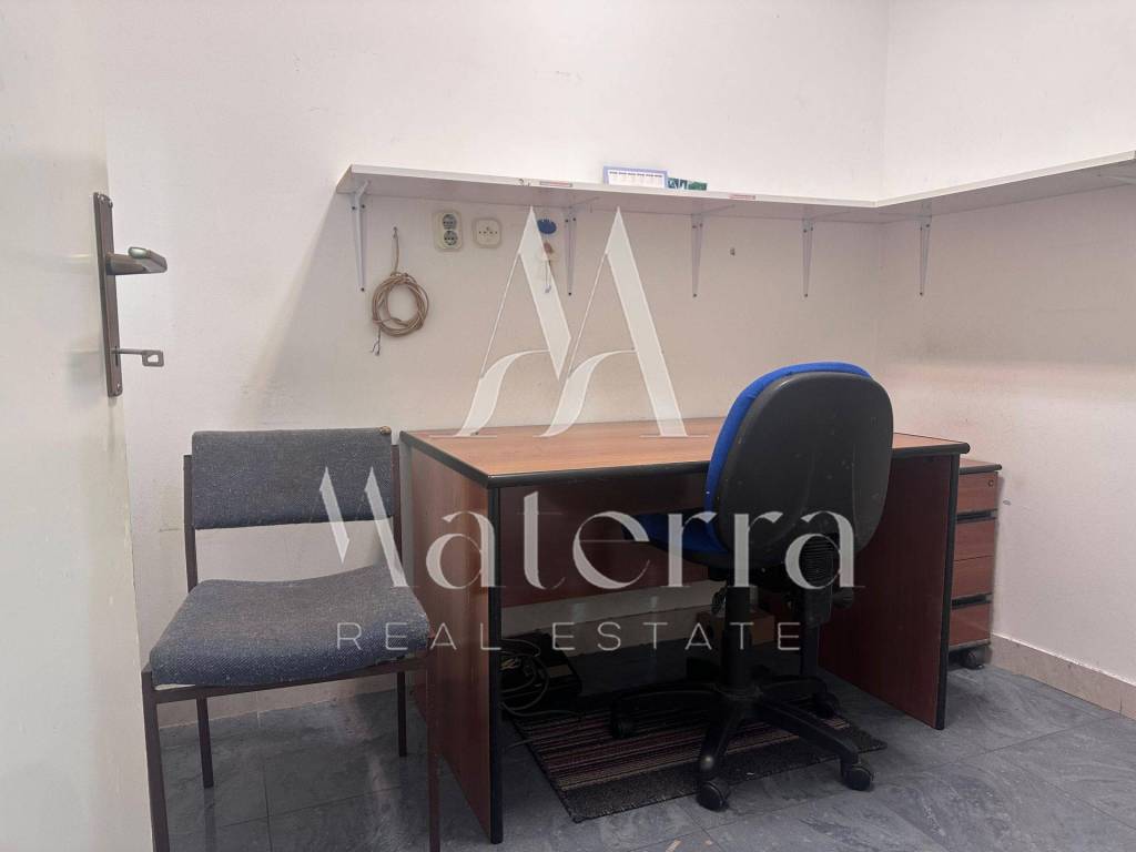 The layout includes a spacious main area suitable for retail, office, or service activities, a smaller separate office, and a sanitary facility. The space is equipped with air conditioning, ventilation, independent water and electricity connections, as well as telephone installations.