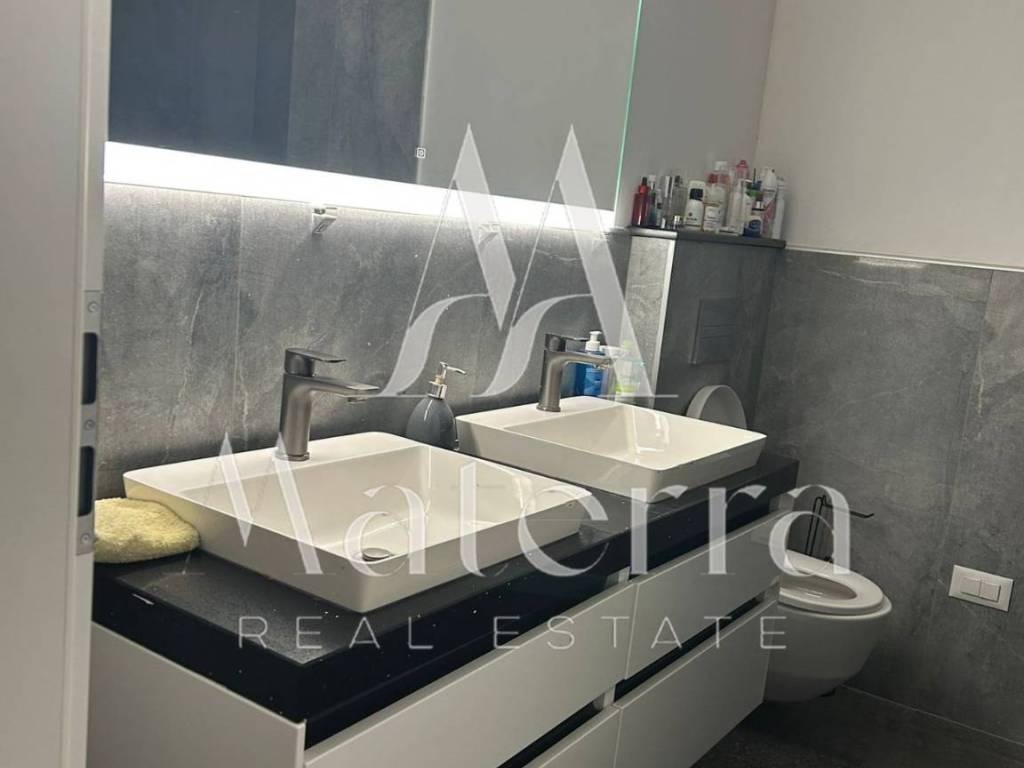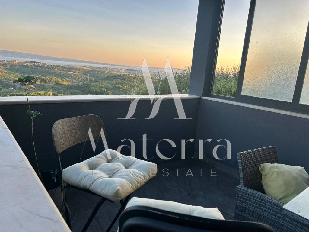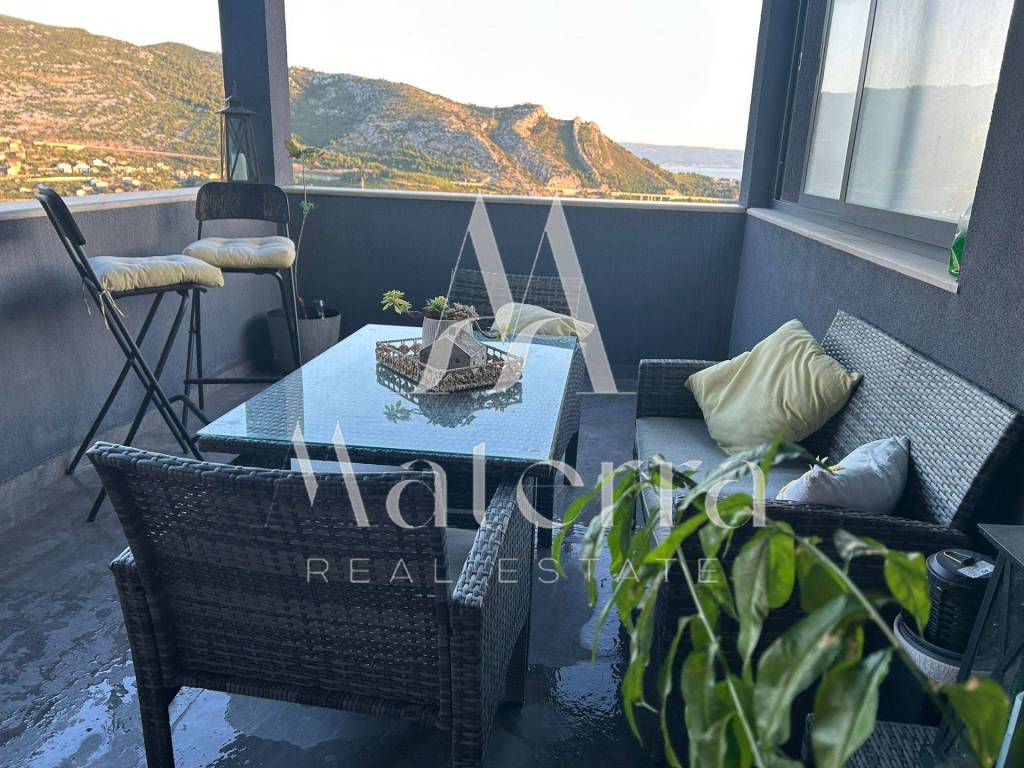 New building, completed in 2022 108 m² of living space Two spacious bedrooms Large terrace with an open view Luxuriously furnished interior Sold fully furnished (move-in ready) One bathroom and one separate WC Underfloor heating in the bathroom and WC Designer sanitary facilities Panoramic view of Split, the sea, and Klis Fortress Private parking space included