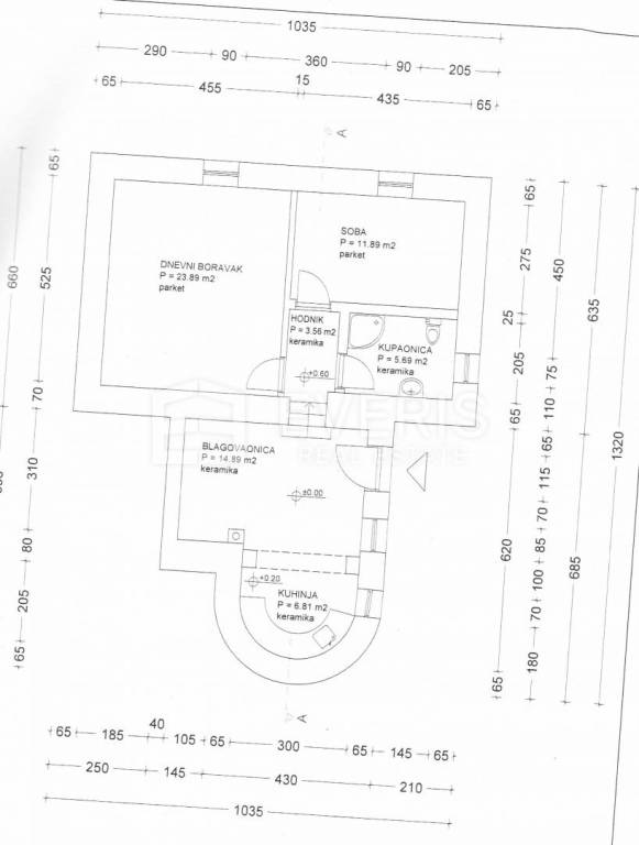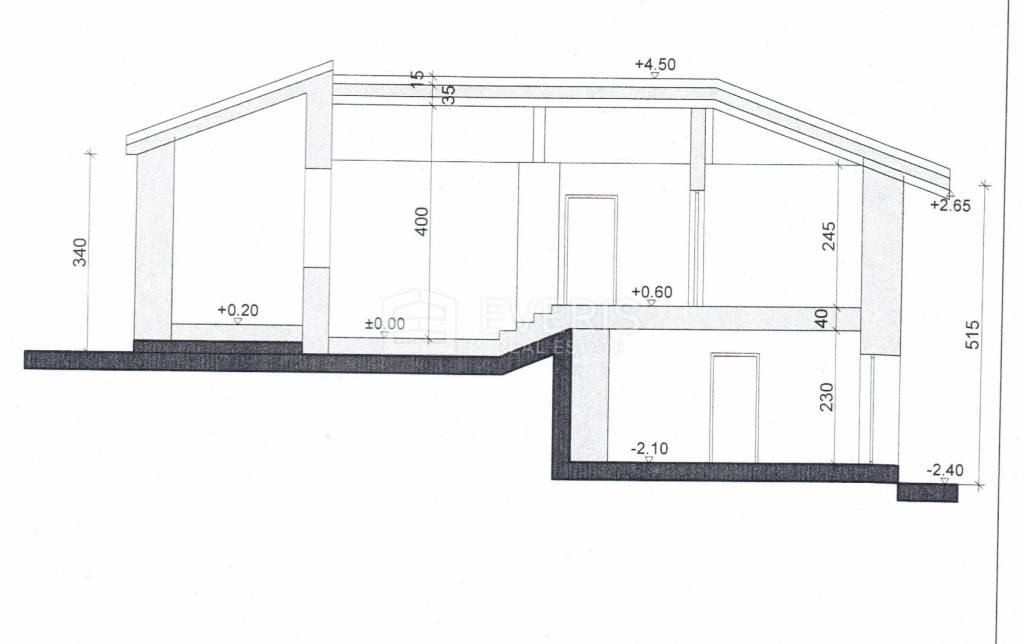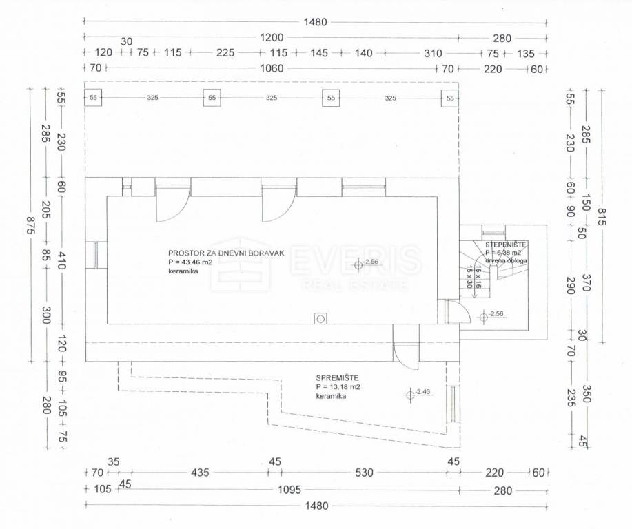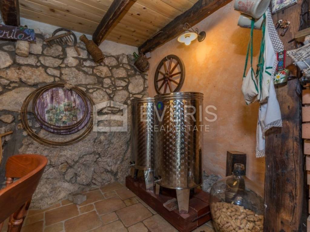 The first house, with a total area of 103.11 m2, consists of a storage room and a furnished tavern in the basement of 36.38 m2, and a kitchen, dining room, hallway, large living room and bedroom on the ground floor of 66.73 m2.