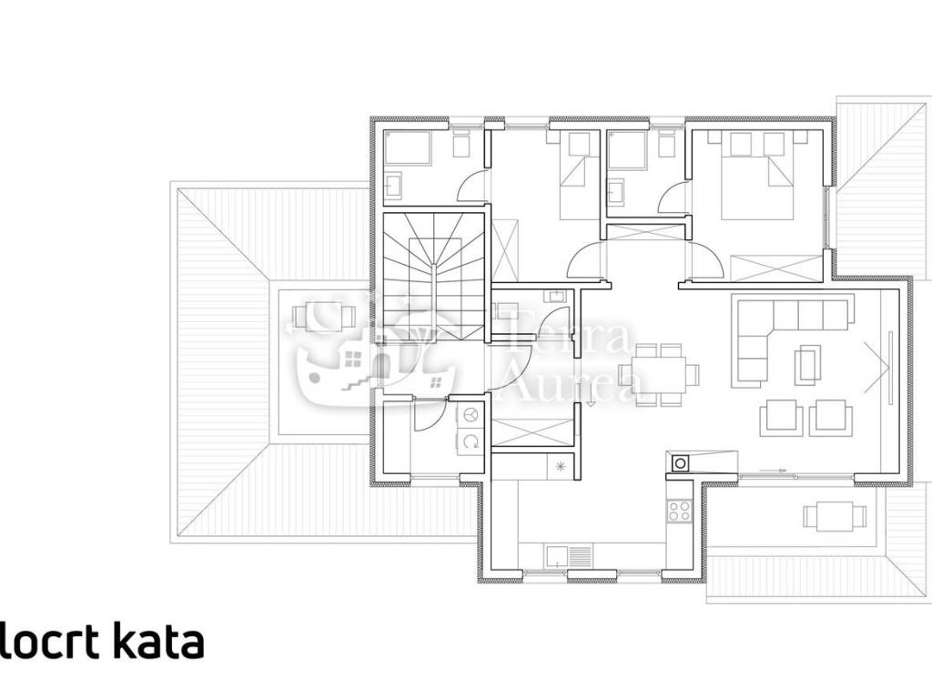 On the first floor there is a second two-bedroom apartment with a modernly decorated living room and kitchen in an open space concept, access to a large uncovered terrace, two bedrooms with private bathrooms, an additional toilet, an entrance hall with a wardrobe, as well as a shared laundry room and a staircase.