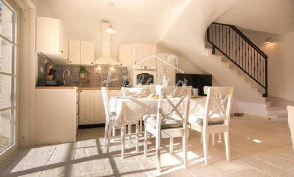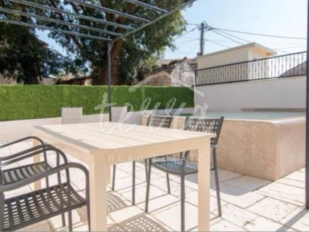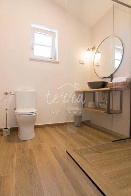 Beautiful house with swimming pool, Barban area. This beautiful house, decorated in a traditional and rustic style with a courtyard and swimming pool, is located in a quiet village. The house was built in 2023 on a plot of 442m2 with a living area of 85m2. It is spread over two floors. On the ground floor there is an entrance hall, living room, kitchen and dining room, bathroom and laundry room. On the first floor there are two bedrooms, each with its own bathroom and a balcony. The yard is landscaped and has a terrace with a summer kitchen, a sunbathing area and a swimming pool with built-in electrolysis. The house has two parking spaces. An ideal investment for a quiet family life or tourism.