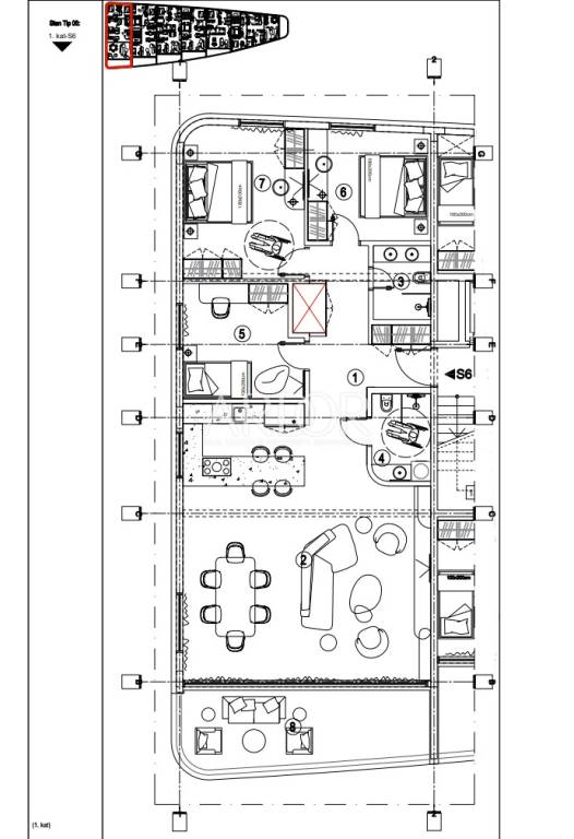 First floor, apartment S6, total area 135.53 m2. It consists of an entrance hall (13.14m2), an open space concept kitchen, dining room and living room (57.06m2) that leads to a 16.09m2 balcony with a beautiful view of the sea, three bedrooms, of which one larger (16.98m2) with its own bathroom (4.25m2), two smaller rooms (12.08 and 11.99m2) and a bathroom (3.94m2).