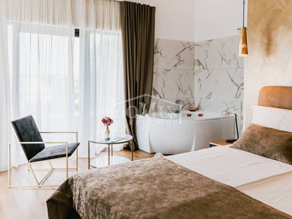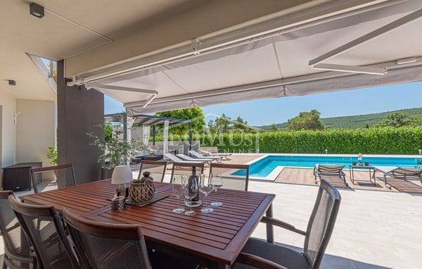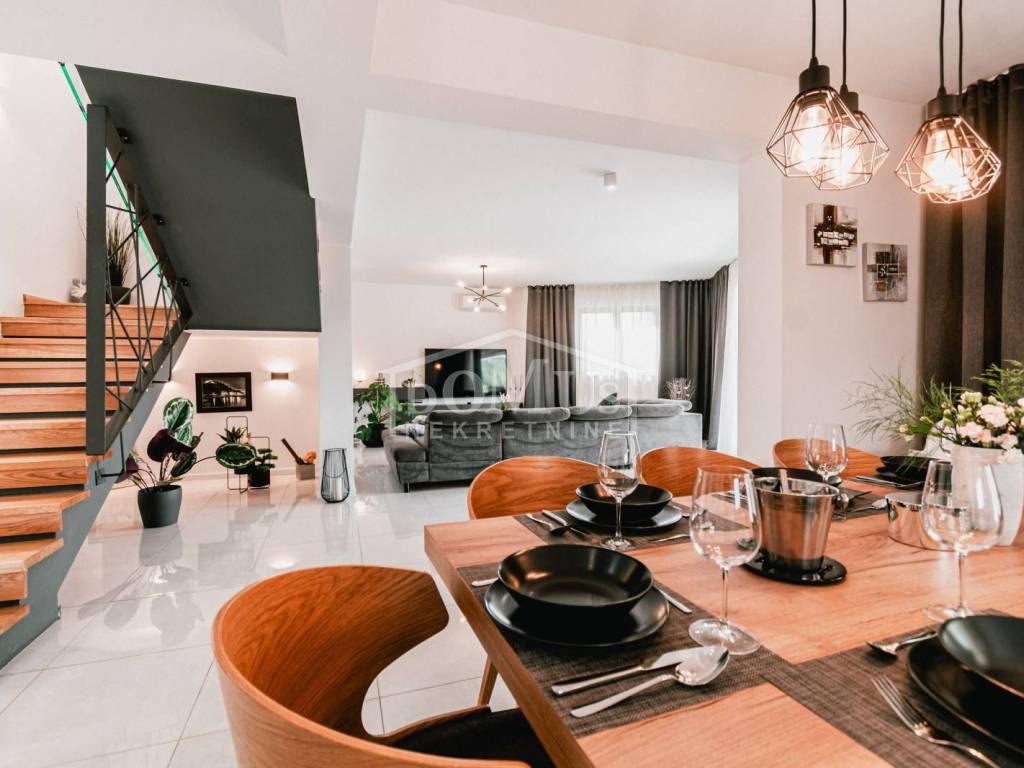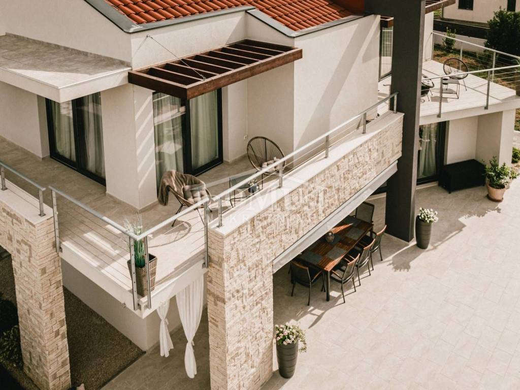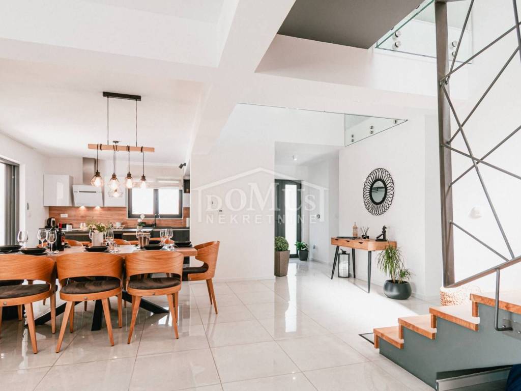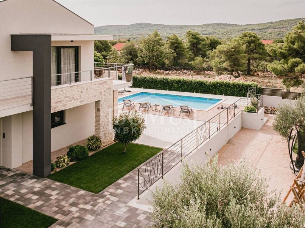 In a quiet environment in Dubrava near Šibenik, there is a Villa, with modern architecture and functional layout with a swimming pool and garage, with a total usable area of 266.13m2, built on a plot of 1,831m2. It consists of a spacious kitchen and dining room and a spacious living room with access to the terrace, toilet, bedrooms, sauna, bathroom, engine room, garage and staircase to the first floor where the hall is located, 3 bedrooms each have their own terrace, 2 of which have their own bathroom and 1 additional separate bathroom. The house is fully furnished, equipped with underfloor heating in all rooms with separate temperature control via a heat pump, air conditioning in each room, video surveillance, solar panels, automatic underground irrigation of the environment, the yard is completely fenced, it also provides plenty of privacy, within the terrace there is a sunbathing area and a swimming pool of 50m2 (5.2mx9.6m), an outdoor barbecue and a mini outdoor kitchen, a basketball court. The center of Šibenik is 4 km away, and the beach is 6 km away.
