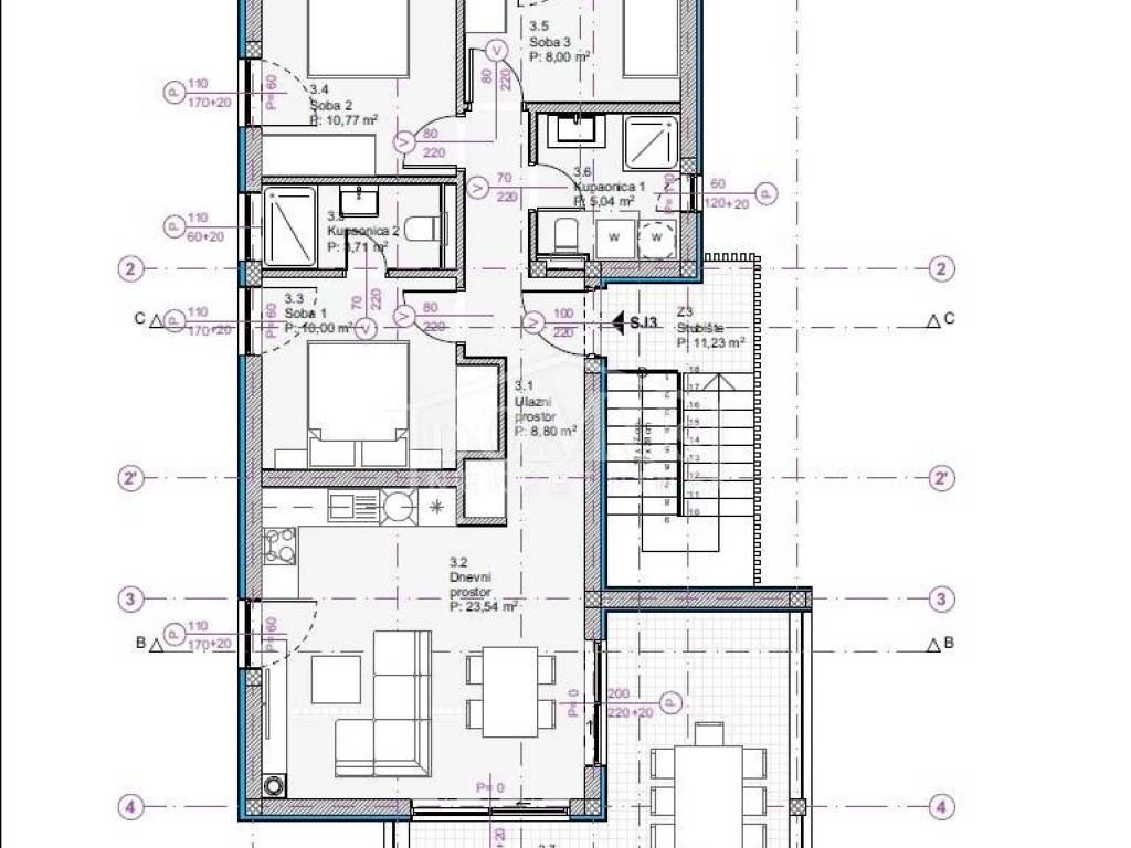 Residential unit "S3" is located on the second floor of the building, facing southeast and offers a sea view. It has a usable area of 89,42 m². The apartment consists of an entrance hall, two bathrooms, 3 bedrooms, an open kitchen with a dining room and a living room with access to a covered terrace of 19,06 m². The apartment has a storage room of 12,66 m². The building is located only 430 m from the beach and 900 m from the city center and all important facilities.