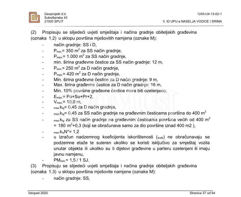 Vodice, very attractive location, building plot of 700 m². According to the urban plan, it is located in the M zone - markings 1.2., the built-up part of the construction area. The plot is located at the intersection of two asphalt roads. The length of the land along the access road is approximately 36 m, and the width is approximately 20 m. Public infrastructure is located along the access road, in the immediate vicinity of the plot. The land is 900 m from the city center and 600 m from the well-maintained Vruje beach. According to the Urban Plan of the City of Vodice - II amendment, a minimum plot area of 350 m² for a detached family house and a minimum plot area of 700 m² for an apartment building are prescribed.
