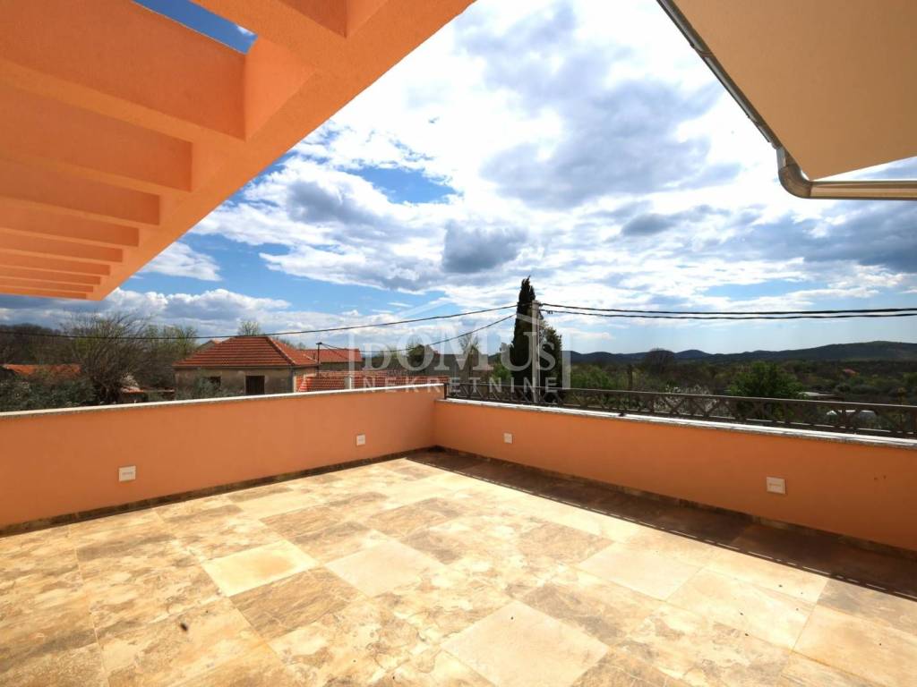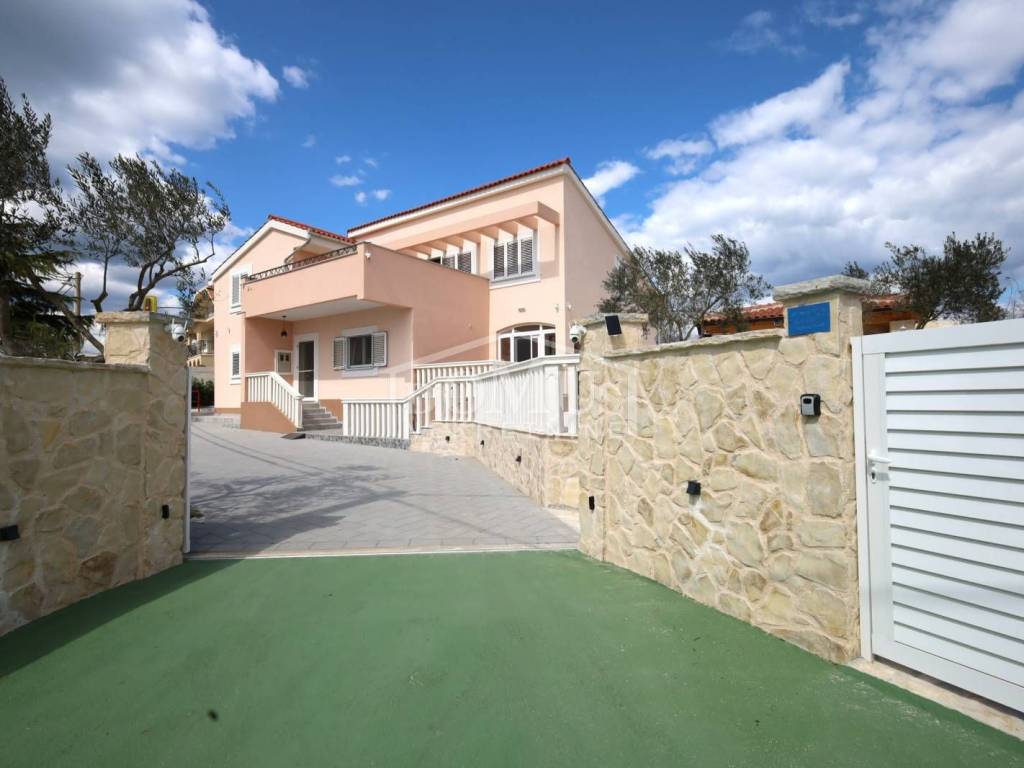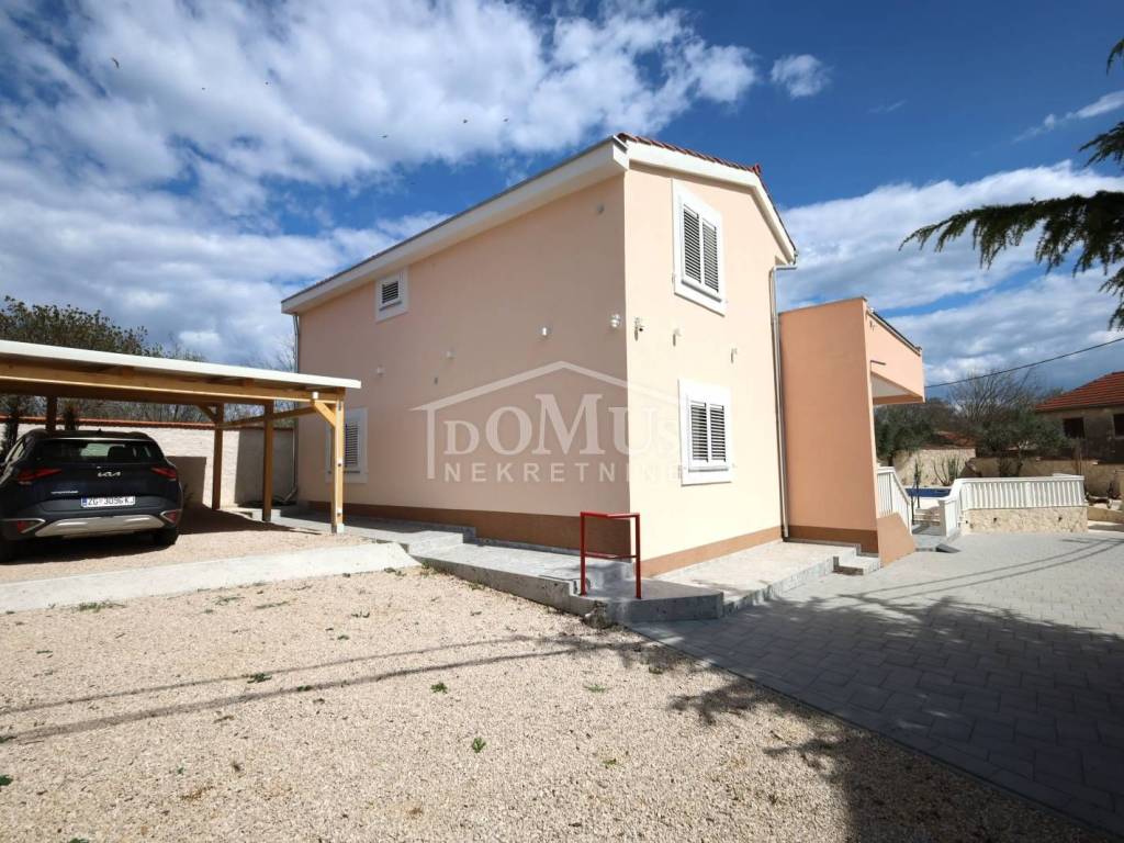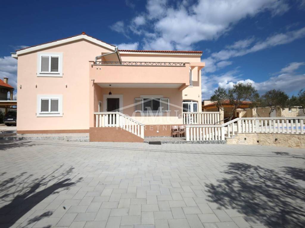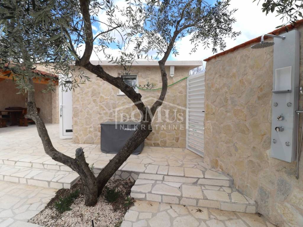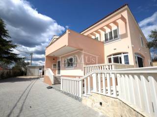 Beautiful house with a swimming pool on a plot of 927m2, in a quiet location. The house is spread over two floors: ground floor + first floor with a total of 216.60 m2 of usable area. On the ground floor there is an apartment with 119.84 m2 consisting of a kitchen with a dining room, a living room with access to a covered glazed terrace, two bedrooms, one of which has its own bathroom and a separate bathroom. An internal staircase leads to the first floor where there is a second apartment with a total of 96.76 m2 of usable area consisting of internal stairs, a hallway, two bedrooms, two bathrooms, a kitchen with a dining room and a comfortable living room with access to a large uncovered terrace. The yard is fenced, the property is adapted for people with disabilities, and has video surveillance. An integral part of this beautiful property also includes a heated swimming pool 10m x 4m, a sunbathing area, a gazebo behind which there is a wine cellar, and next to the gazebo there is an outdoor fireplace, a machine room and a storage room. The yard is beautifully decorated with Mediterranean plants, while the interior is of modern design. Behind the house there is a garden house and covered parking. The distance to the beach in Pirovac is 14 km.