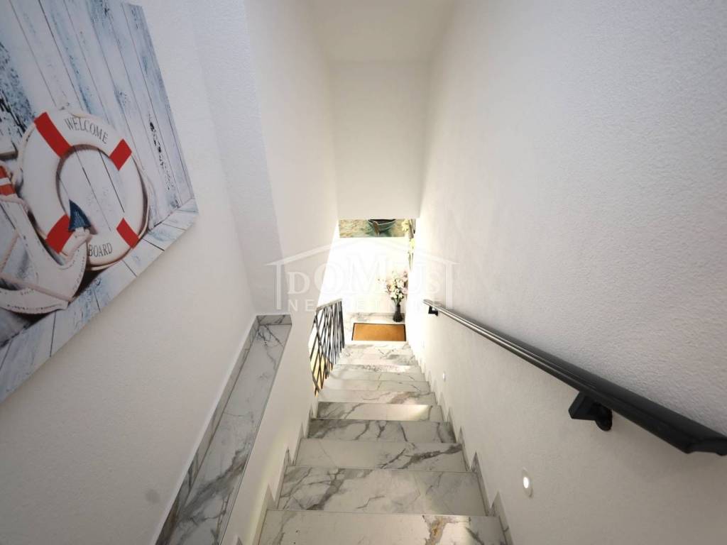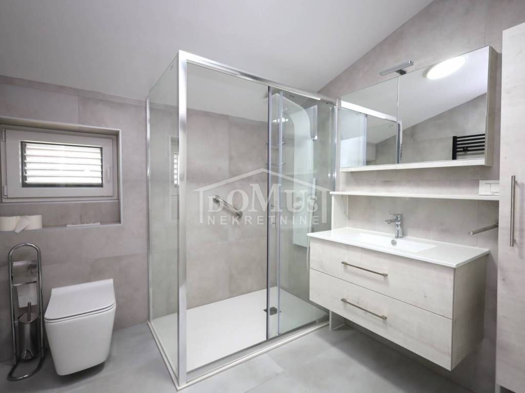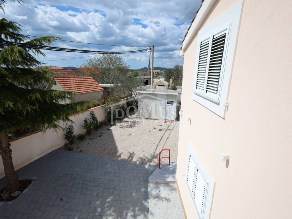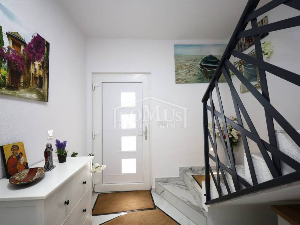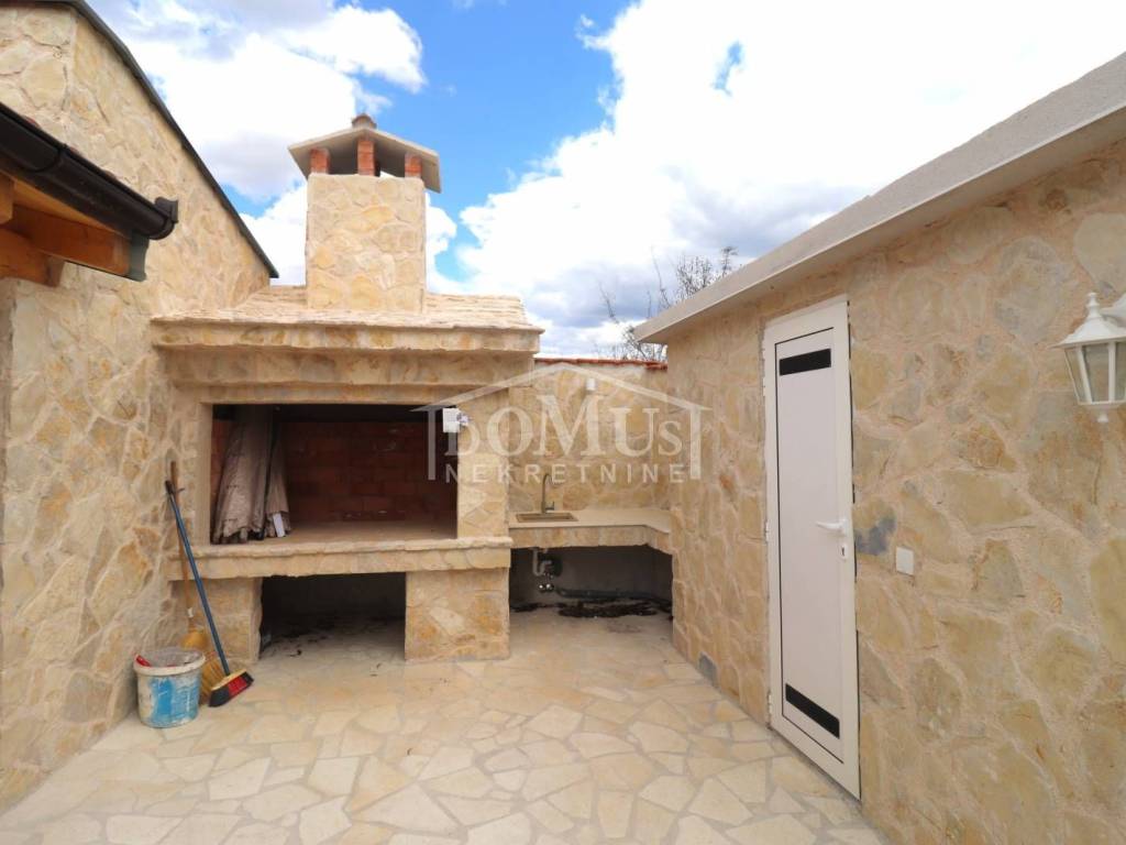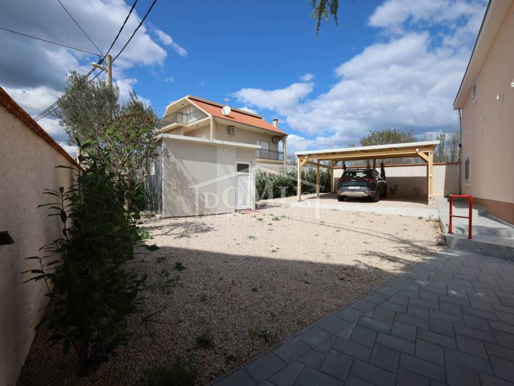 Beautiful house with a swimming pool on a plot of 927m2, in a quiet location. The house is spread over two floors: ground floor + first floor with a total of 216.60 m2 of usable area. On the ground floor there is an apartment with 119.84 m2 consisting of a kitchen with a dining room, a living room with access to a covered glazed terrace, two bedrooms, one of which has its own bathroom and a separate bathroom. An internal staircase leads to the first floor where there is a second apartment with a total of 96.76 m2 of usable area consisting of internal stairs, a hallway, two bedrooms, two bathrooms, a kitchen with a dining room and a comfortable living room with access to a large uncovered terrace. The yard is fenced, the property is adapted for people with disabilities, and has video surveillance. An integral part of this beautiful property also includes a heated swimming pool 10m x 4m, a sunbathing area, a gazebo behind which there is a wine cellar, and next to the gazebo there is an outdoor fireplace, a machine room and a storage room. The yard is beautifully decorated with Mediterranean plants, while the interior is of modern design. Behind the house there is a garden house and covered parking. The distance to the beach in Pirovac is 14 km.